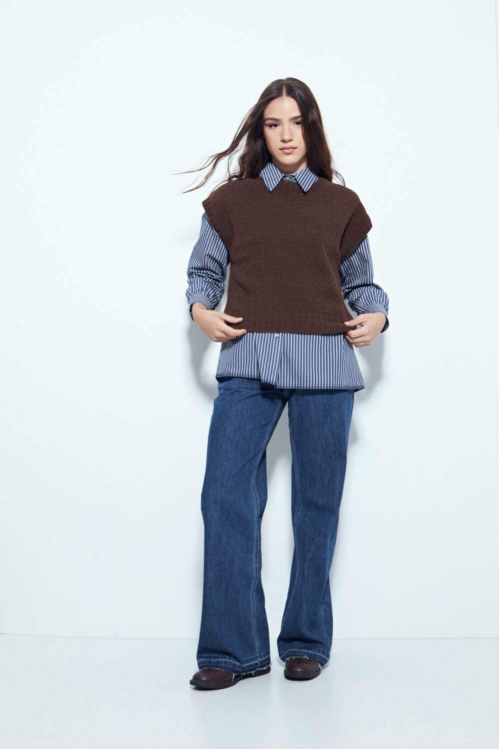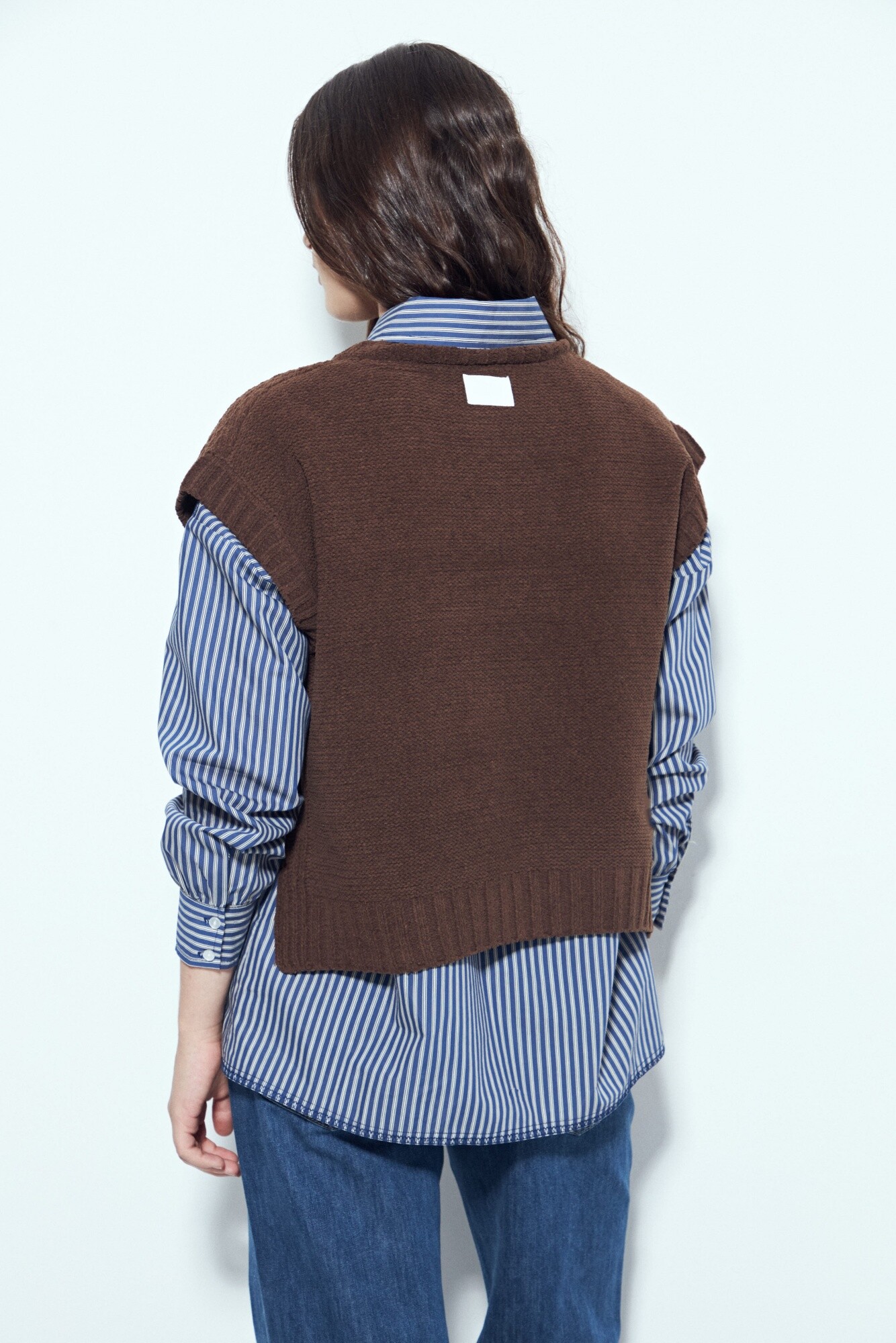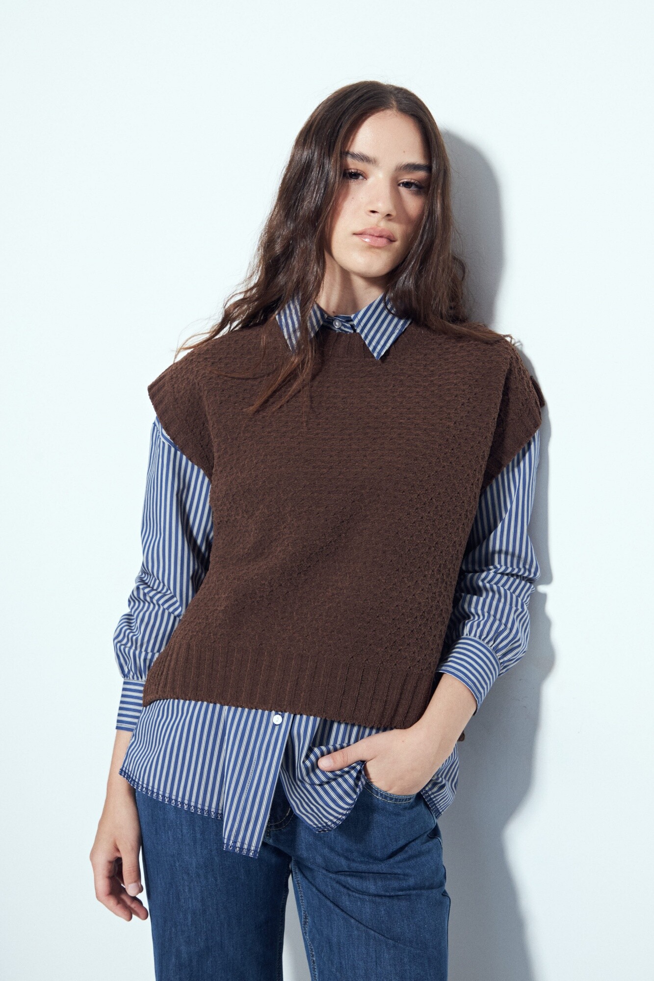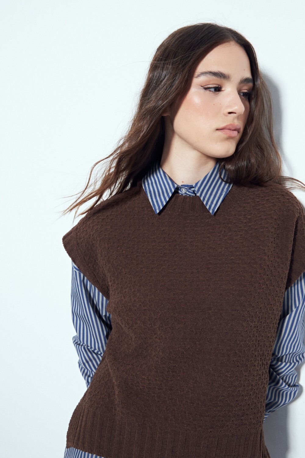 Chaleco tejido sin mangas de silueta limpia y hombros levemente estructurados, un diseño que suma textura y definición al look sin perder versatilidad. Su tejido aporta cuerpo y un acabado prolijo, ideal para usar solo o superpuesto sobre camisas y blusas, logrando un estilismo actual y equilibrado. Una prenda en tendencia, clave para elevar cualquier look y adaptarse tanto a outfits urbanos como a propuestas más formales.