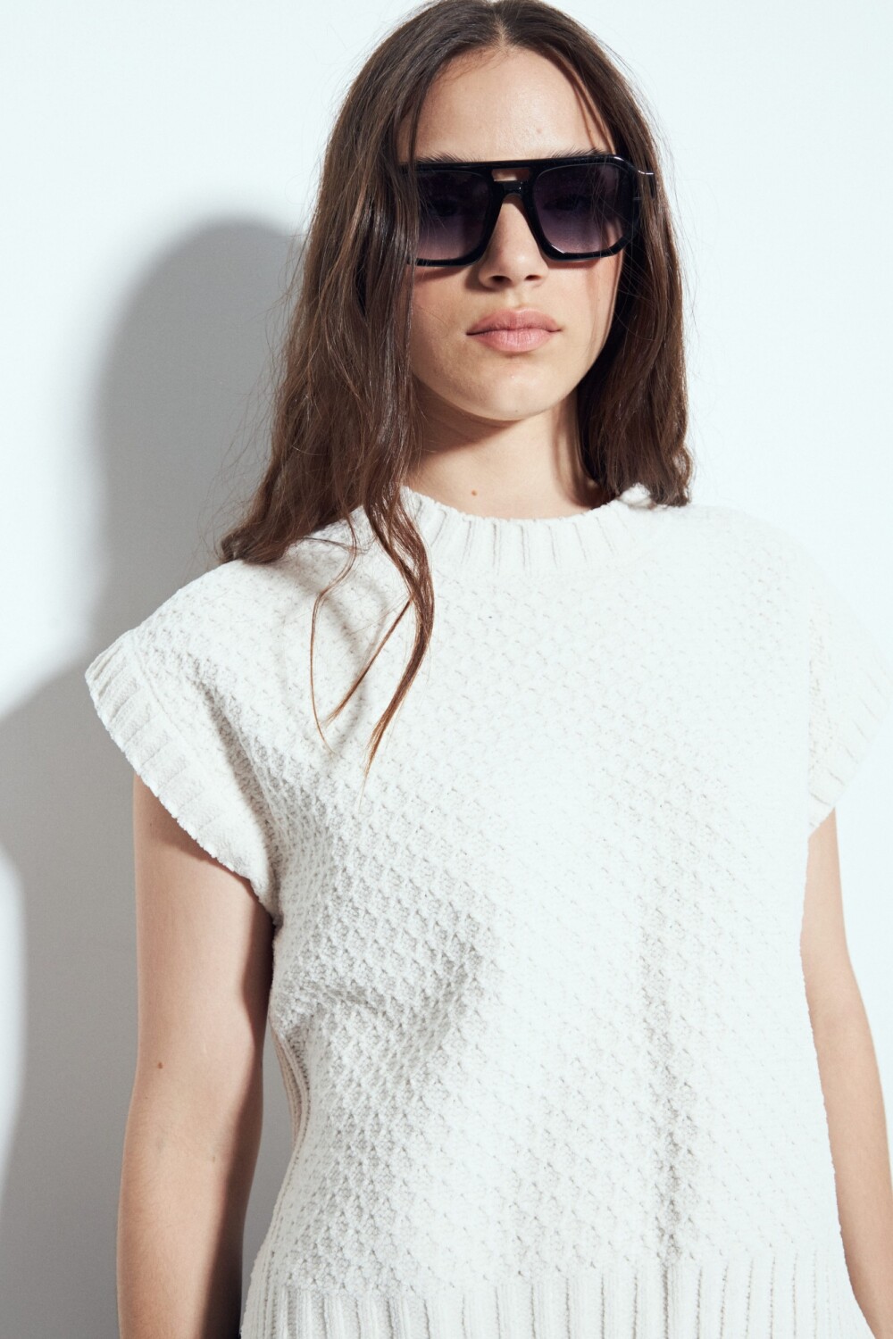 Chaleco tejido sin mangas de silueta limpia y hombros levemente estructurados, un diseño que suma textura y definición al look sin perder versatilidad. Su tejido aporta cuerpo y un acabado prolijo, ideal para usar solo o superpuesto sobre camisas y blusas, logrando un estilismo actual y equilibrado. Una prenda en tendencia, clave para elevar cualquier look y adaptarse tanto a outfits urbanos como a propuestas más formales.
