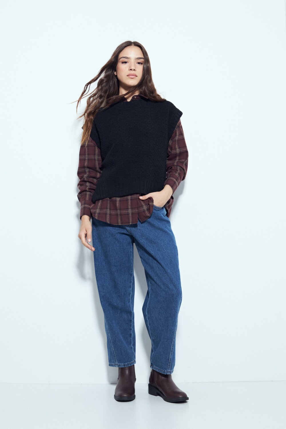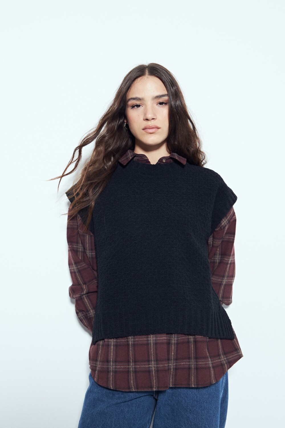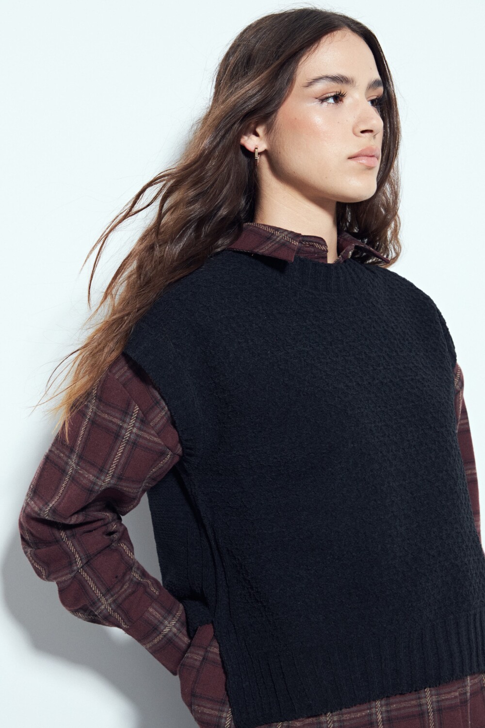 Chaleco tejido sin mangas de silueta limpia y hombros levemente estructurados, un diseño que suma textura y definición al look sin perder versatilidad. Su tejido aporta cuerpo y un acabado prolijo, ideal para usar solo o superpuesto sobre camisas y blusas, logrando un estilismo actual y equilibrado. Una prenda en tendencia, clave para elevar cualquier look y adaptarse tanto a outfits urbanos como a propuestas más formales.
