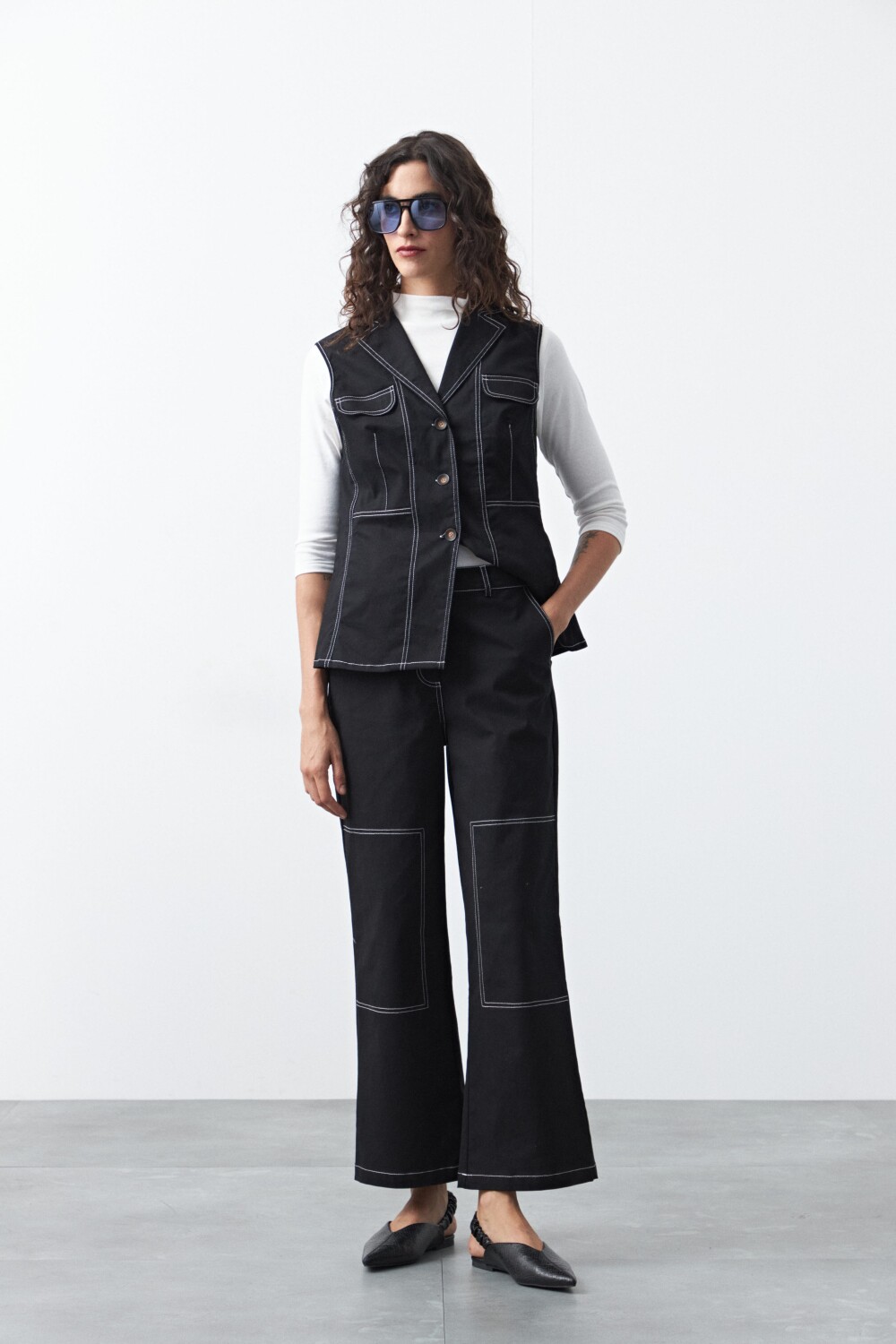 Chaleco con pespuntes a contratono de inspiración utilitaria, una pieza que combina estructura y diseño en una silueta femenina y actual. Su corte sastrero sin mangas, con solapa y botones frontales, aporta un aire sofisticado mientras que los pespuntes marcados refuerzan su impronta moderna.