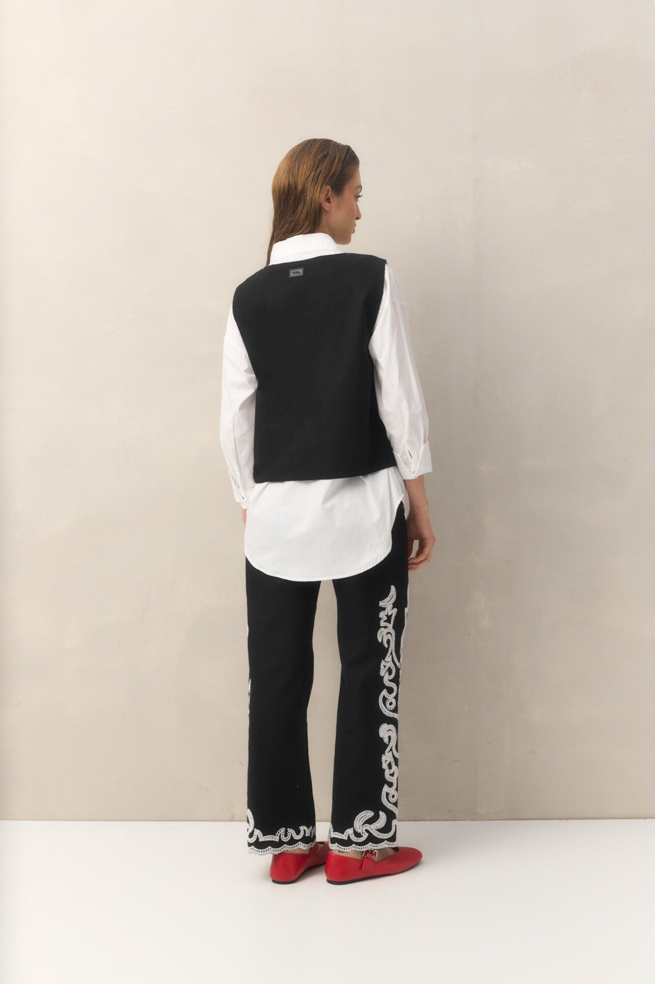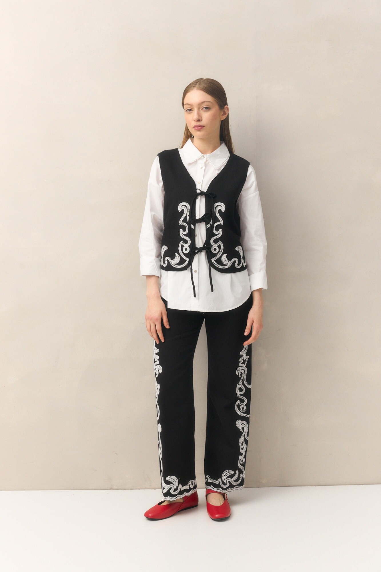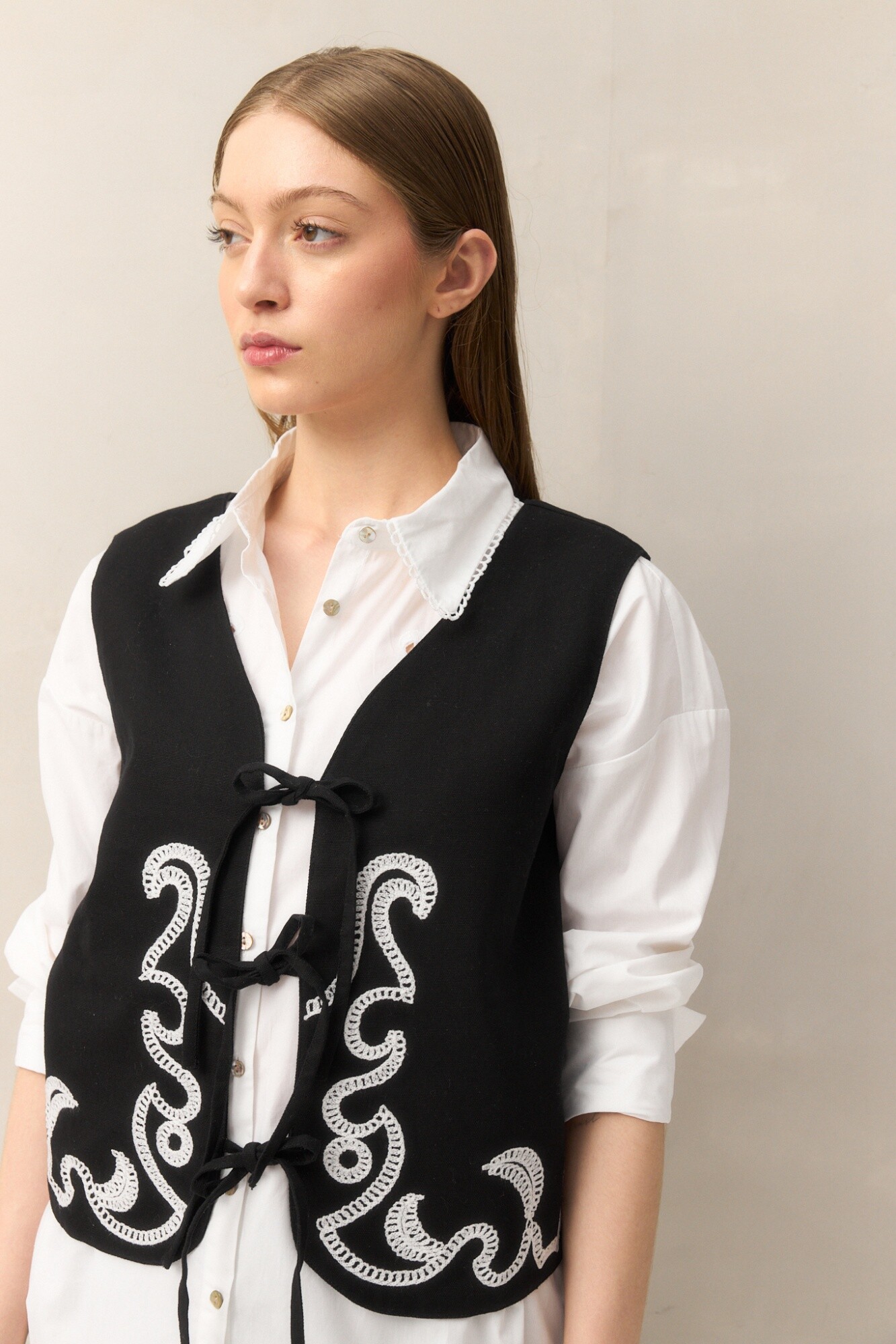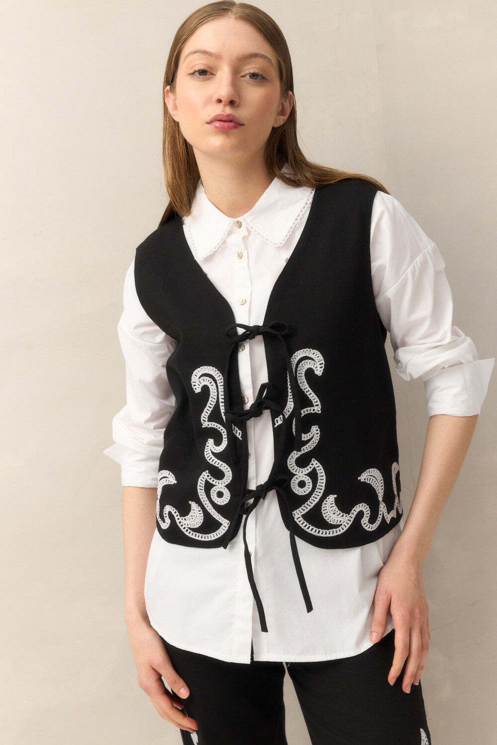 Un diseño que fusiona lo artesanal con lo contemporáneo. Este chaleco de algodón presenta bordados inspirados en motivos étnicos, que recorren el frente y el ruedo con un efecto visual sofisticado. Los lazos frontales con cinta de algodón aportan un aire boho chic, mientras su corte recto y escote en “V” estilizan la silueta.