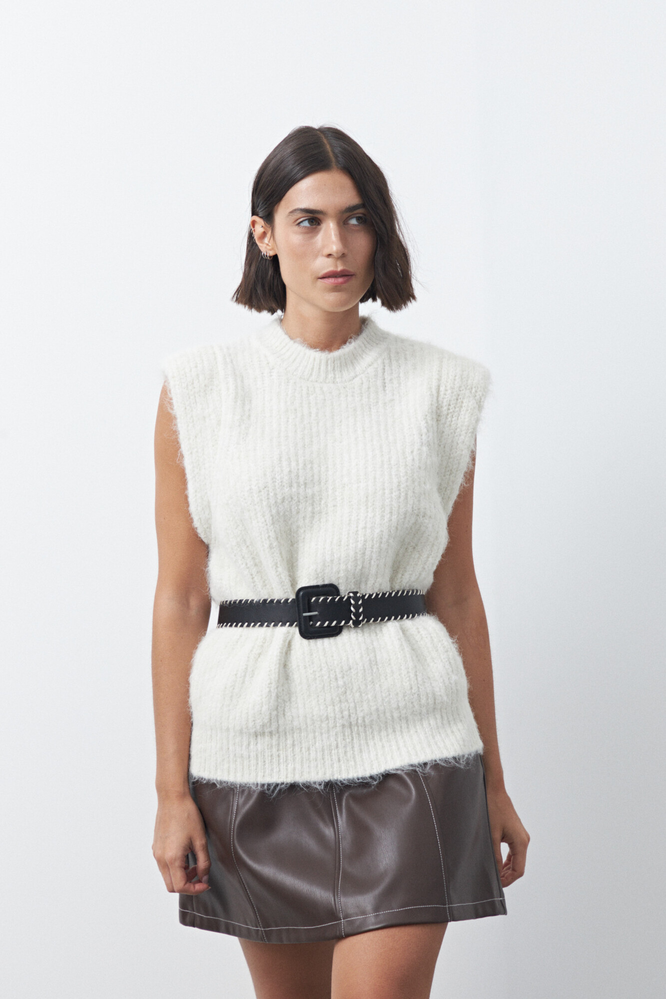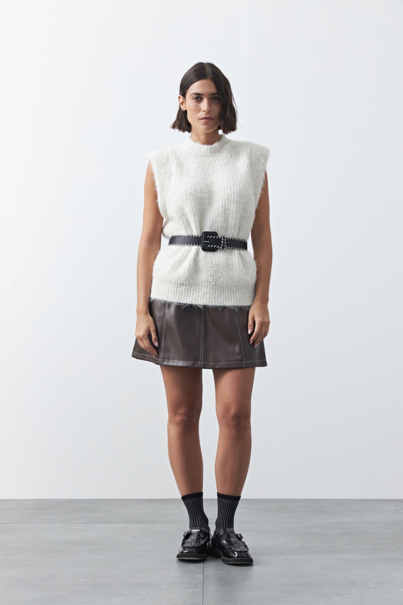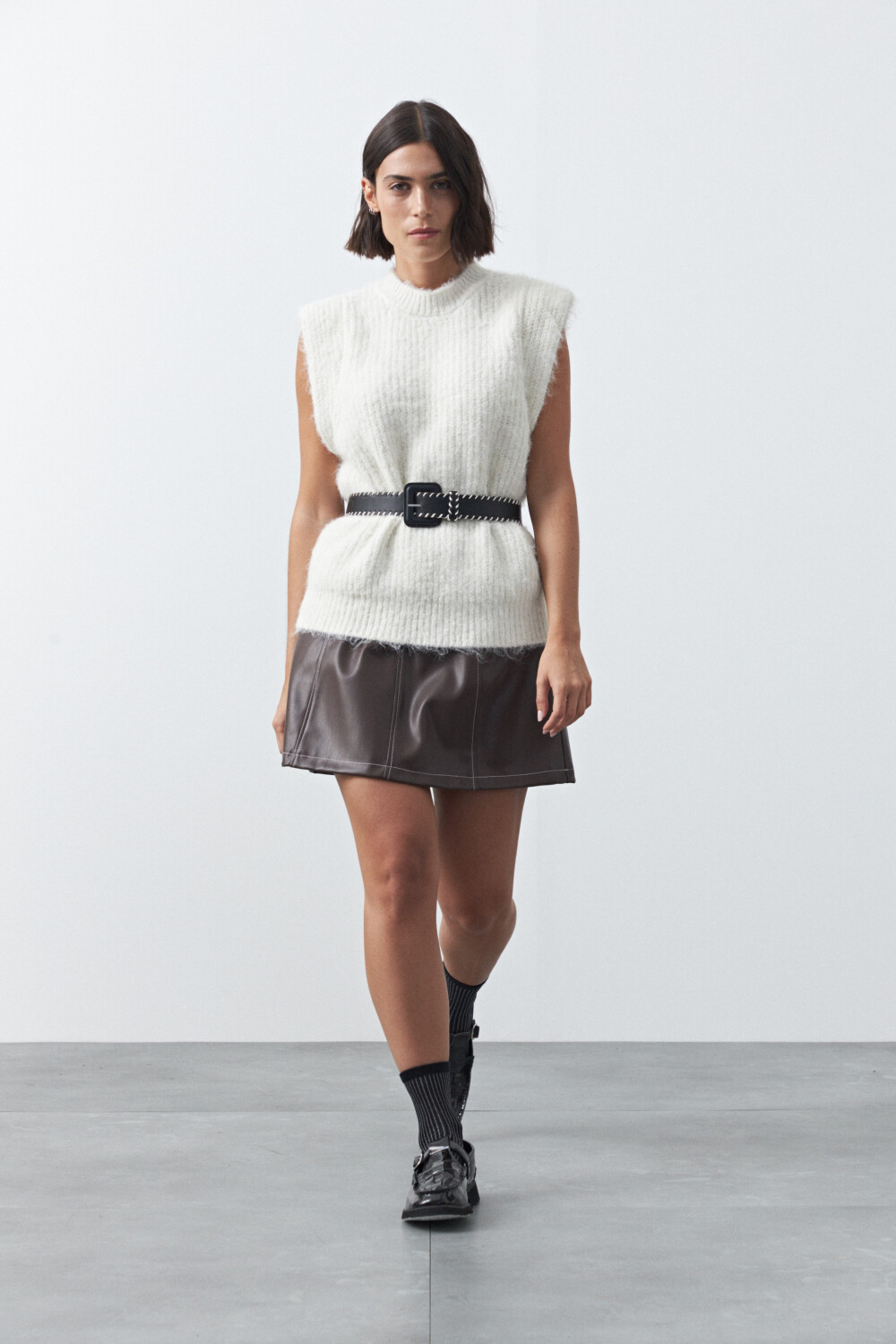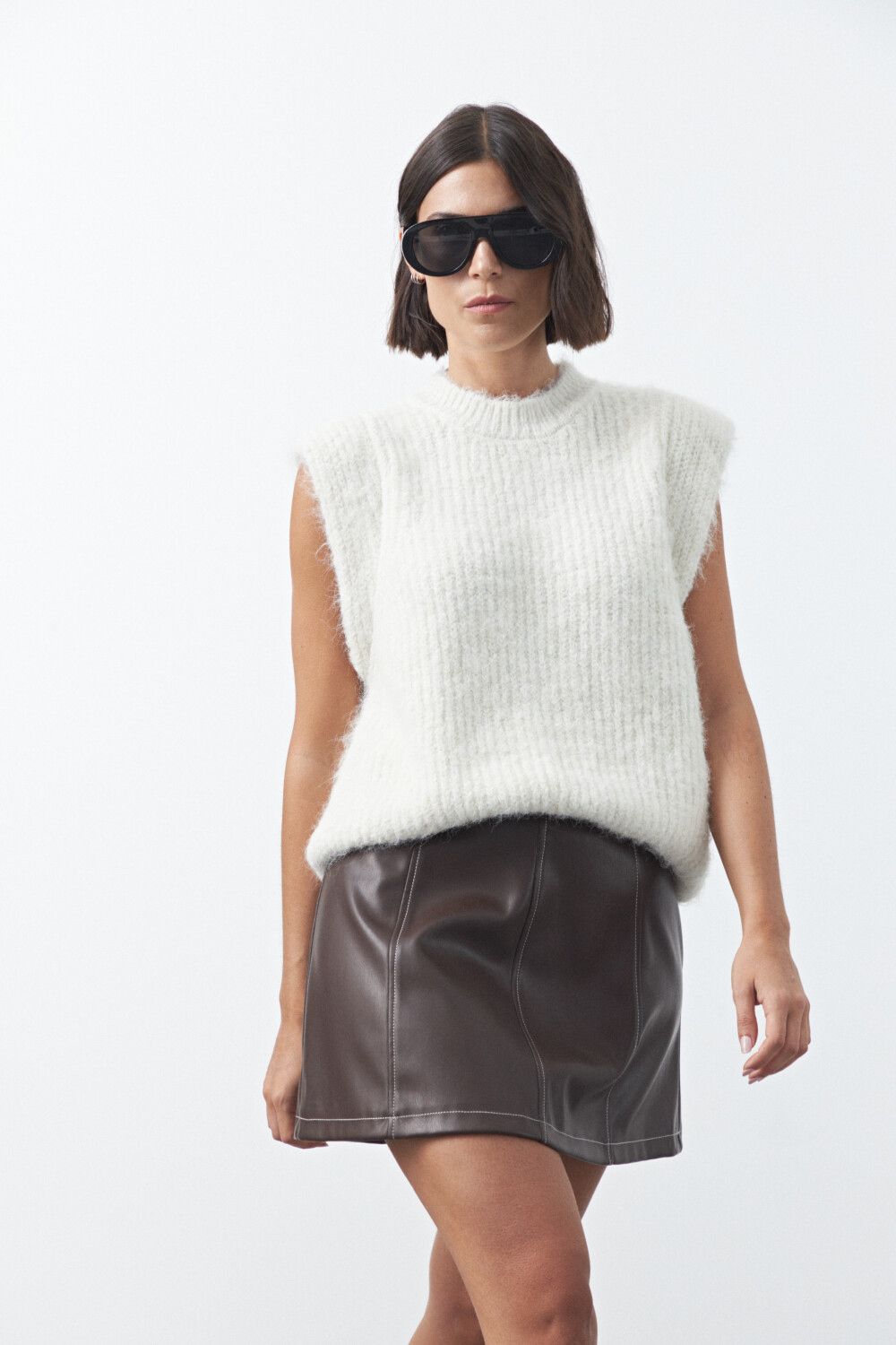 Chaleco tejido de punto con textura levemente afelpada que aporta abrigo y suavidad al tacto. Su silueta relajada y hombros marcados lo convierten en una prenda versátil, ideal para superponer sobre camisas o remeras y lograr un look en capas moderno y funcional.