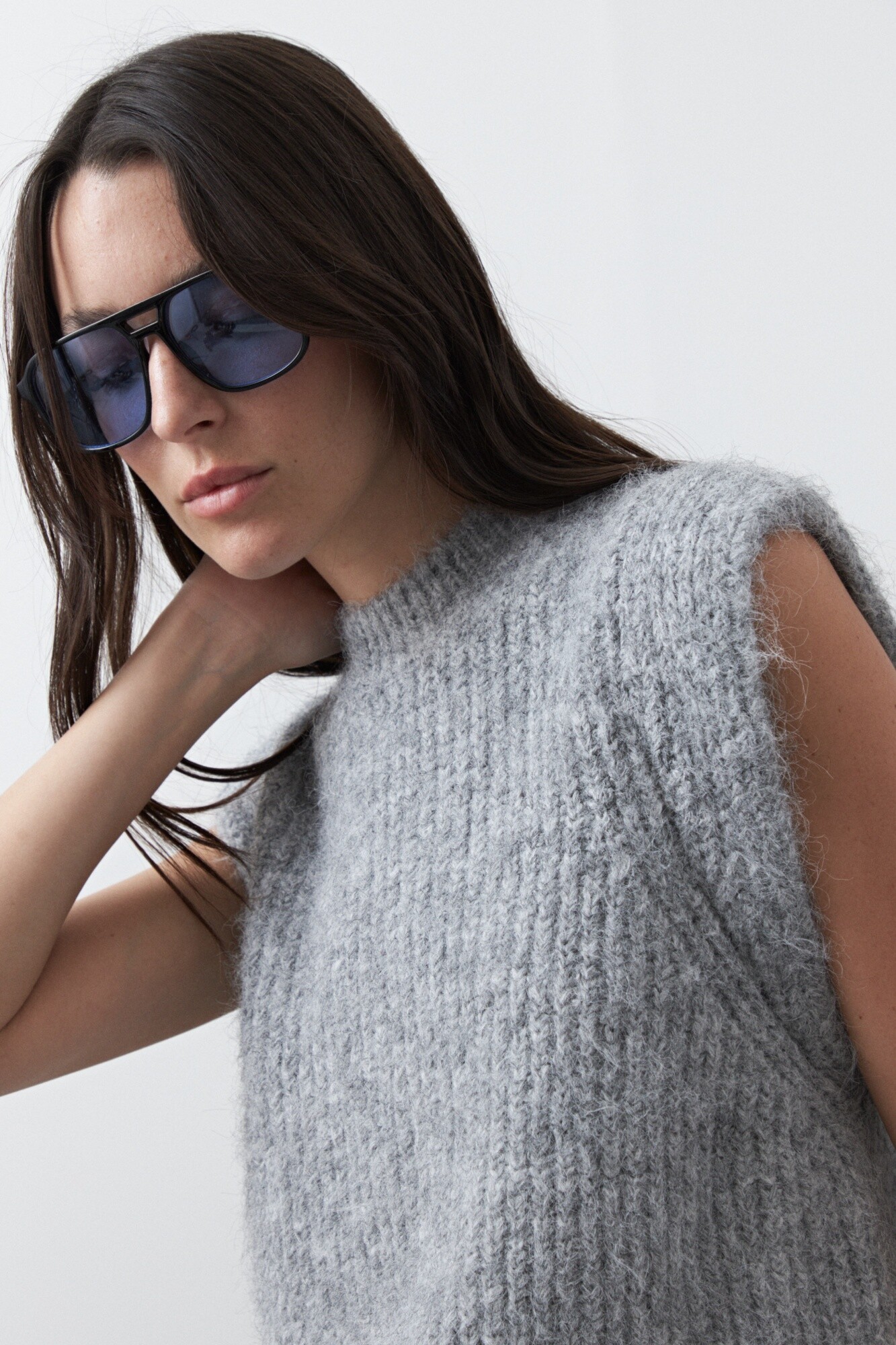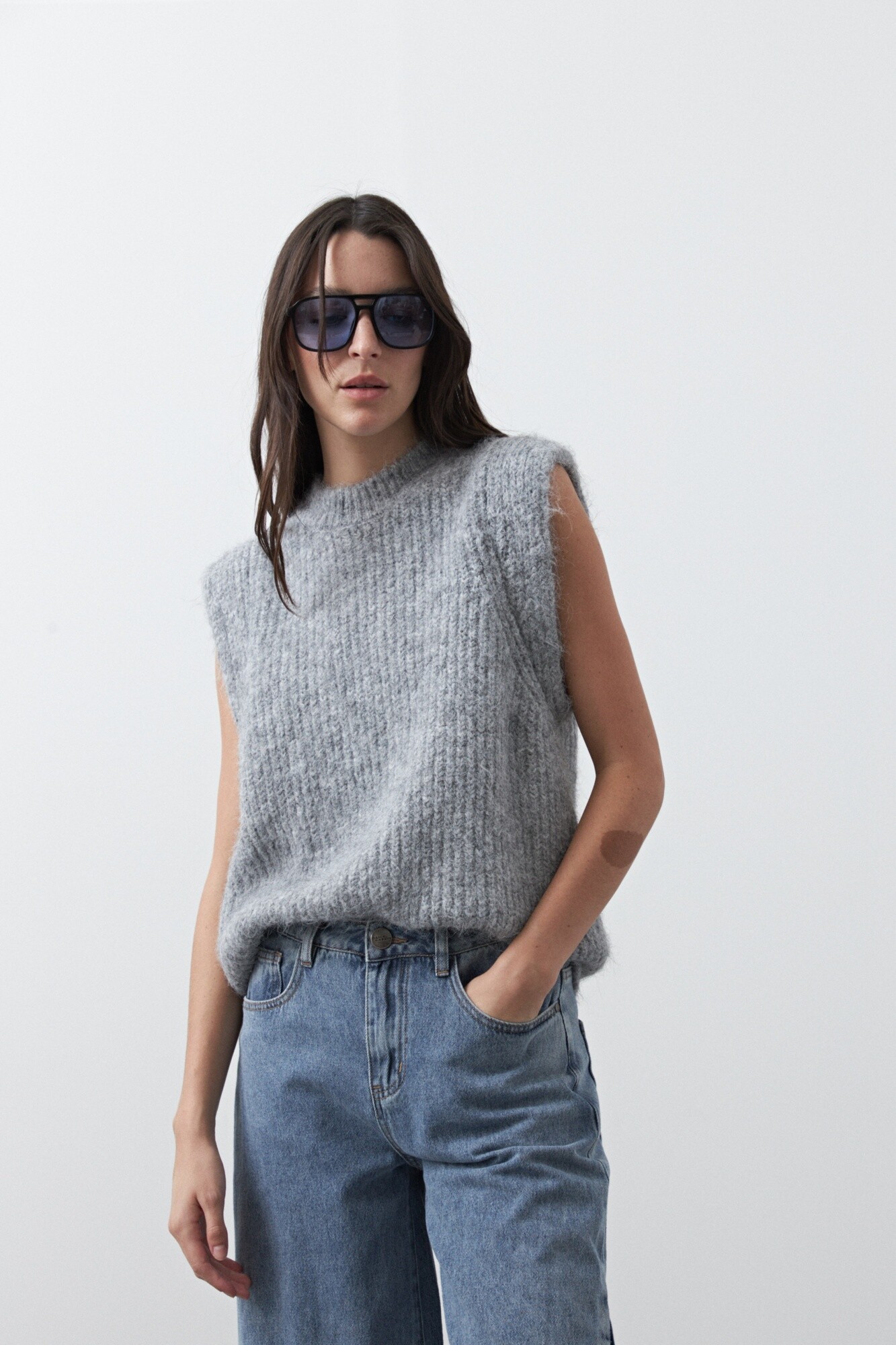 Chaleco tejido de punto con textura levemente afelpada que aporta abrigo y suavidad al tacto. Su silueta relajada y hombros marcados lo convierten en una prenda versátil, ideal para superponer sobre camisas o remeras y lograr un look en capas moderno y funcional.