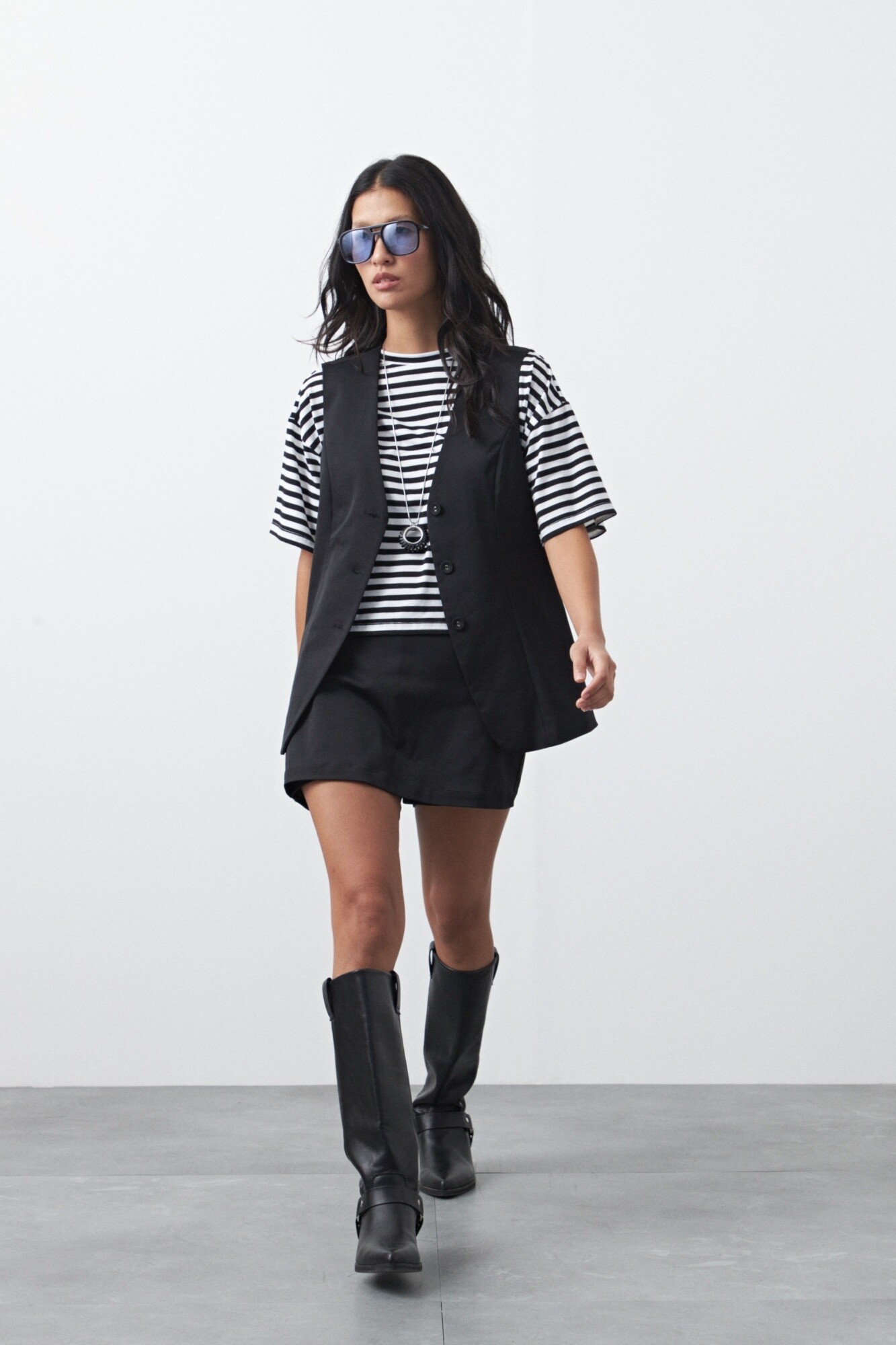 El tejido aporta cuerpo y una caída firme, manteniendo la forma a lo largo del día. Ideal para armar conjuntos de impacto, ya sea con mini para un guiño más trendy o con pantalón sastrero para una propuesta más sofisticada y urbana. Una prenda clave para elevar cualquier look con un toque de actitud.
