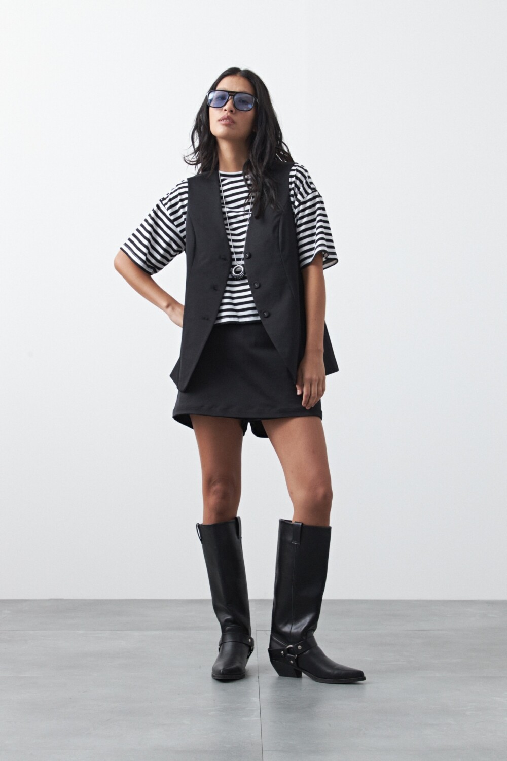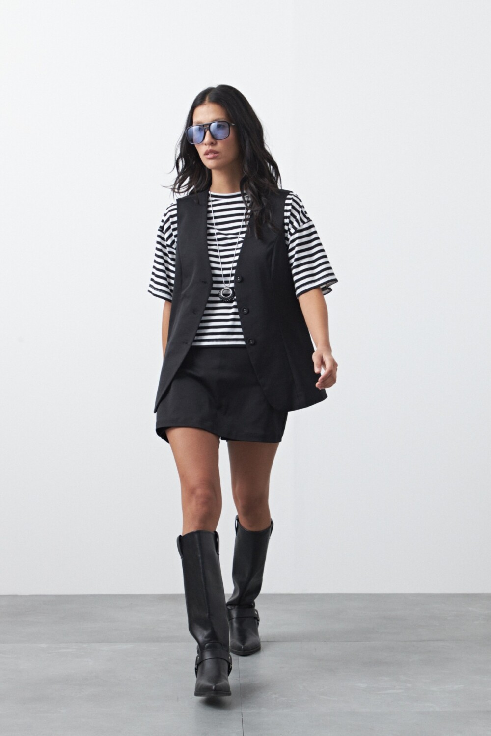 Chaleco sastrero de silueta recta y escote en V, una pieza que reinterpreta la sastrería clásica con una impronta actual y versátil. Su estructura limpia, con botones al frente y líneas definidas, estiliza la figura y permite llevarlo solo como top o superpuesto para un look en capas más elaborado.