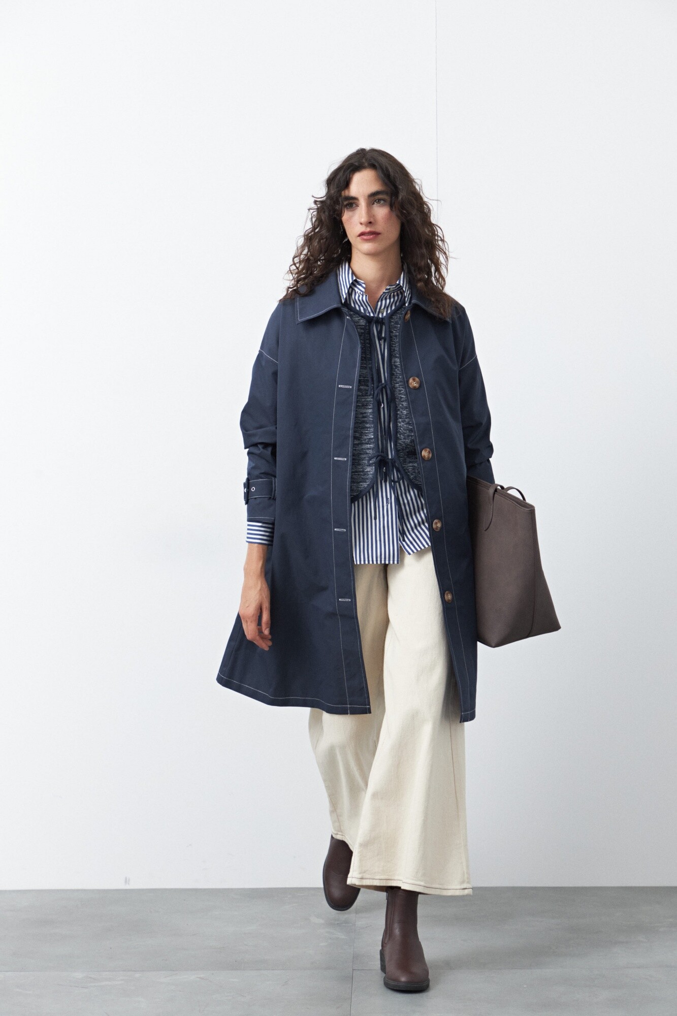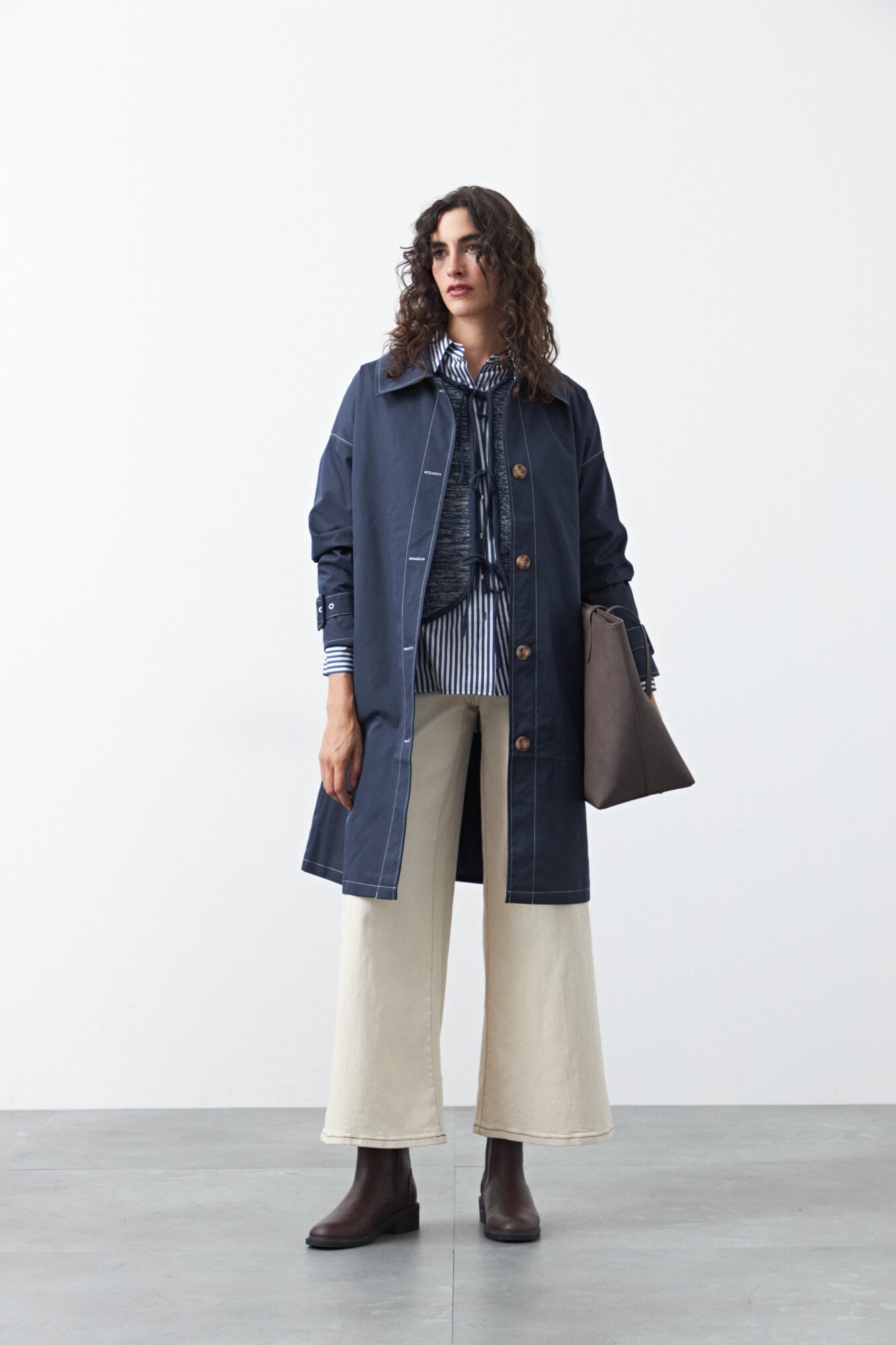 El tejido de punto liviano presenta un efecto jaspeado que enriquece visualmente la prenda, mientras que los lazos frontales permiten regular la apertura y refuerzan su impronta femenina y artesanal. El calce recto y relajado facilita el juego de capas, adaptándose tanto a looks urbanos como a propuestas más pulidas.