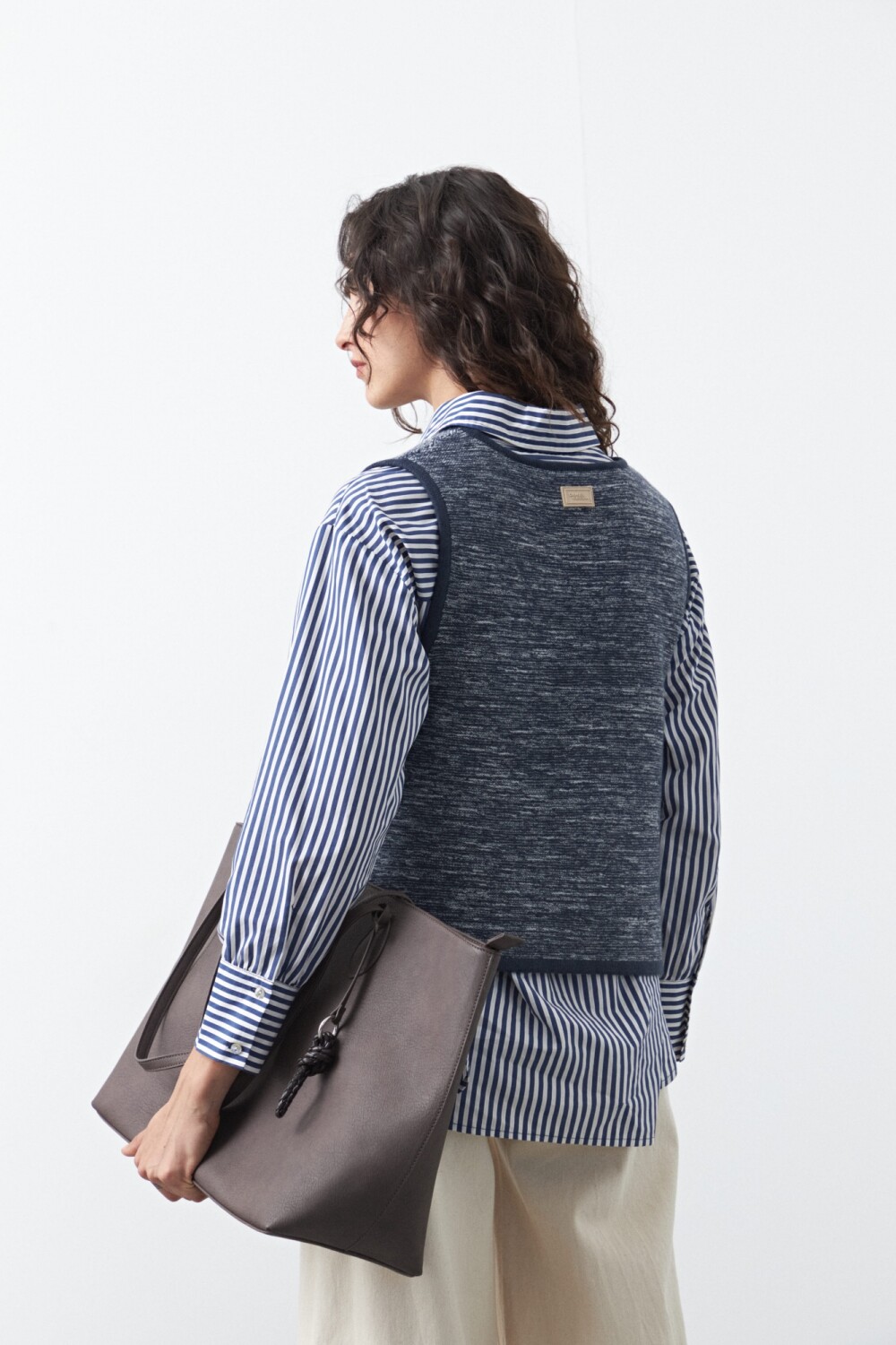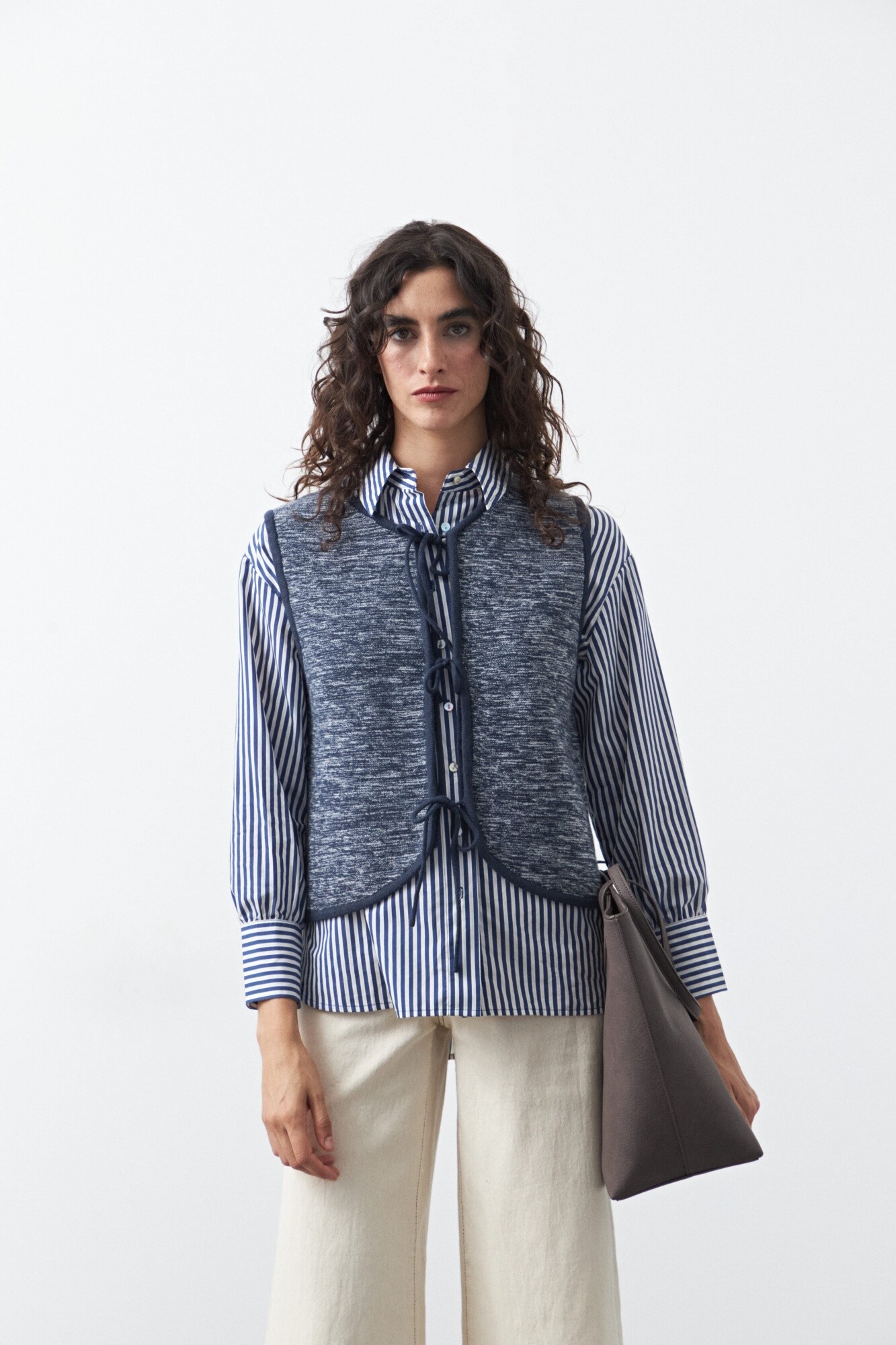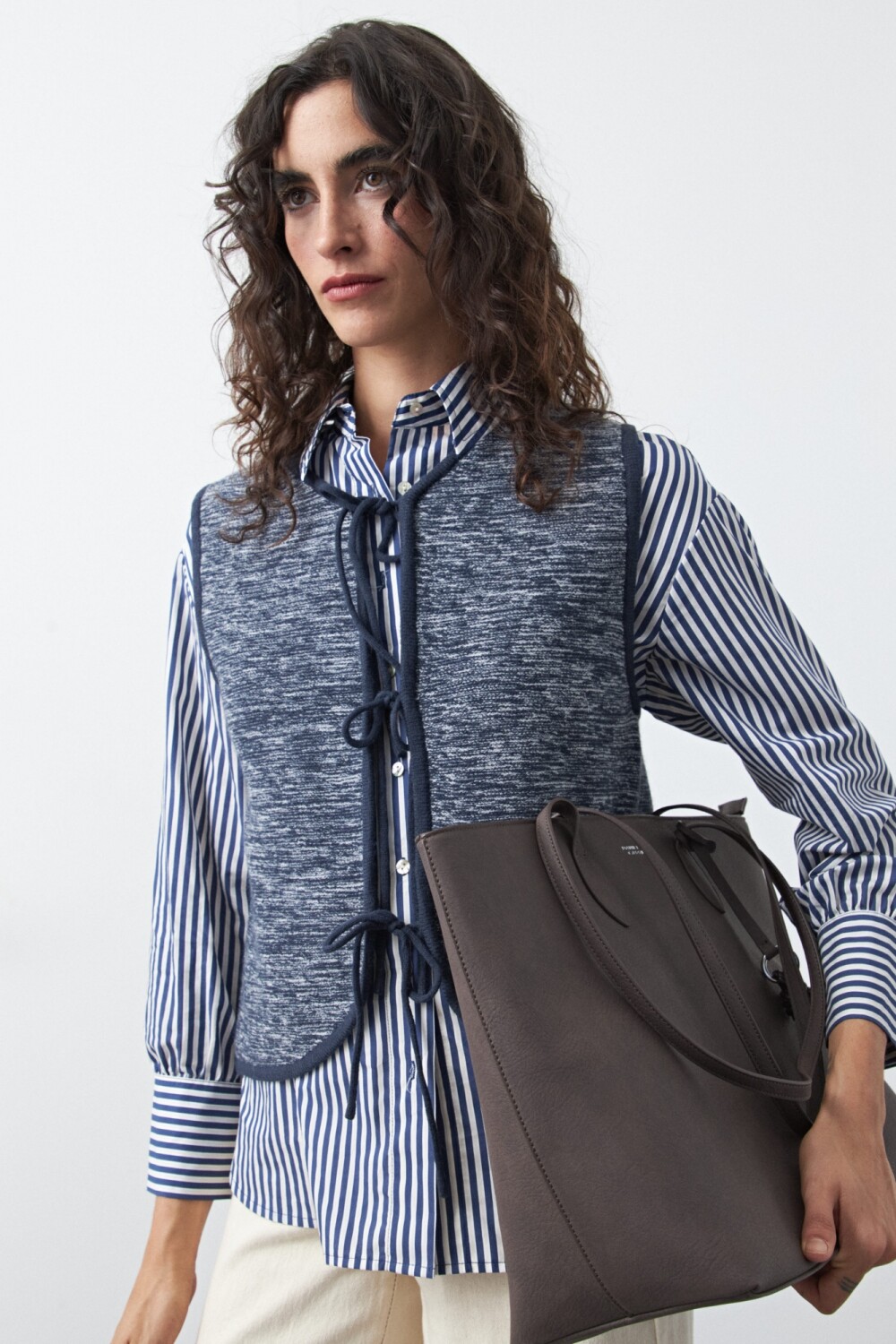 Chaleco tejido con lazos frontales, una pieza versátil que suma textura y profundidad a cualquier estilismo. Su diseño sin mangas y escote redondeado lo convierte en el complemento ideal para superponer sobre camisas, blusas o vestidos, aportando un guiño clásico con aire actual.