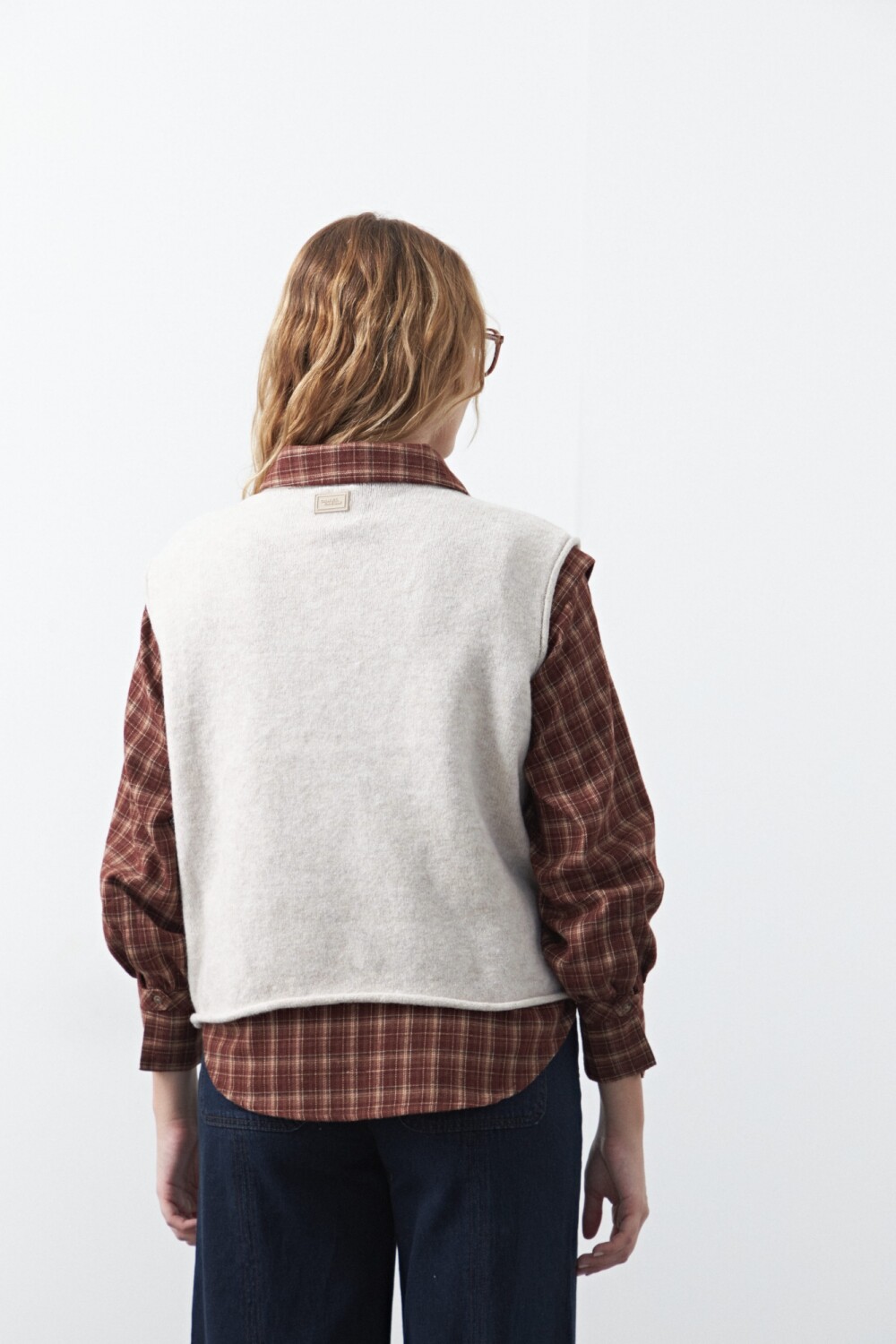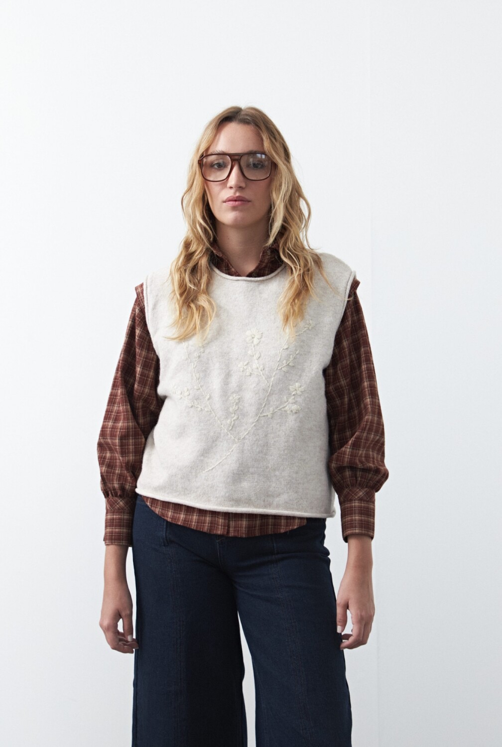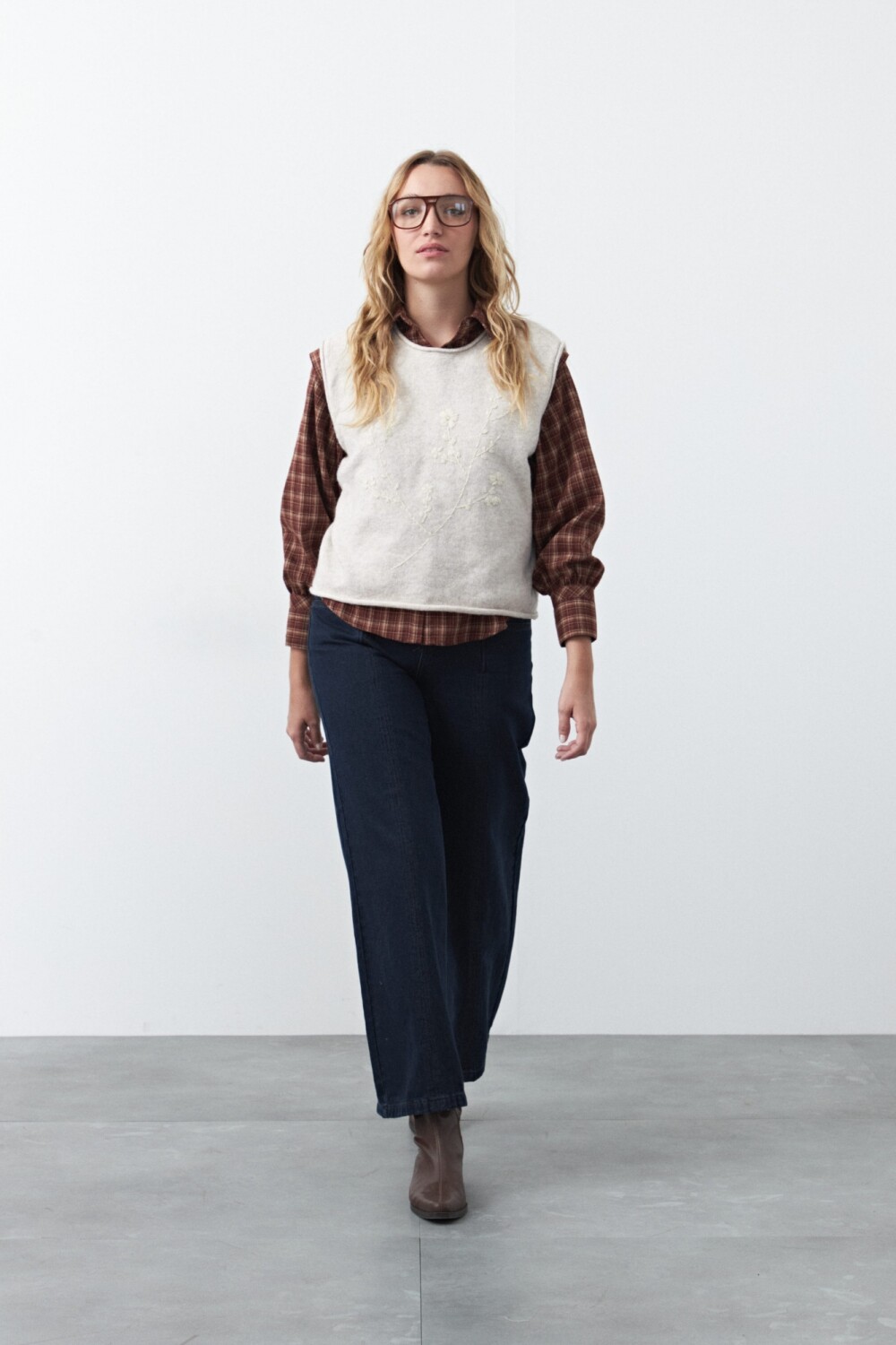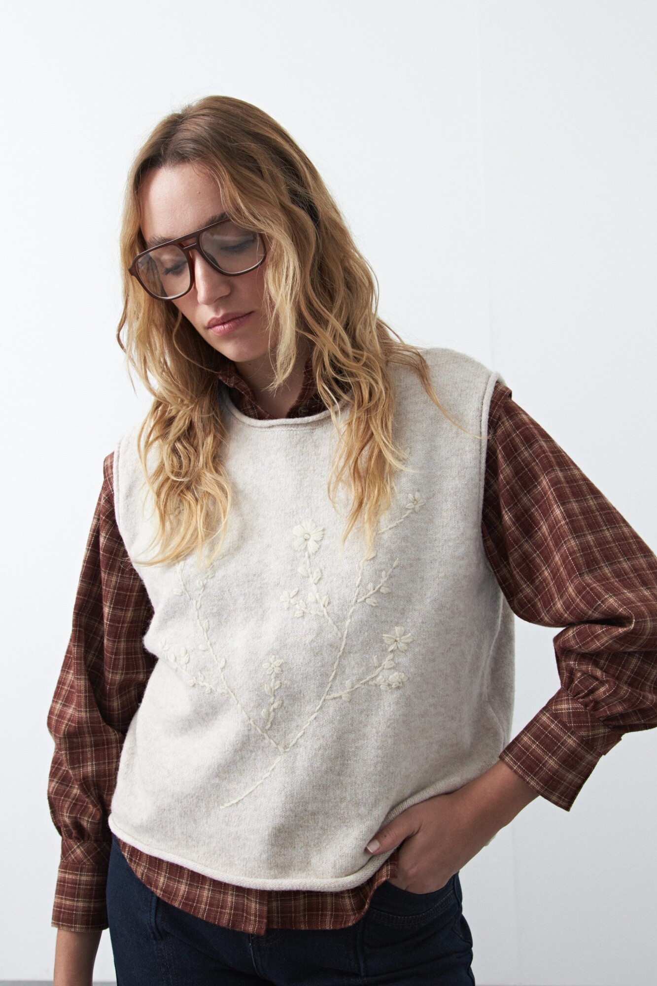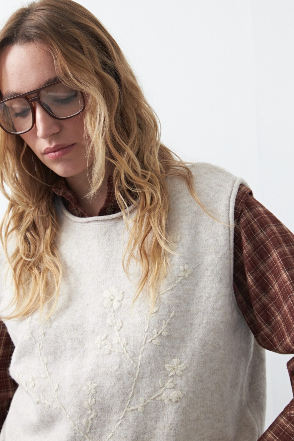 Chaleco tejido con bordado floral que aporta textura y un detalle artesanal sutil, ideal para sumar interés a looks en capas. Su diseño sin mangas y de calce relajado lo convierte en una prenda versátil, perfecta para combinar con camisas y lograr un estilo cálido con impronta en tendencia.