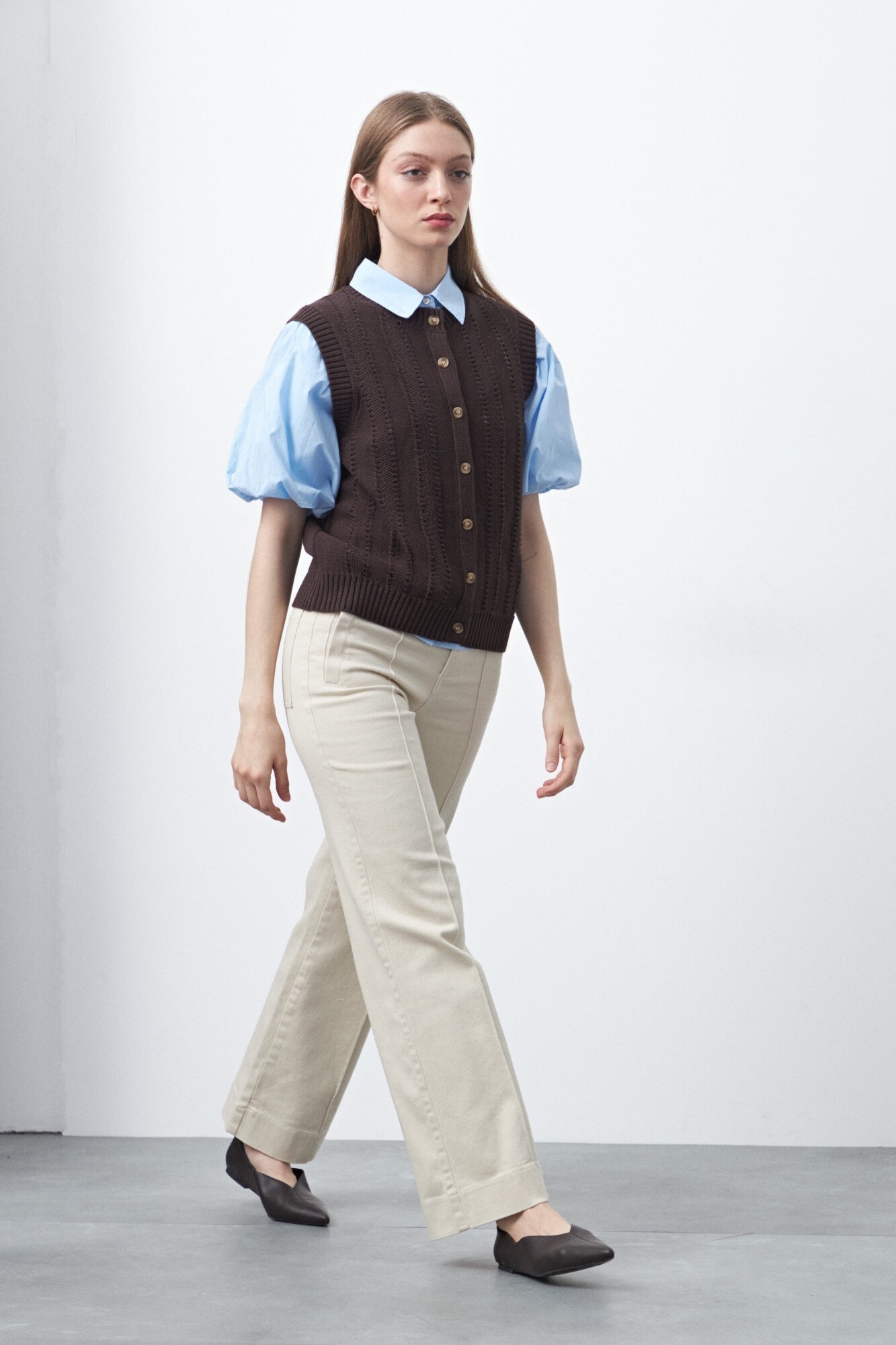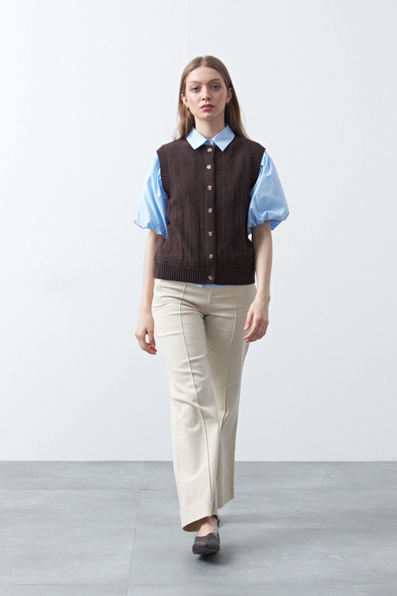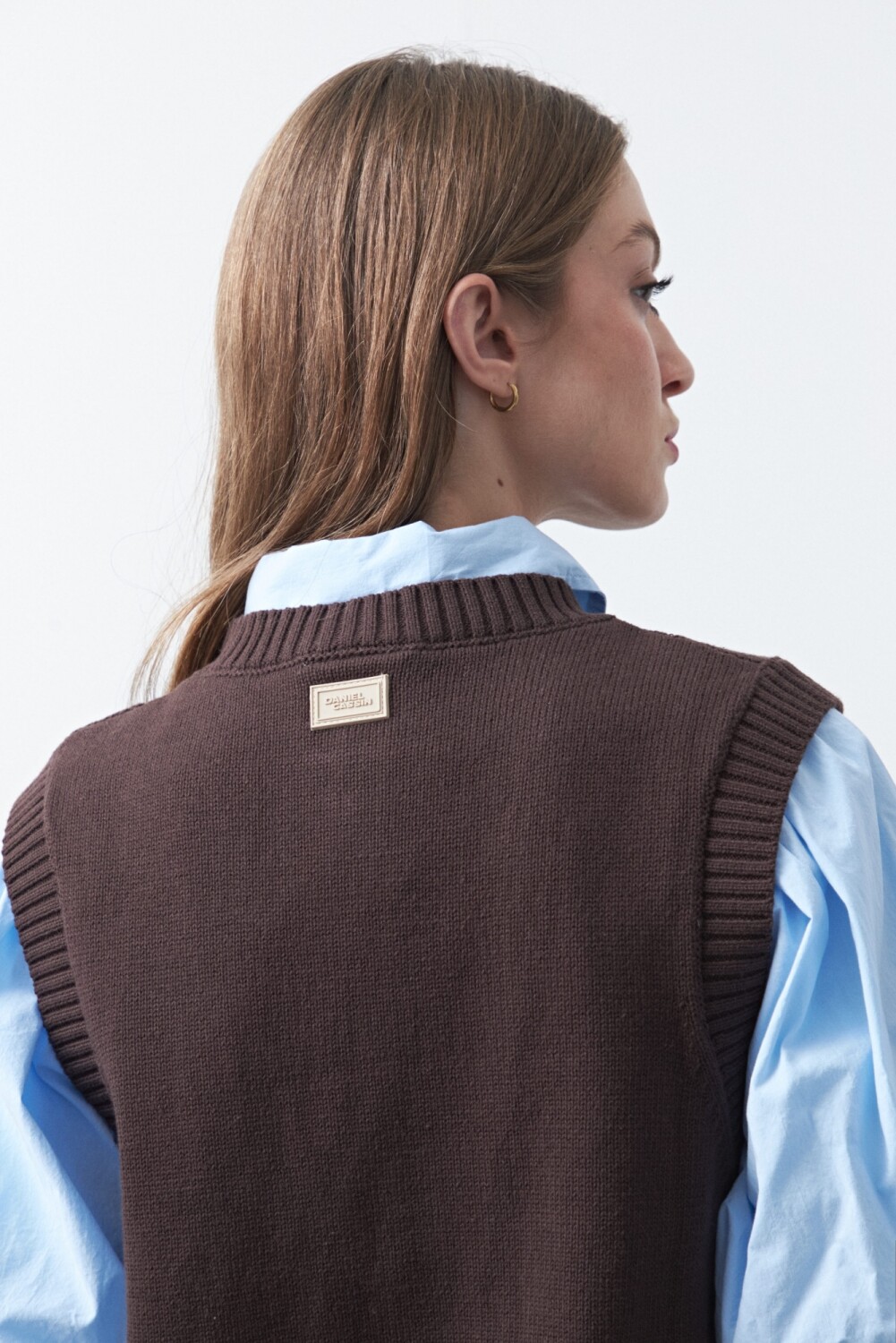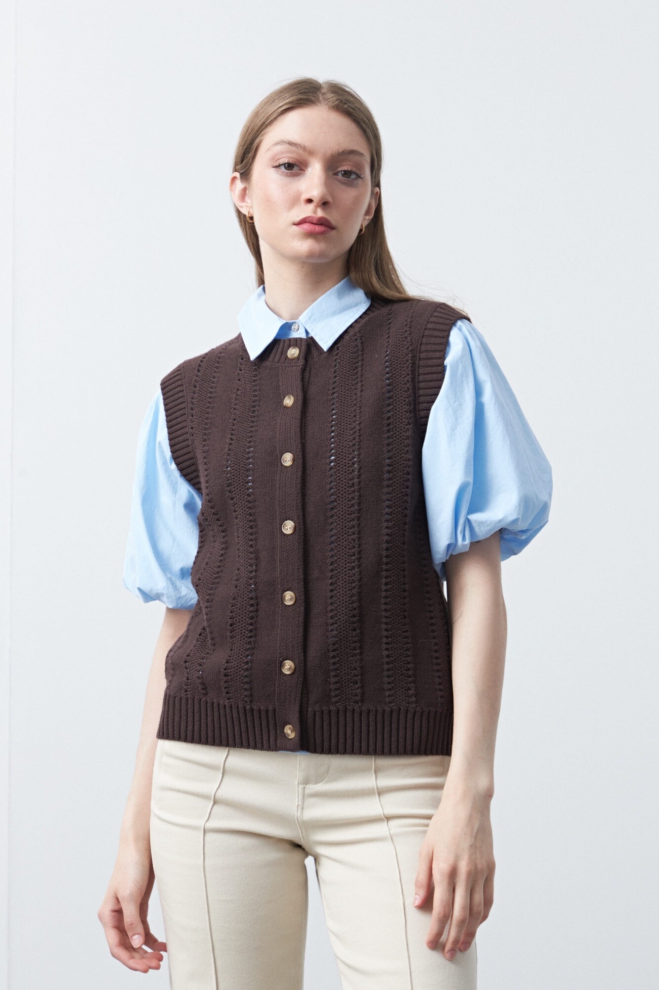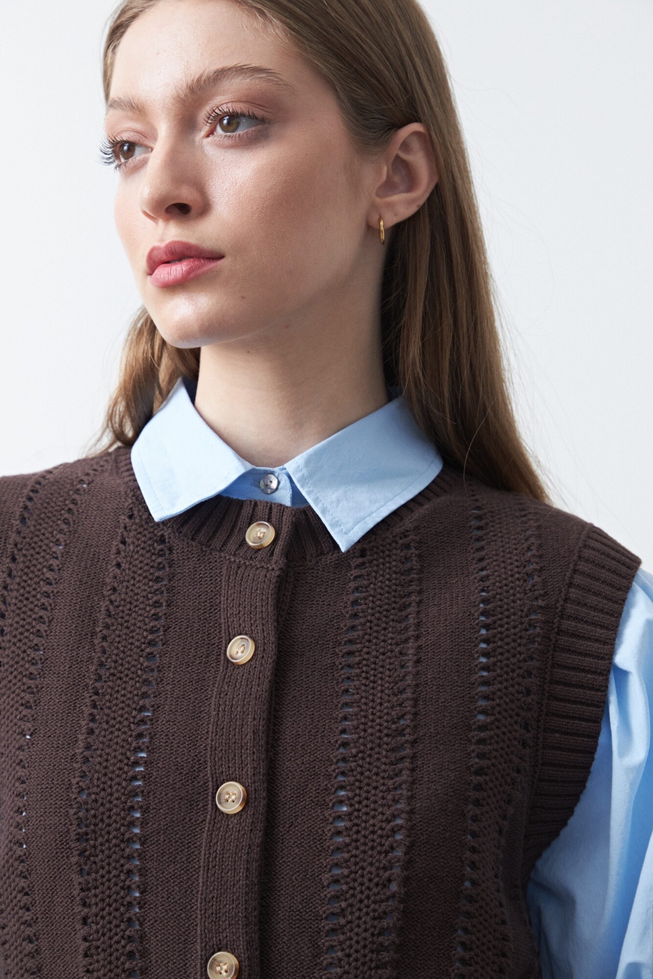 Chaleco tejido de algodón con diseño clásico y detalles de tejido calado que aportan textura y profundidad visual. Su moldería recta lo vuelve fácil de superponer sobre camisas o blusas, logrando un look prolijo y actual, ideal para estilismos de oficina o propuestas más relajadas. El tejido de algodón suma confort y respirabilidad, mientras que la botonadura frontal refuerza su impronta atemporal.