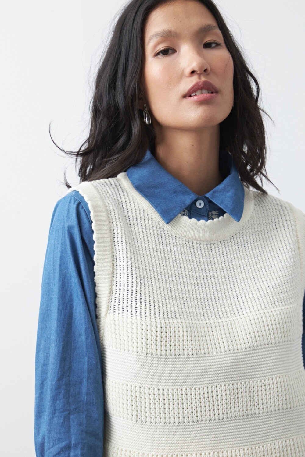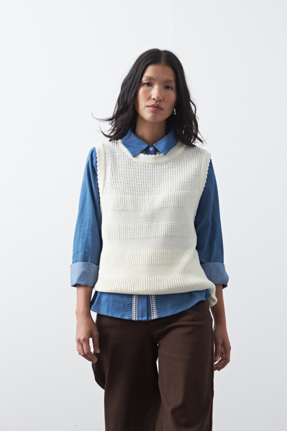 Chaleco tejido de algodón que suma textura y un guiño clásico renovado al look. Su entramado con diferentes puntos aporta riqueza visual y un diseño cuidado, ideal para superponer sobre camisas y elevar outfits de oficina o propuestas más urbanas. El calce recto lo vuelve fácil de combinar y cómodo para usar todo el día, funcionando como una capa clave para sumar estilo sin perder versatilidad.