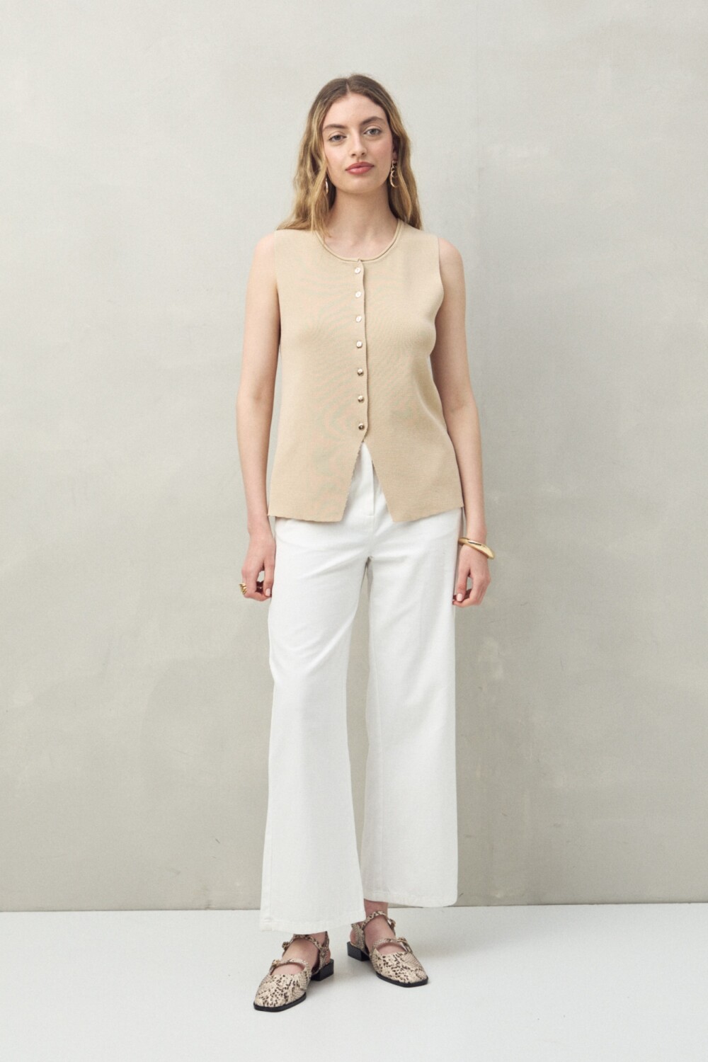 Chaleco tejido con botones al frente y abertura inferior que suma movimiento y un detalle distintivo al diseño. Su textura liviana y el acabado prolijo lo convierten en una prenda versátil, perfecta para usar cerrado como top o abierto en superposición con otras piezas. Una opción moderna y fácil de combinar que eleva cualquier look.