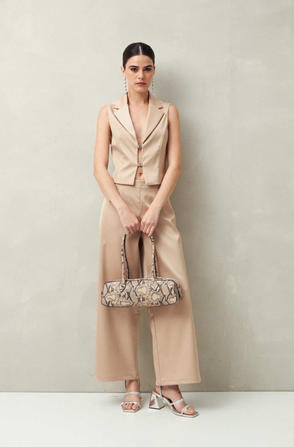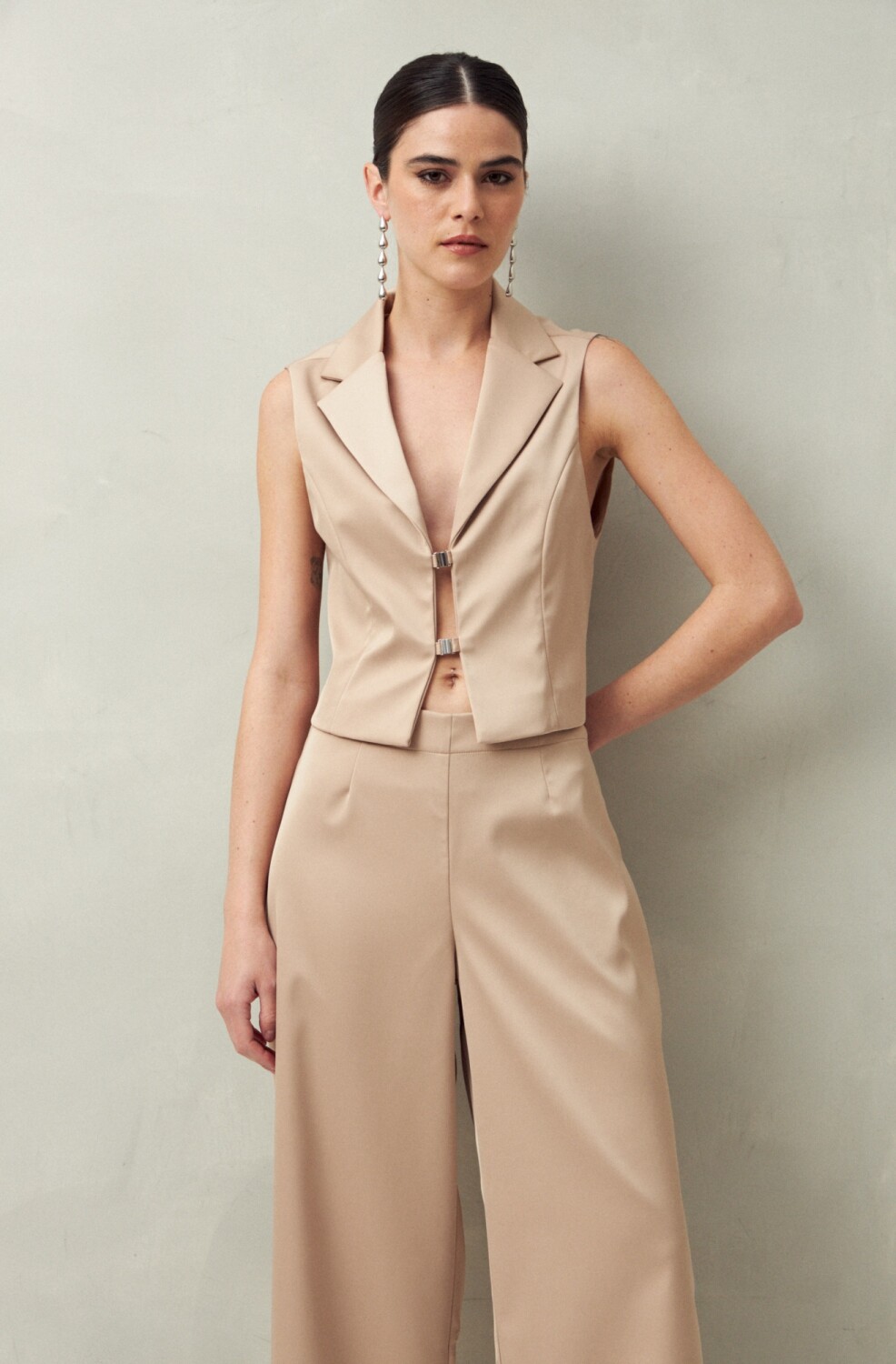 Chaleco sastrero con solapas clásicas y doble broche metálico frontal que lo elevan y aporta un factor distintivo. Su calce cropped lo convierte en una prenda trendy, ideal para acompañar pantalones de tiro alto y armar un look de noche con impacto.