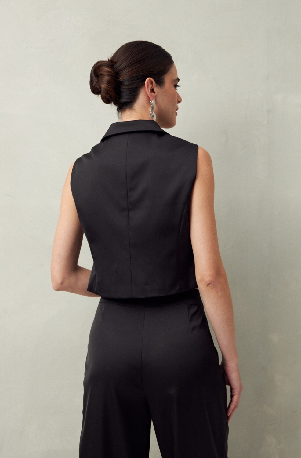 Chaleco sastrero con solapas clásicas y doble broche metálico frontal que lo elevan y aporta un factor distintivo. Su calce cropped lo convierte en una prenda trendy, ideal para acompañar pantalones de tiro alto y armar un look de noche con impacto.