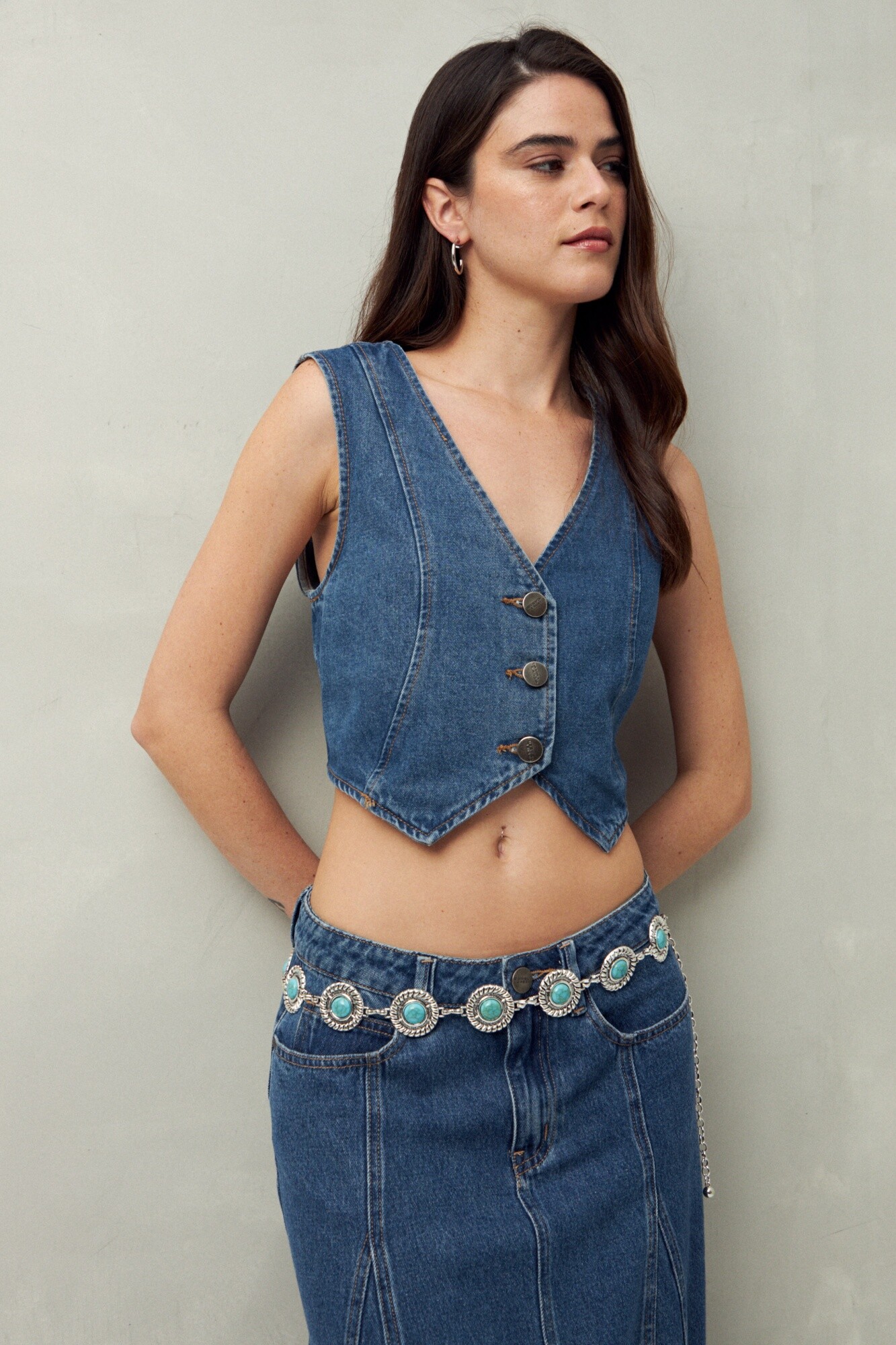 Cinturón metálico con diseño de eslabones y medallones circulares que destacan por sus piedras turquesa en relieve. Una pieza con aire boho chic que aporta personalidad.