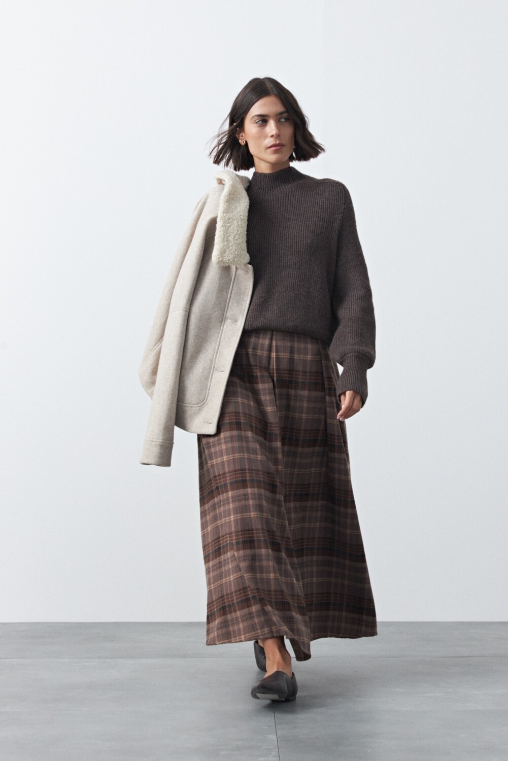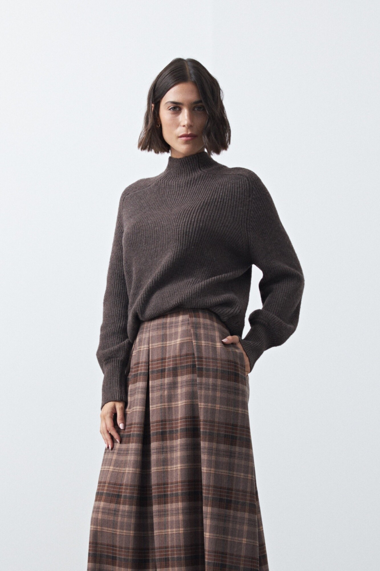 Falda a cuadros de inspiración sastrera con silueta larga y caída amplia, alineada con la tendencia de las faldas midi y maxi que dominan la temporada. El diseño a cuadros, heredado del universo tailoring, refuerza su carácter atemporal mientras se posiciona como un print clave dentro de las propuestas actuales, aportando estructura visual y un aire sofisticado.