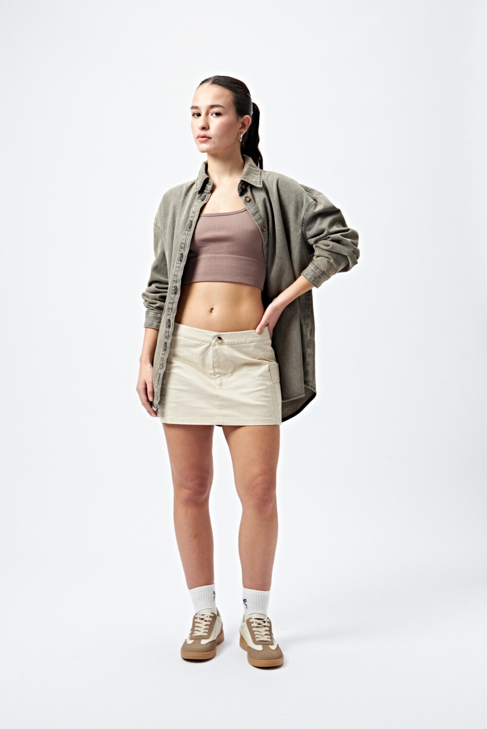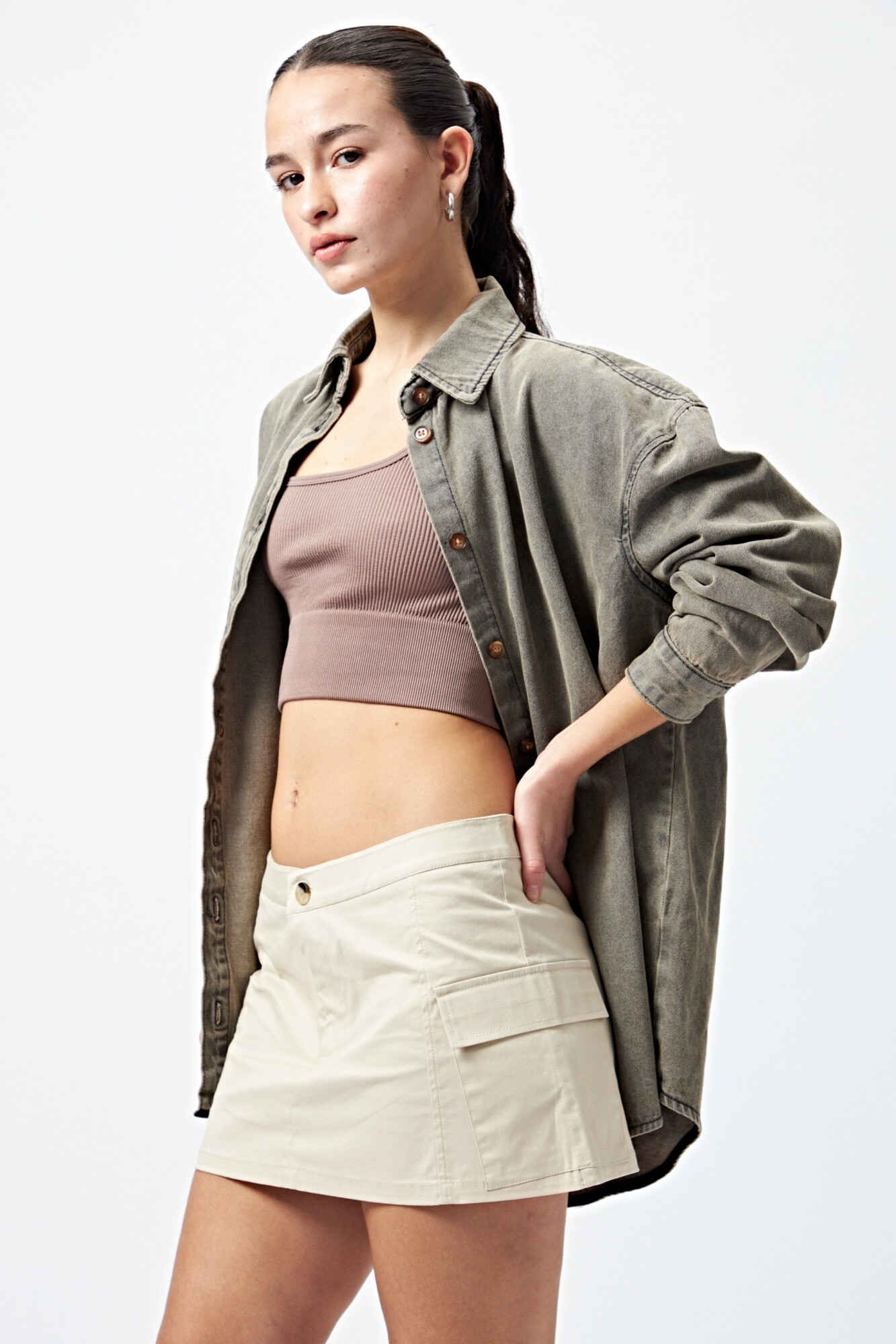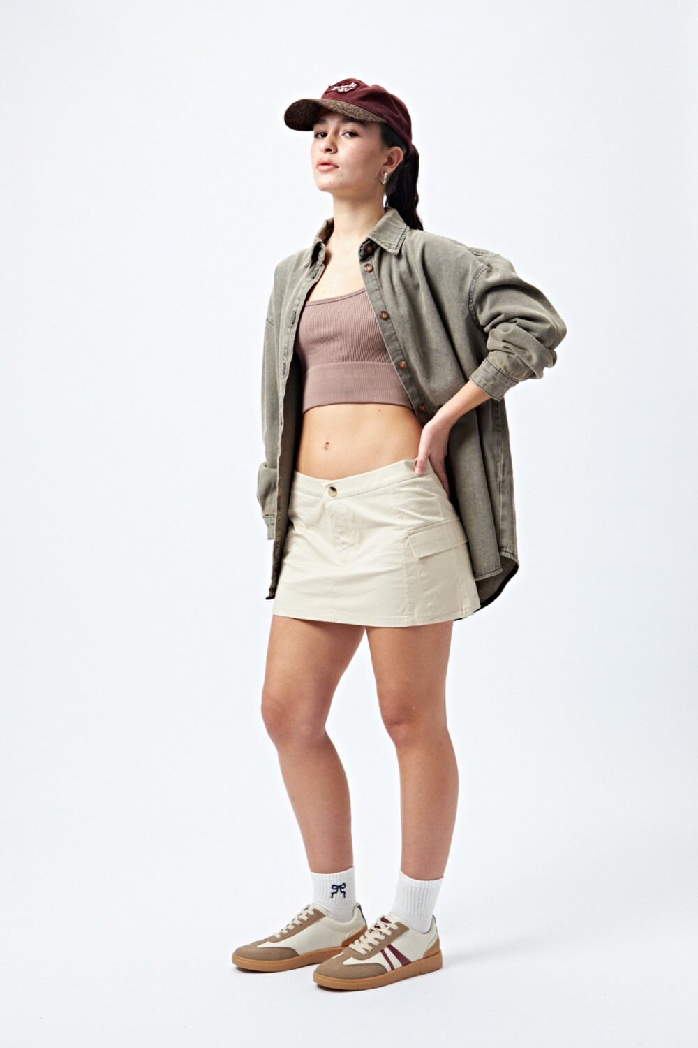 Minifalda estilo cargo, diseñada con bolsillos laterales que aportan un aire utilitario y trendy. Su silueta recta y tiro bajo la convierten en una prenda versátil, ideal para looks urbanos con un guiño relajado y canchero. Perfecta para combinar con tops ajustados o camisas oversized, según la ocasión.