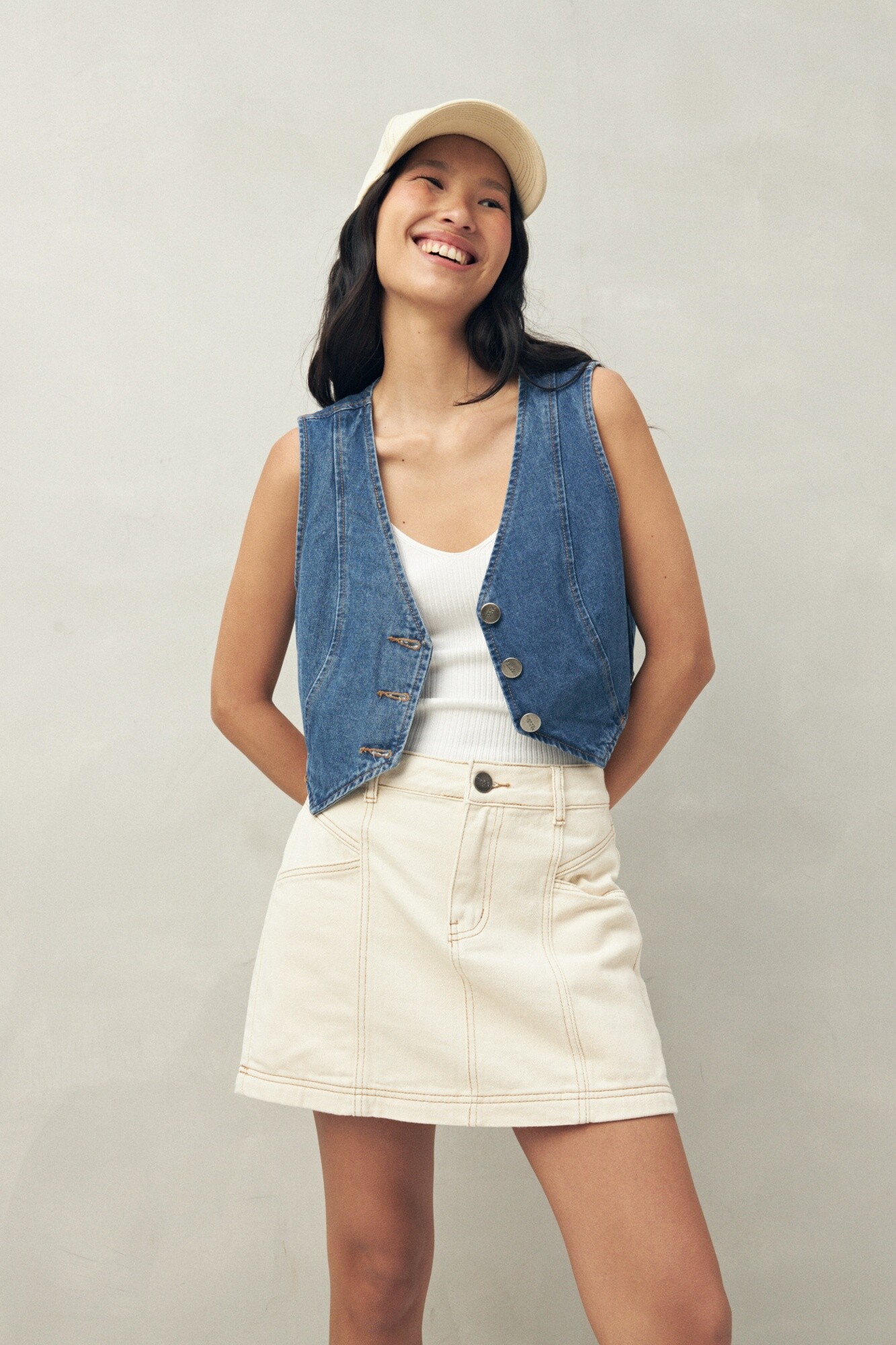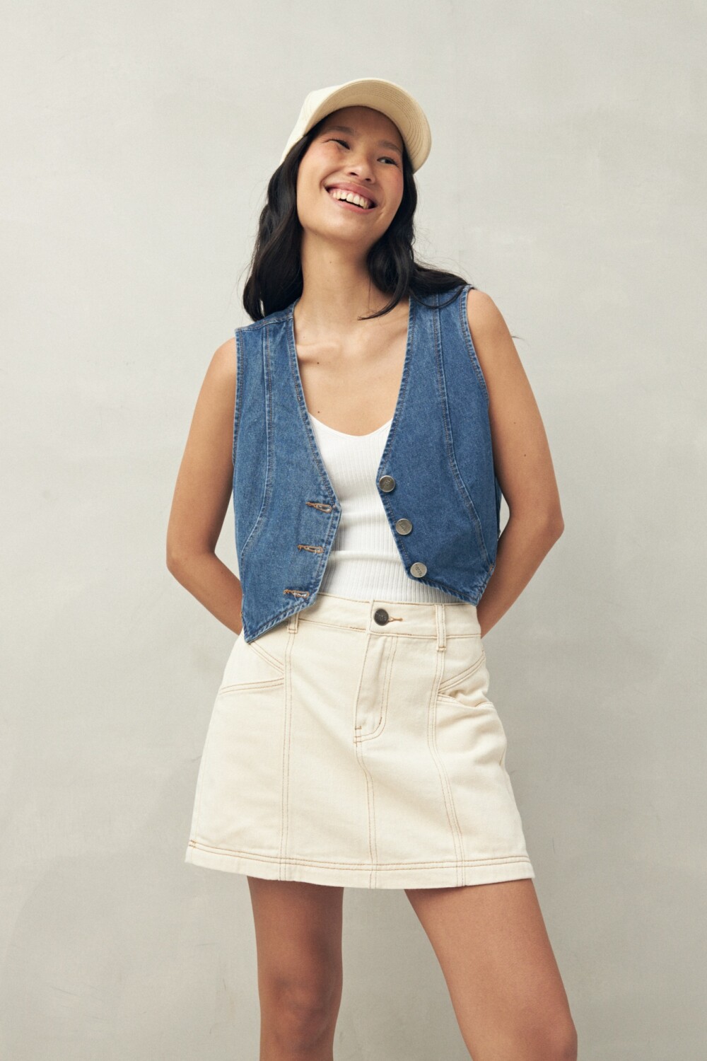 Falda de denim con un fit recto y costuras resaltadas que estilizan la silueta sin perder comodidad. El diseño incorpora bolsillos delanteros diagonales y recortes verticales que aportan un toque moderno y versátil.
