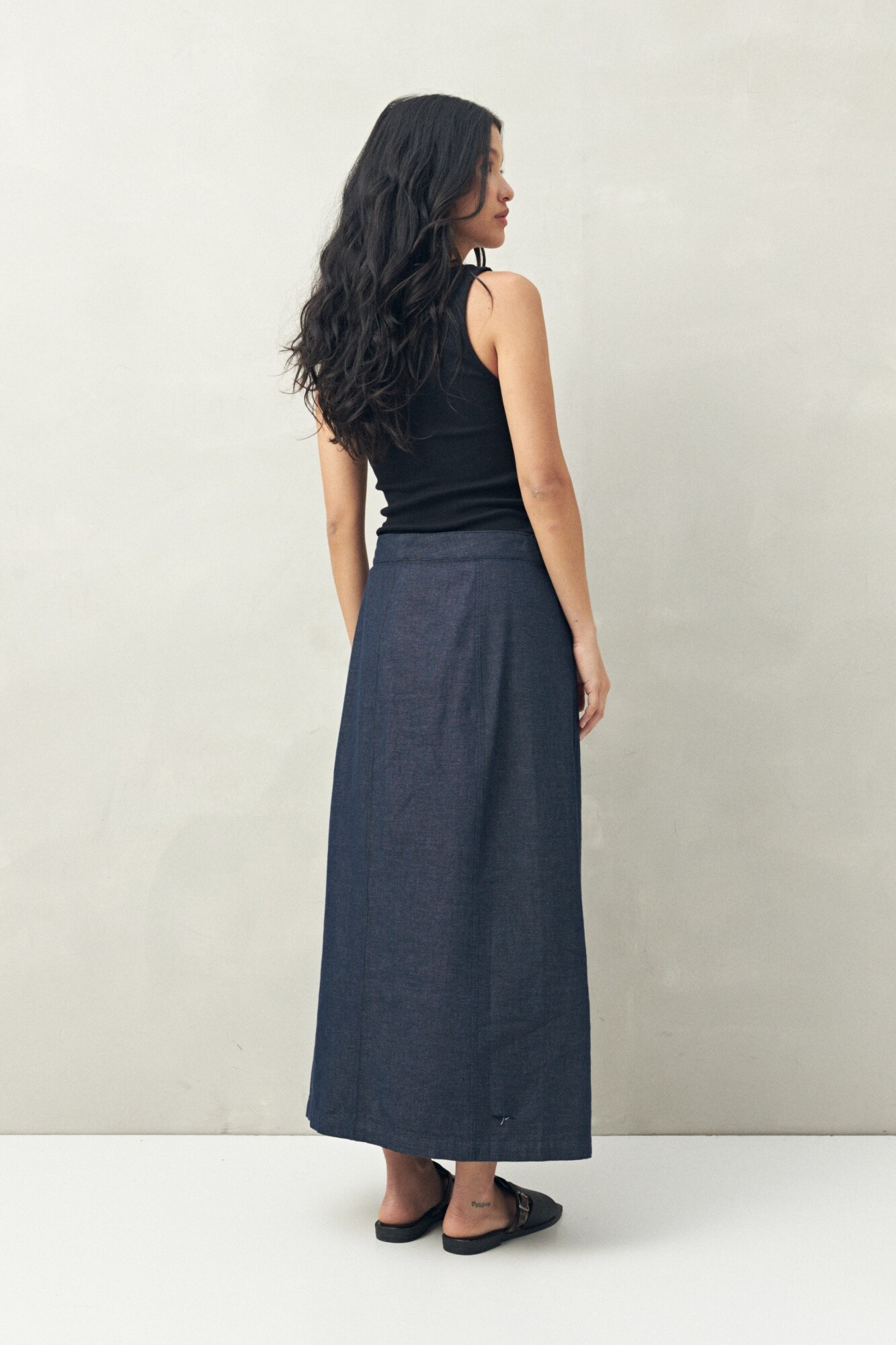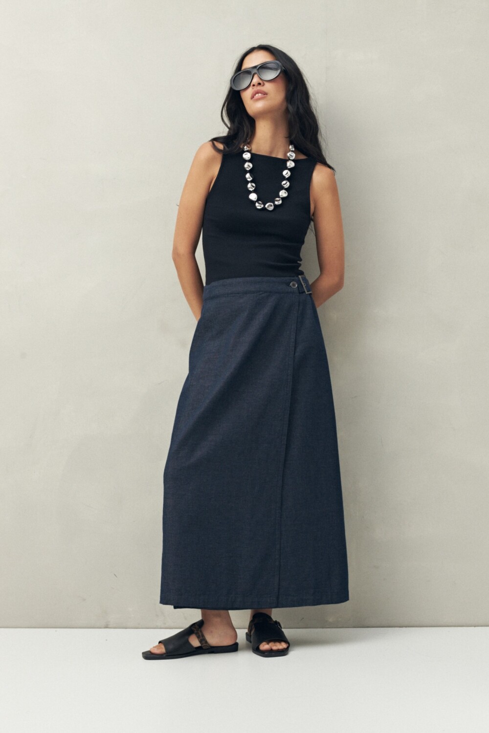 Falda larga confeccionada en 100% algodón, con diseño cruzado y cierre lateral con hebilla que realza la cintura. Su silueta amplia y fluida aporta movimiento y una caída natural, ideal para lograr looks frescos y modernos. Una prenda versátil que puede acompañar desde un top ajustado hasta una camisa liviana, perfecta para elevar cualquier outfit casual.