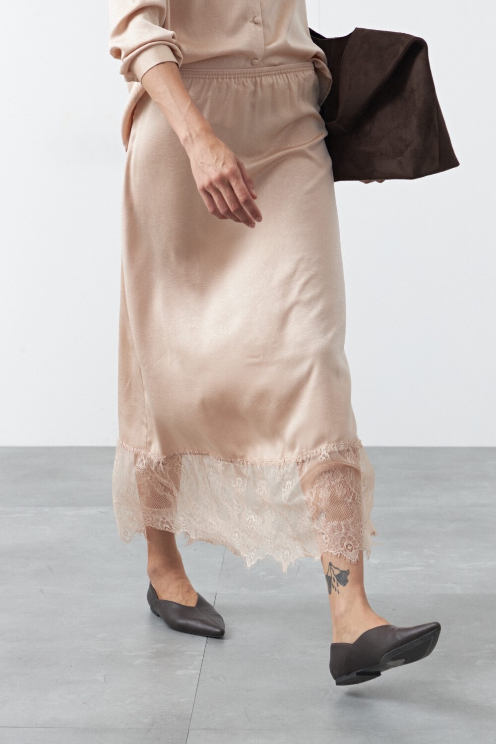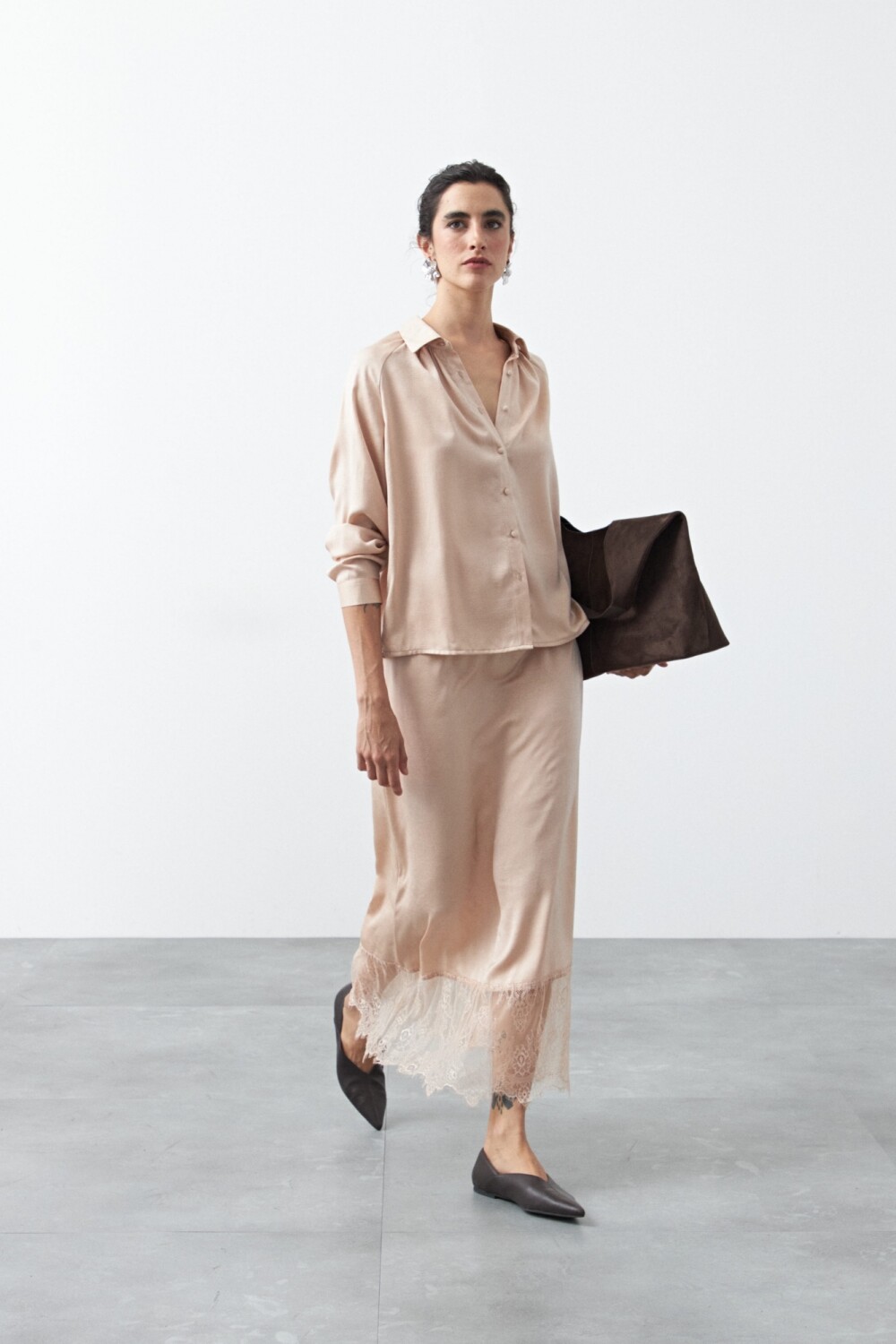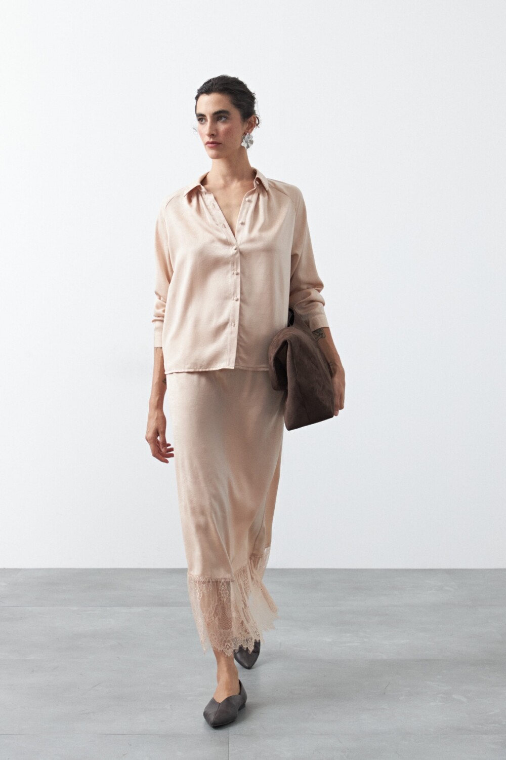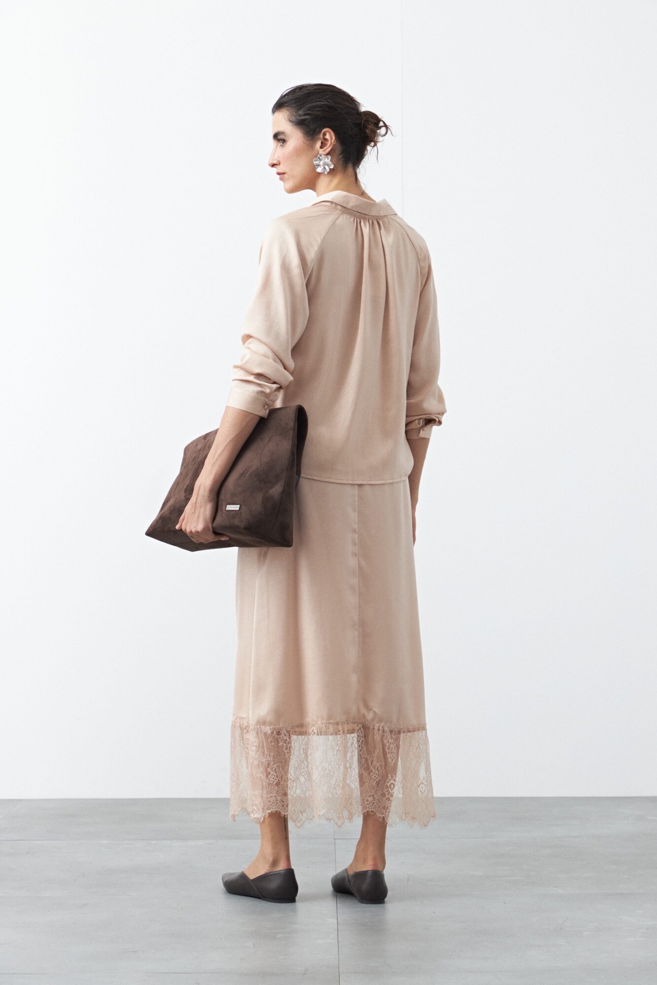 Falda midi de caída fluida que combina una silueta limpia con un detalle de encaje en el bajo, aportando un toque delicado y sofisticado. El diseño con cintura elastizada se adapta cómodamente al cuerpo, mientras que el largo midi estiliza la figura y suma movimiento al caminar. Una prenda versátil, ideal para elevar looks de día o de noche según cómo se combine.