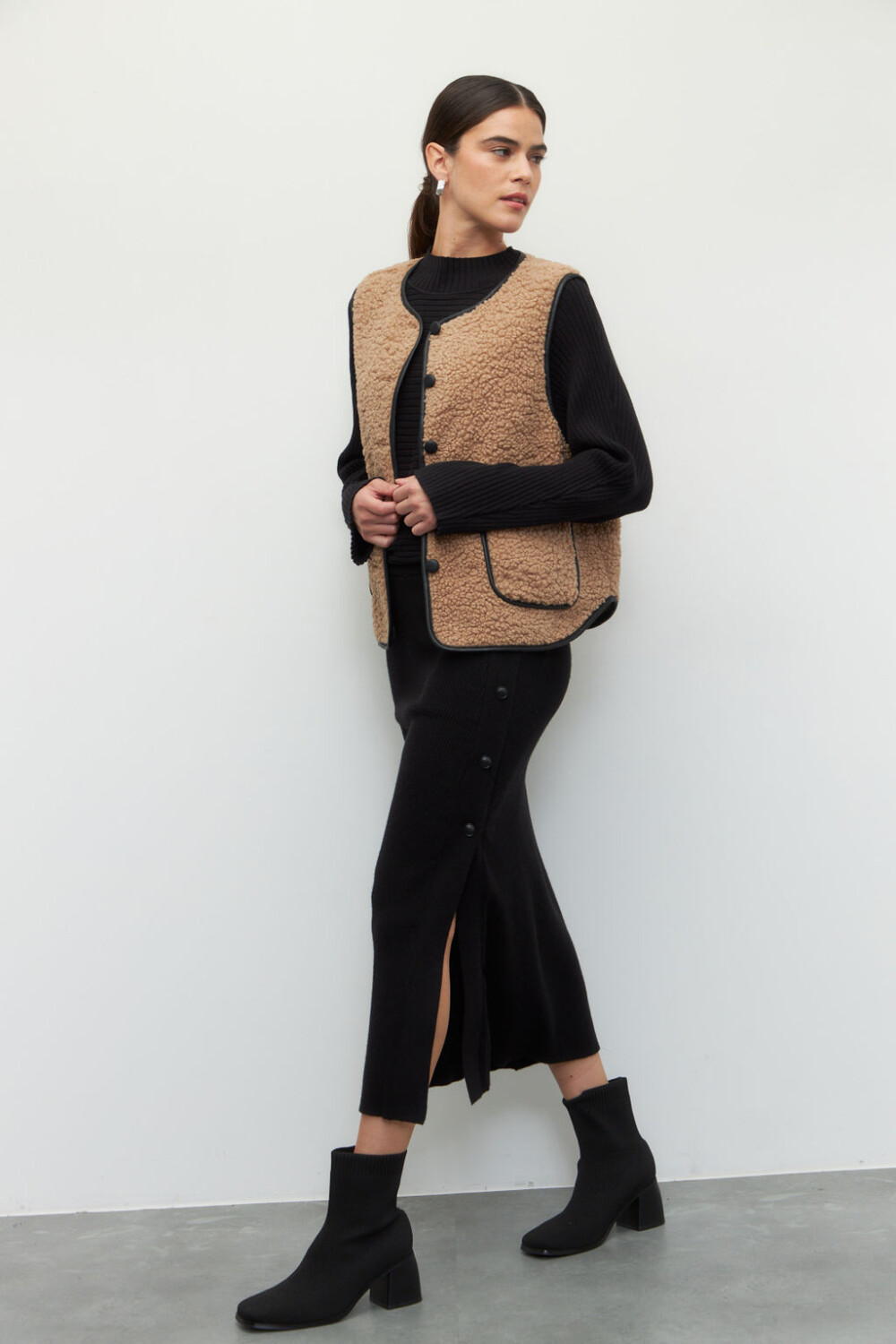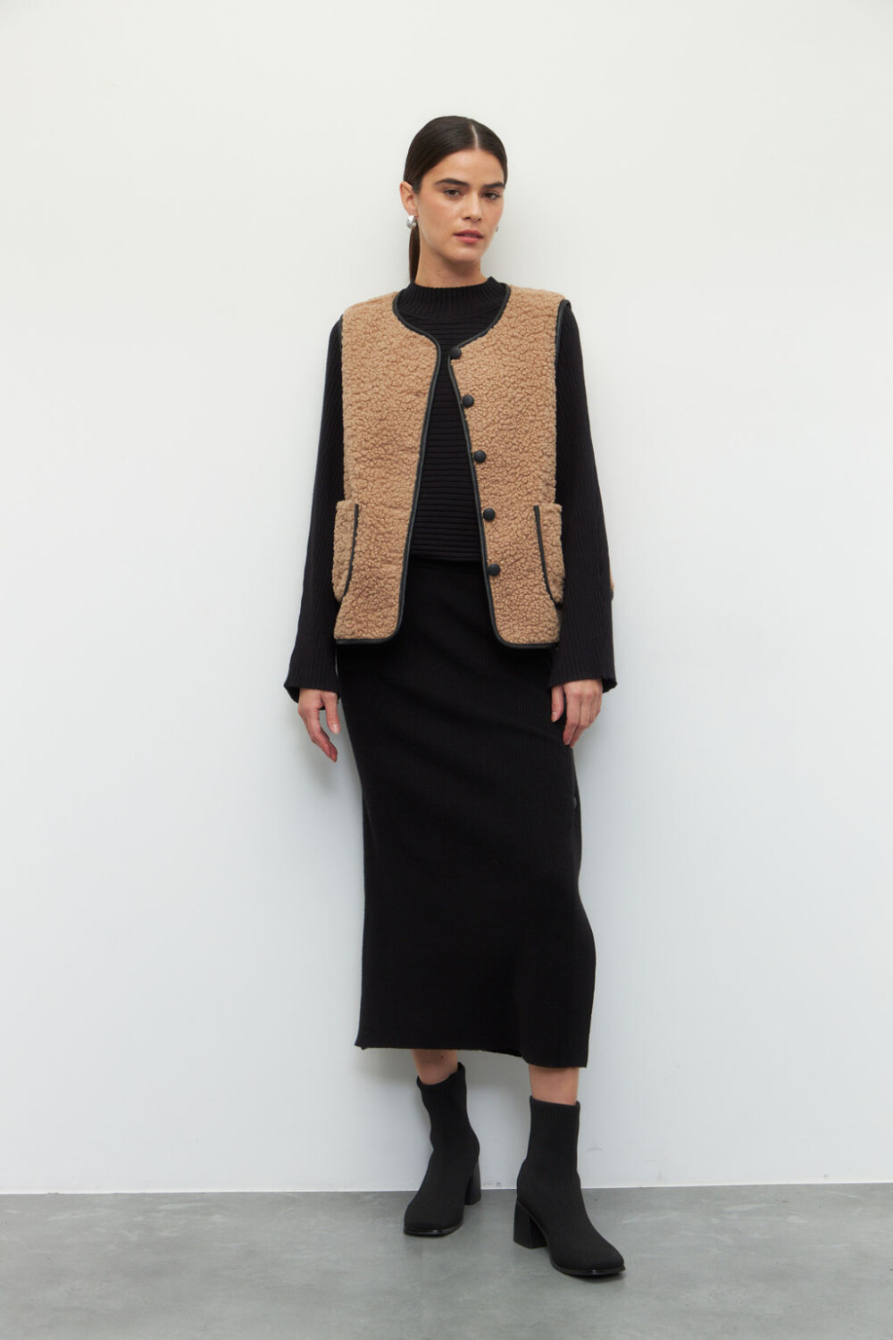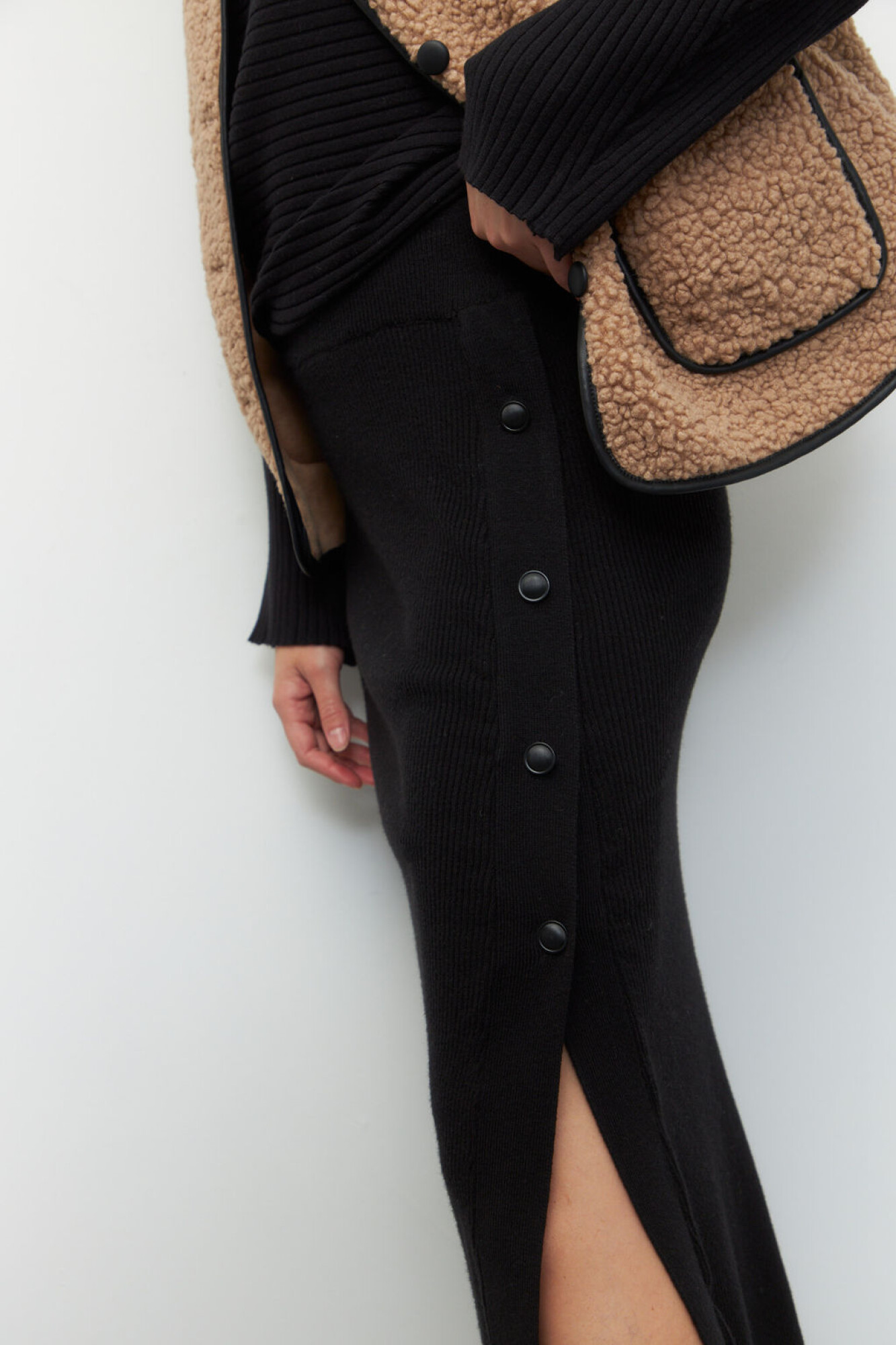 Falda larga de punto, cuenta con elástico en la cintura y botones en uno de los laterales.