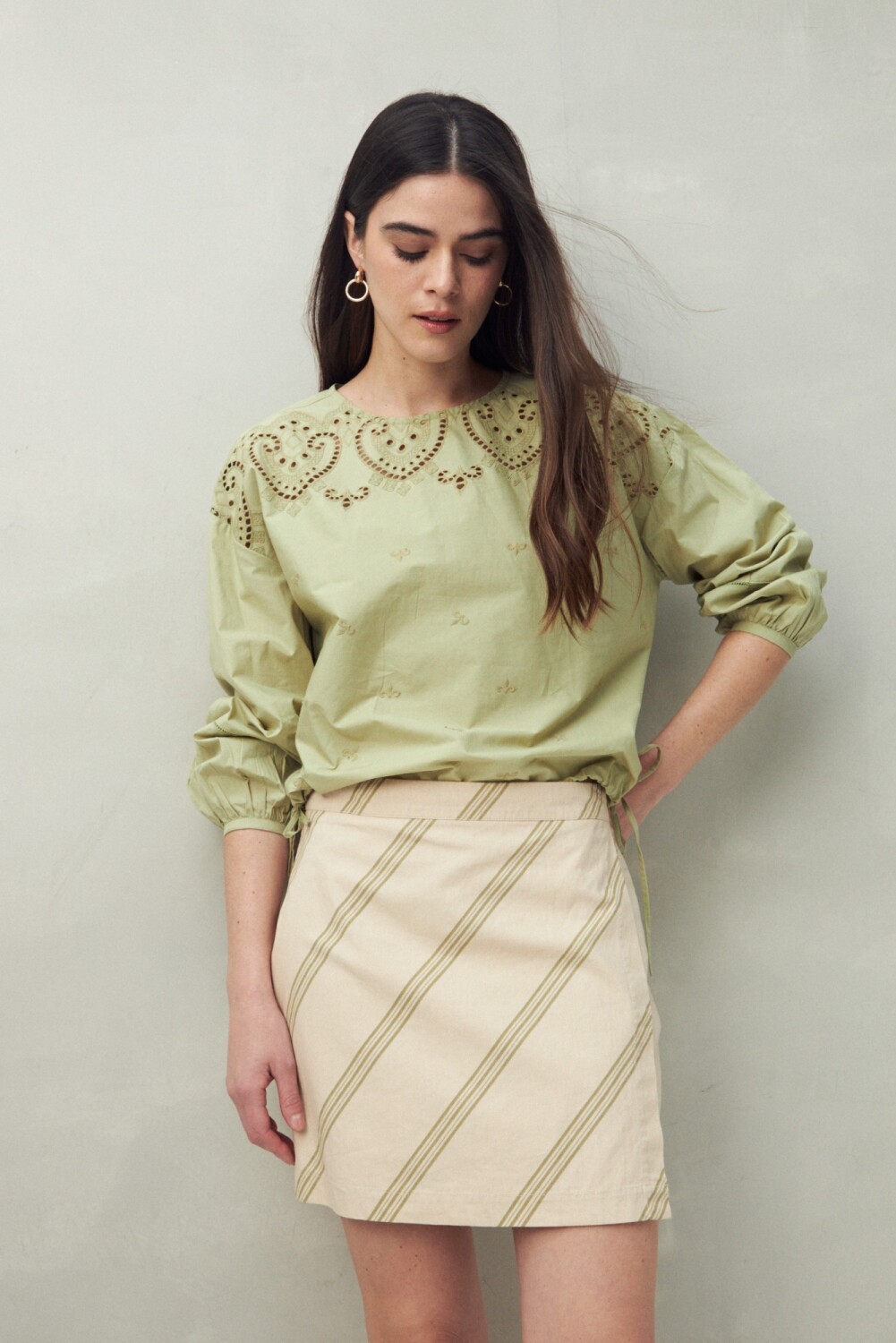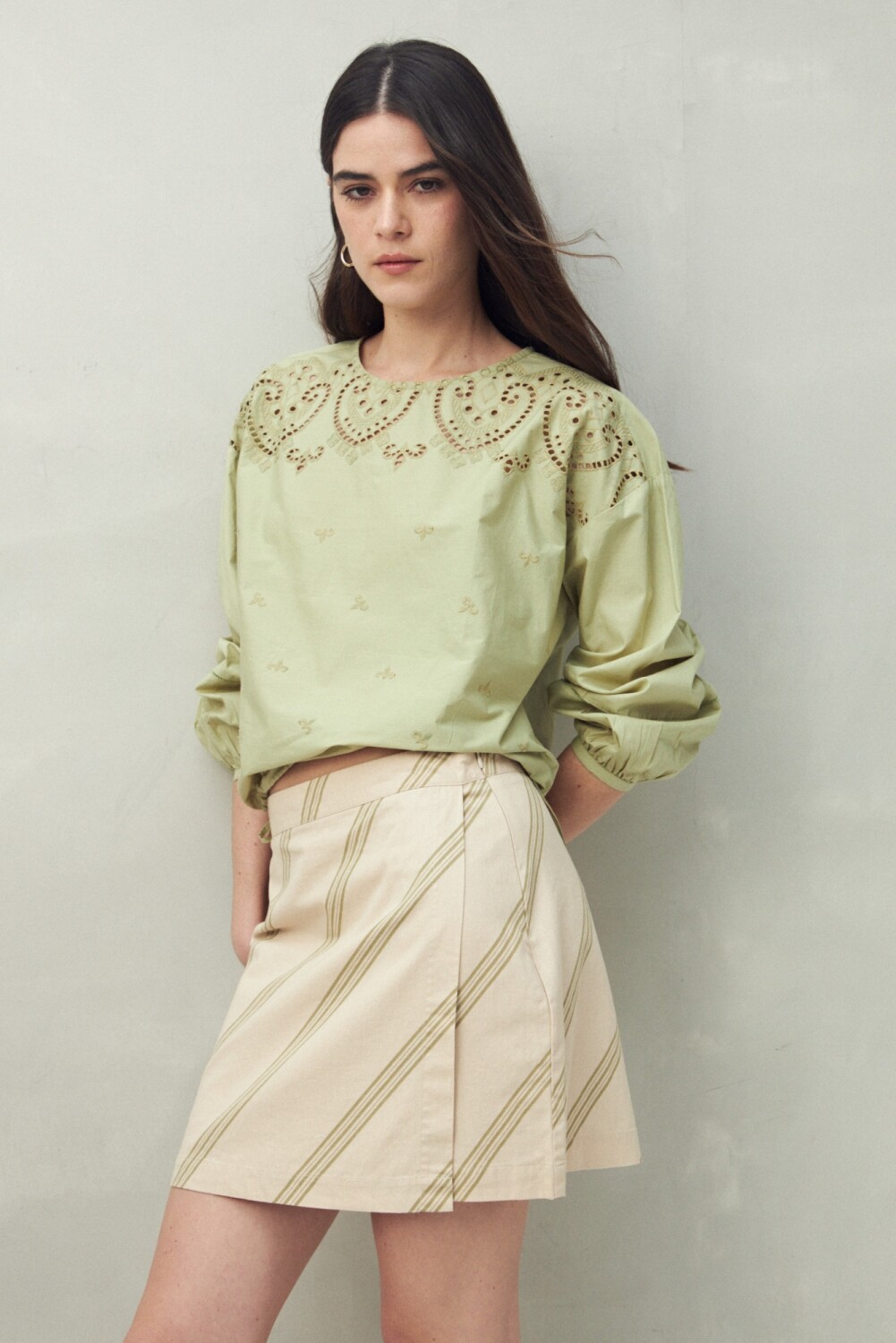 Minifalda de algodón con un fit recto y femenino, ideal para sumar frescura y estilo en los días de calor. Disponible en estampas que van desde rayas diagonales con efecto visual estilizador hasta un print botánico que transmite vibra natural y veraniega. Una prenda versátil, trendy y fácil de combinar tanto con blusas como con tops básicos.