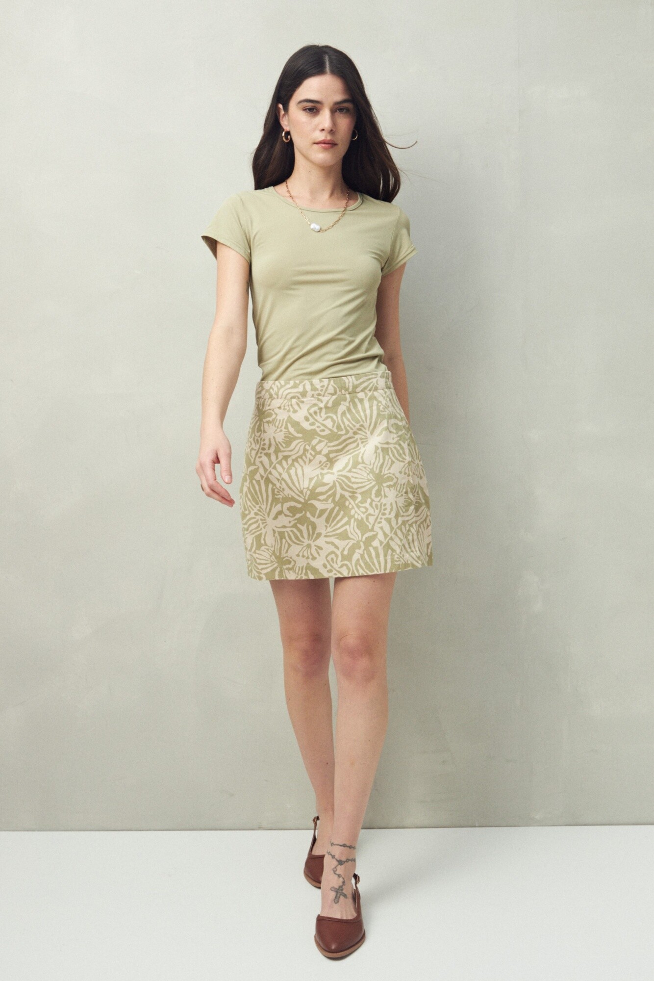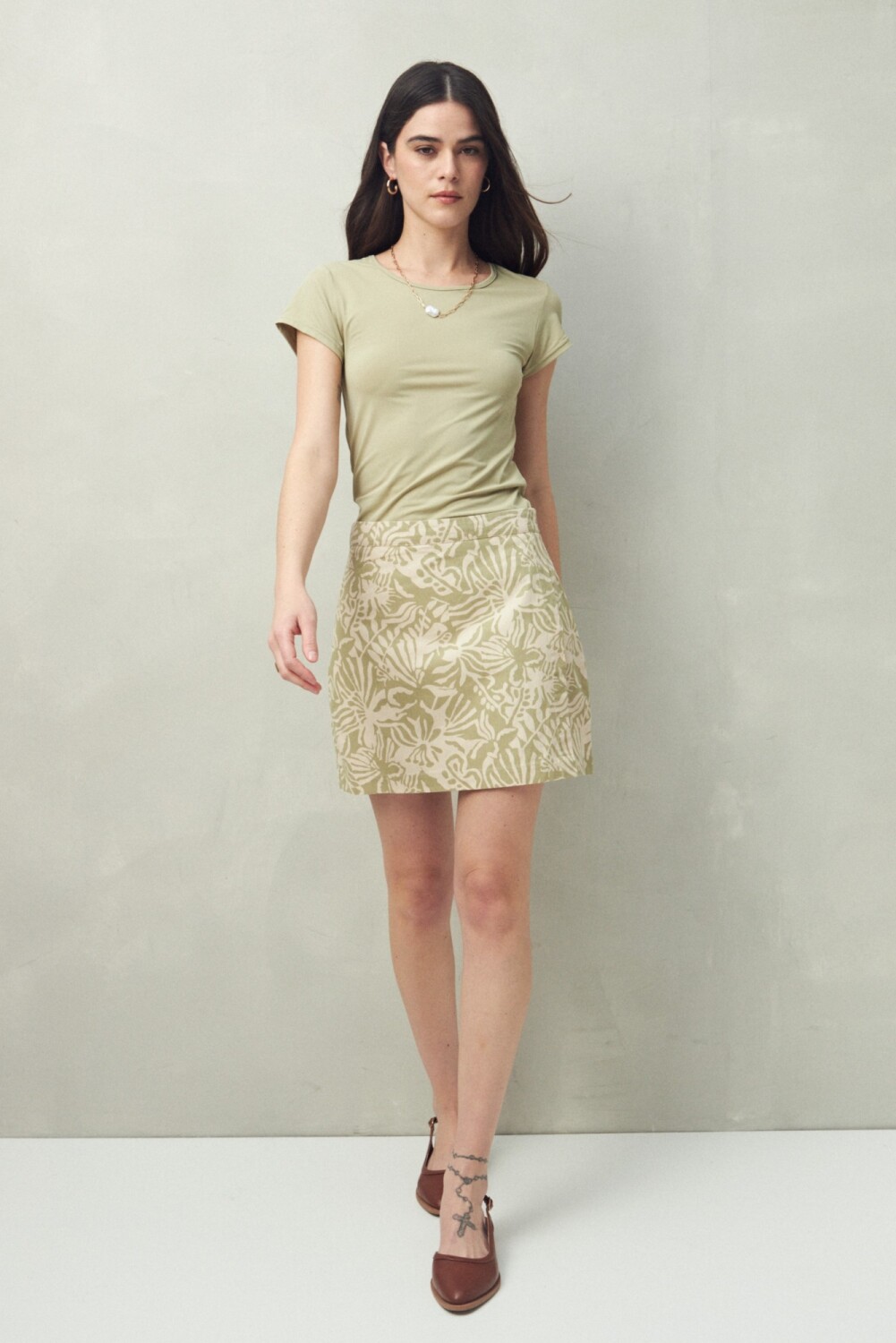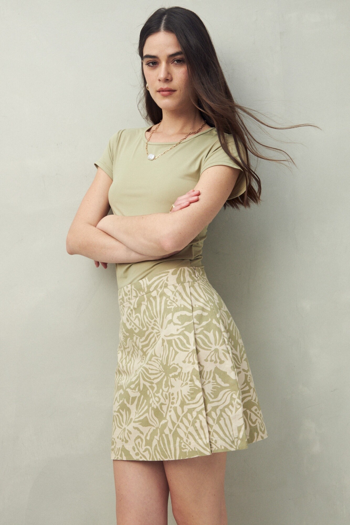 Minifalda de algodón con un fit recto y femenino, ideal para sumar frescura y estilo en los días de calor. Disponible en estampas que van desde rayas diagonales con efecto visual estilizador hasta un print botánico que transmite vibra natural y veraniega. Una prenda versátil, trendy y fácil de combinar tanto con blusas como con tops básicos.