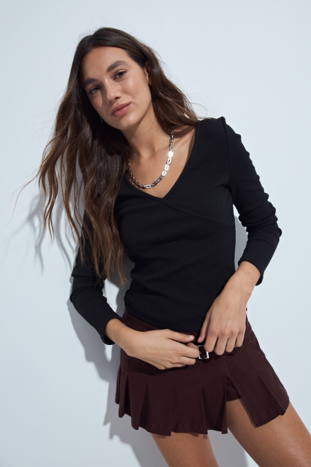 Pollera corta con leve vuelo y tablas que aportan movimiento y un aire femenino. Su diseño de tiro medio con detalle de cinturón integrado suma un toque distintivo, mientras el tejido con leve elasticidad garantiza un calce cómodo y adaptable. Ideal para looks de noche con impronta canchera y actual.