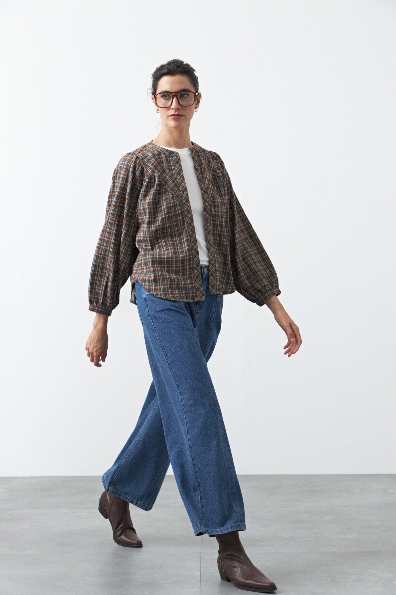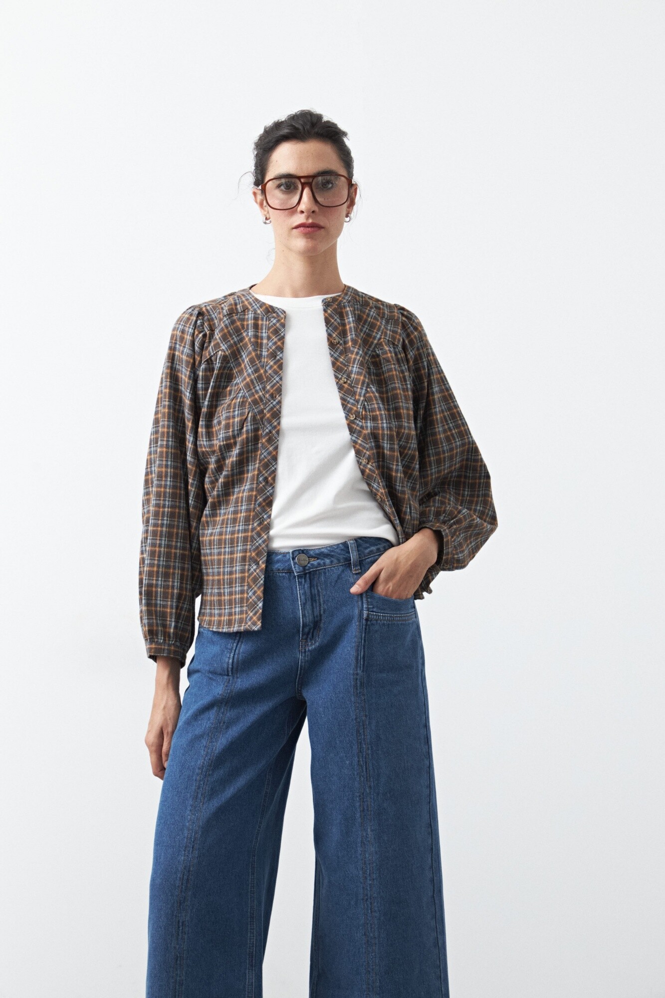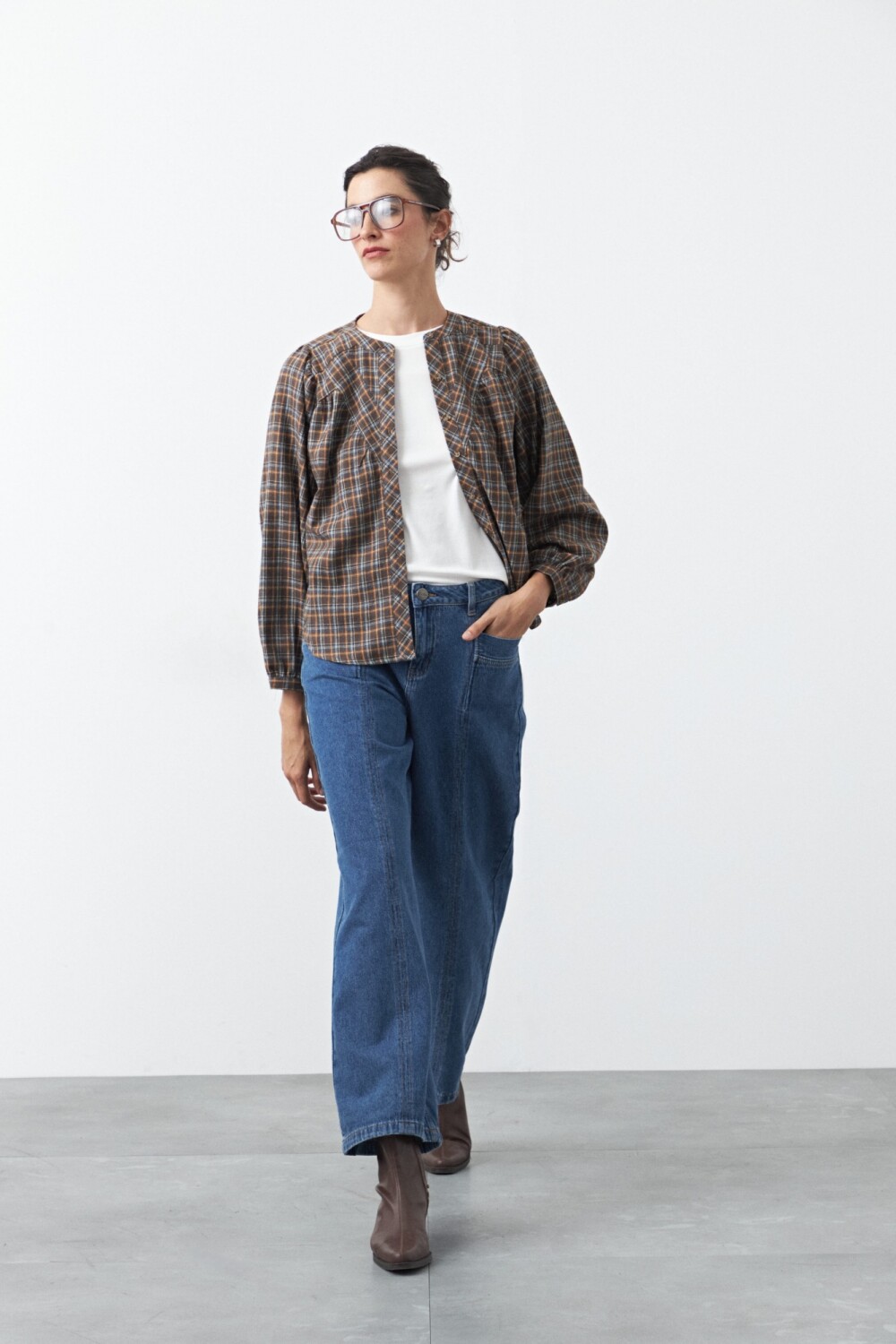 Jean fit flare de inspiración retro, con calce entallado en la parte superior y apertura progresiva hacia el bajo que estiliza la figura. El diseño se completa con pespuntes a contratono que realzan su construcción y aportan un detalle distintivo, en línea con la estética denim en tendencia.