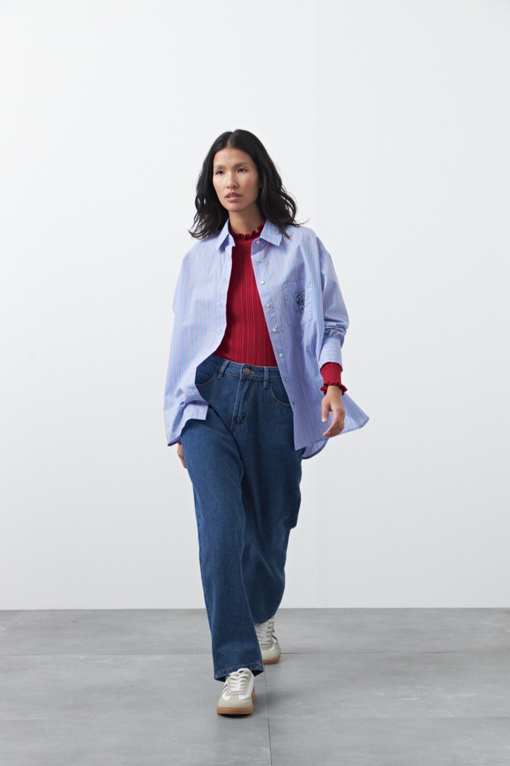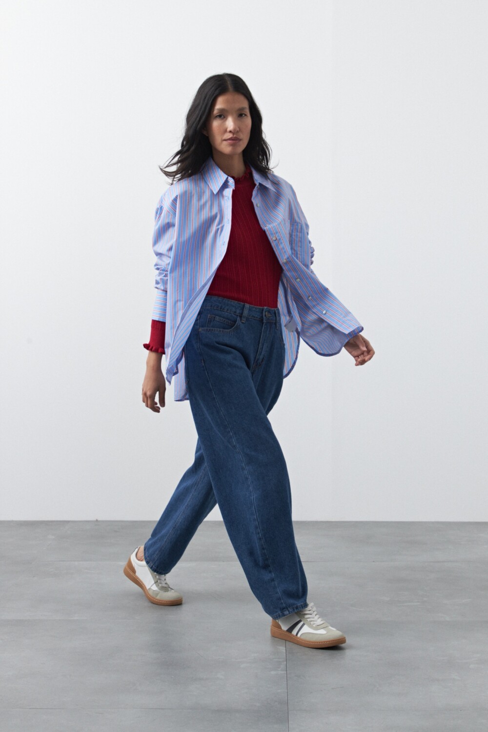 Jean fit barrel de silueta curva y volumen controlado, una de las formas más actuales dentro del denim. Su diseño se ensancha levemente en pierna y se ajusta en el bajo, creando una estructura moderna que aporta personalidad al look.
