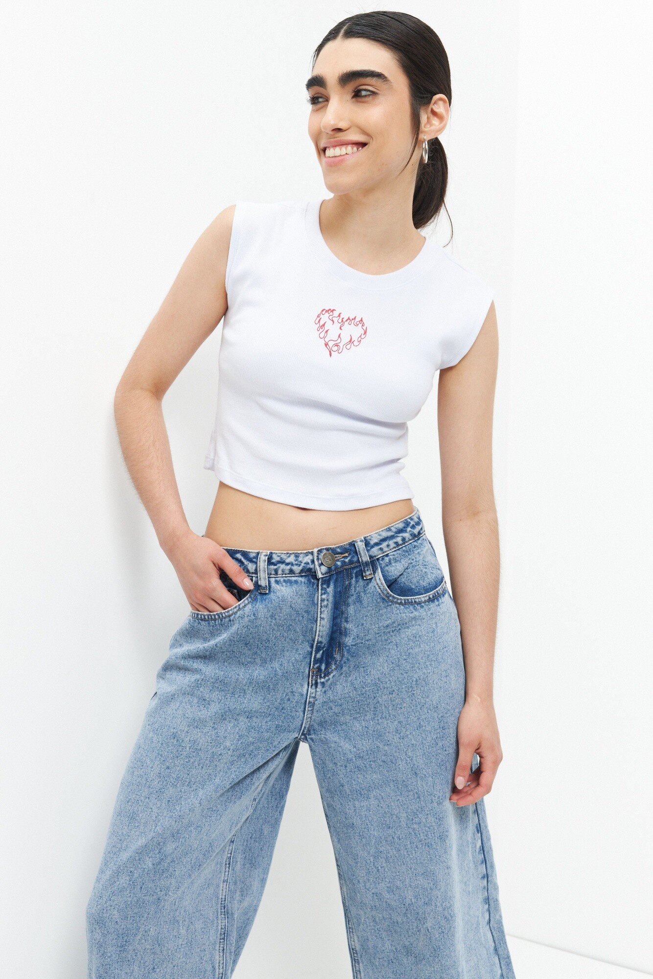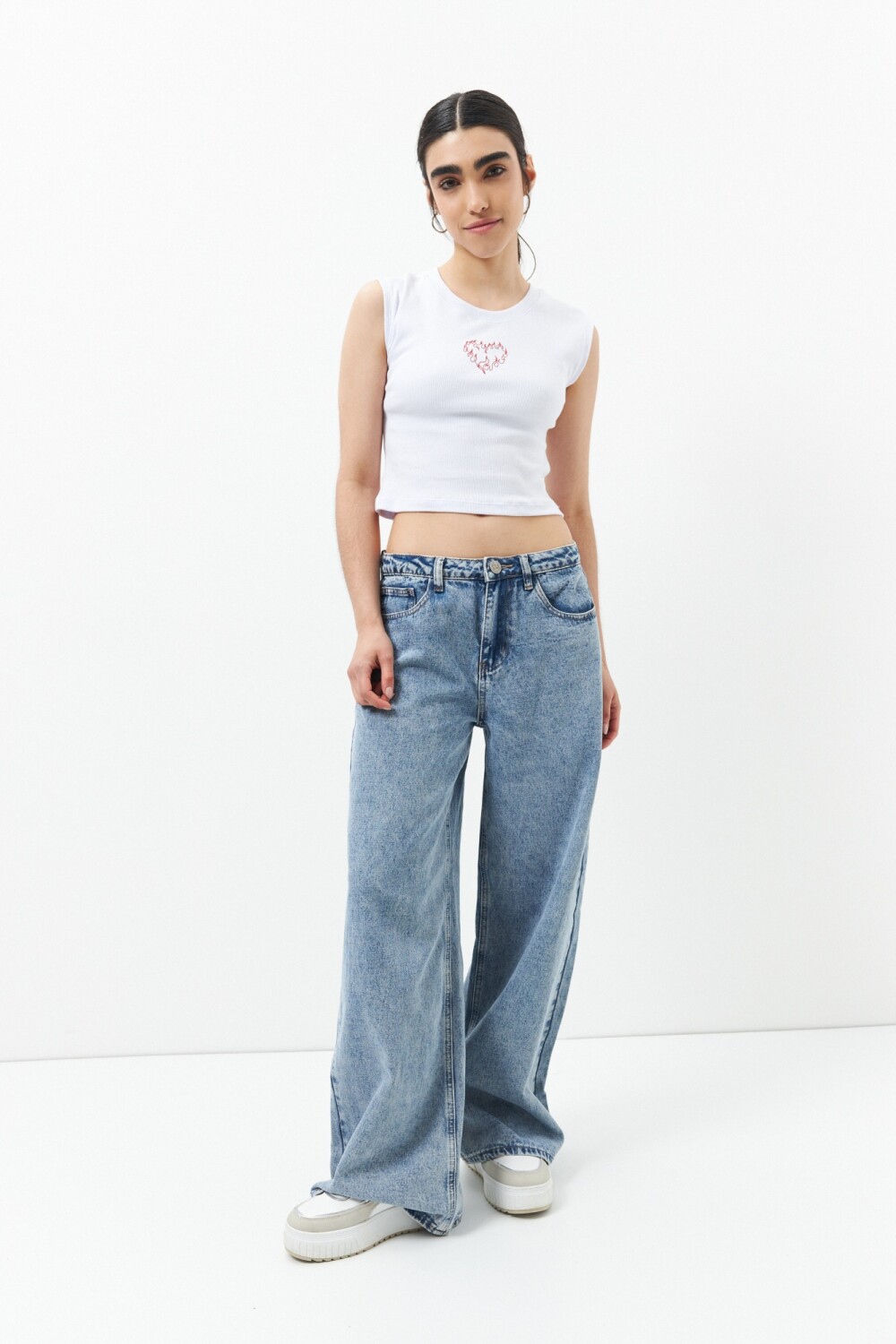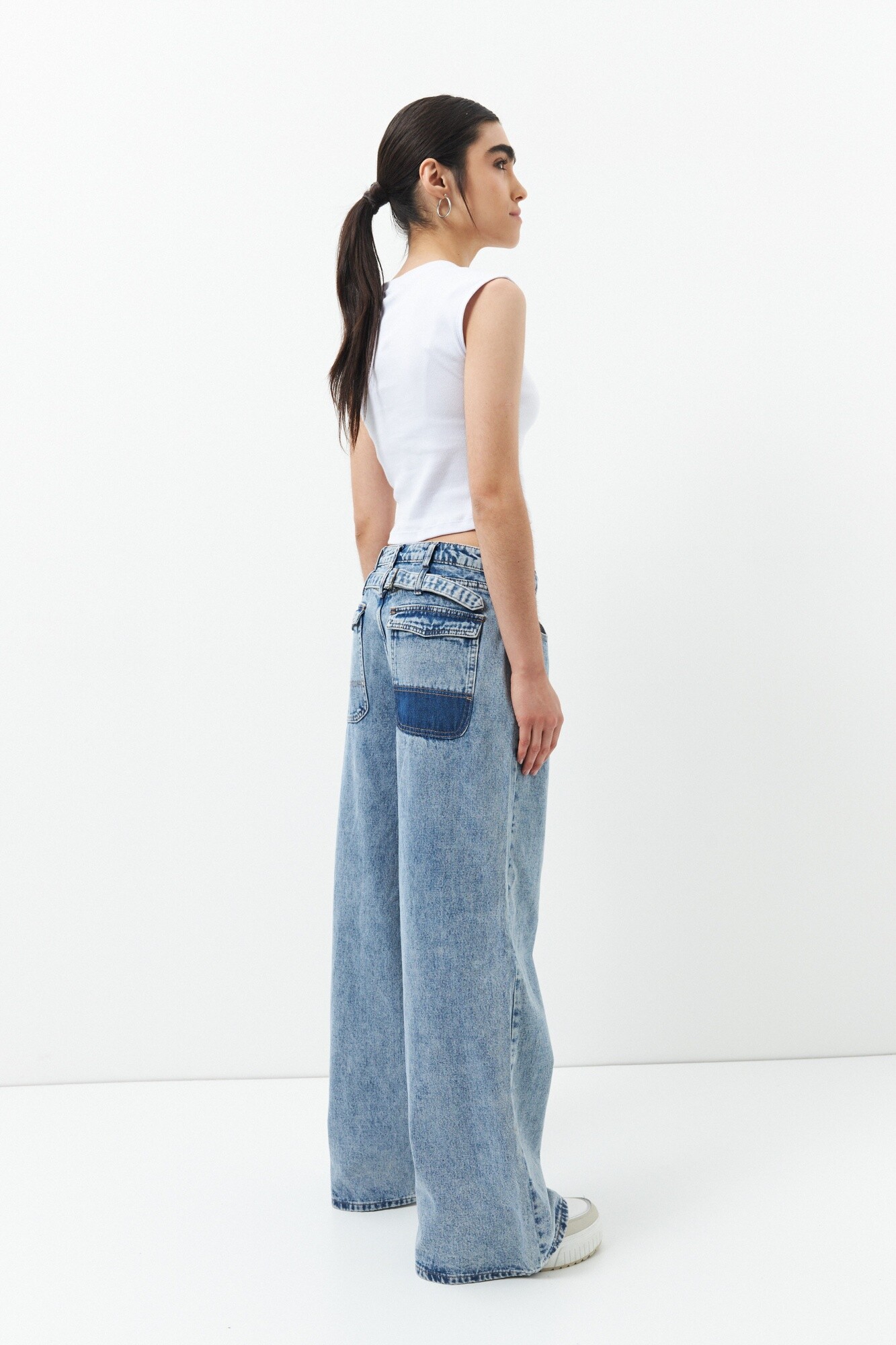 Jean ancho desgastado y de tiro bajo, es de algodón y cuenta con cinco bolsillos, los traseros son de solapa y uno de ellos tiene una parte más oscura. Además tiene una cinta ajustable con hebilla en la parte trasera de la cintura.