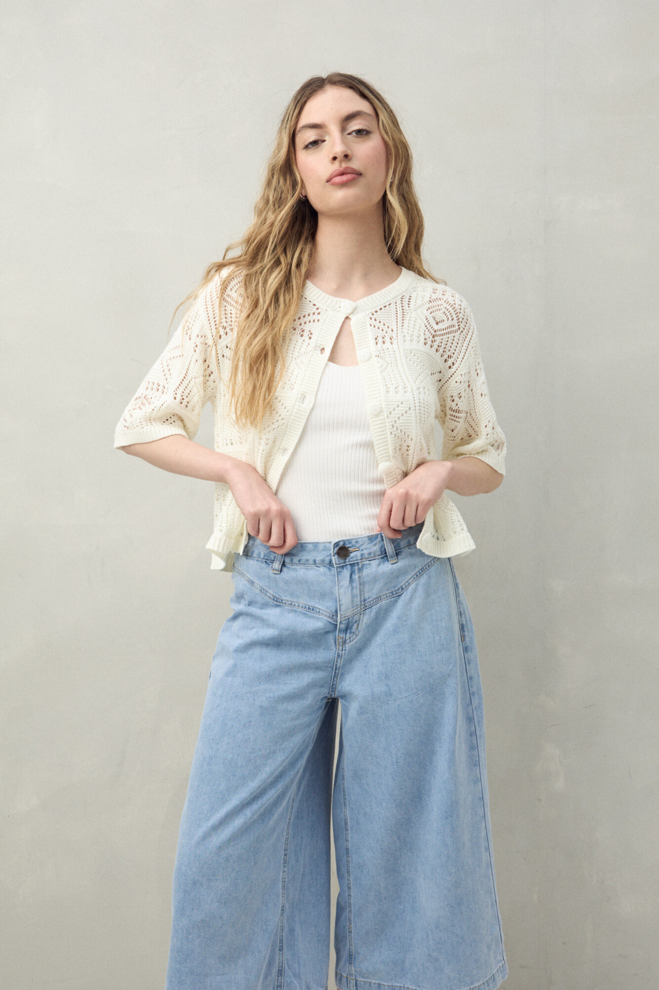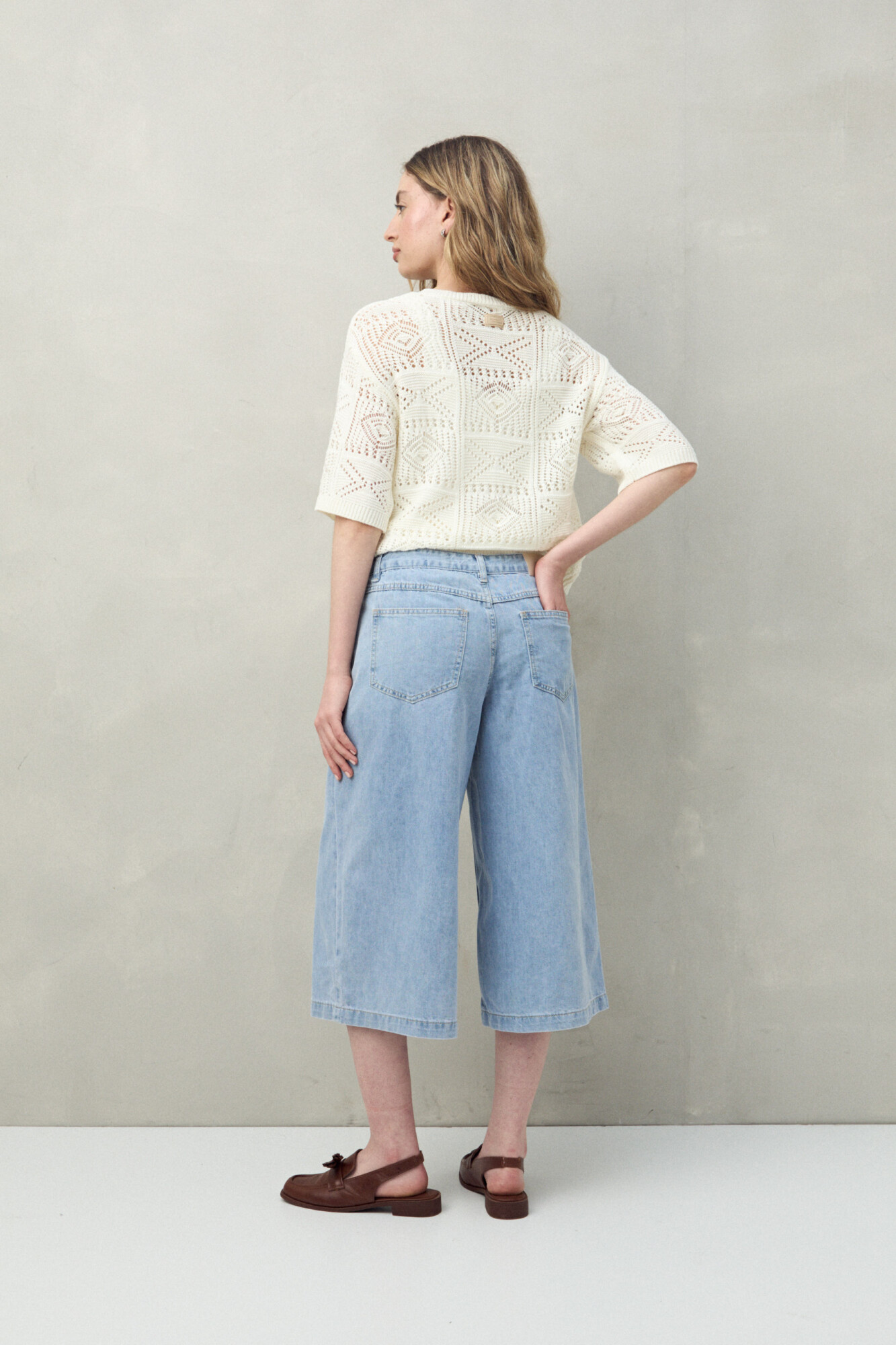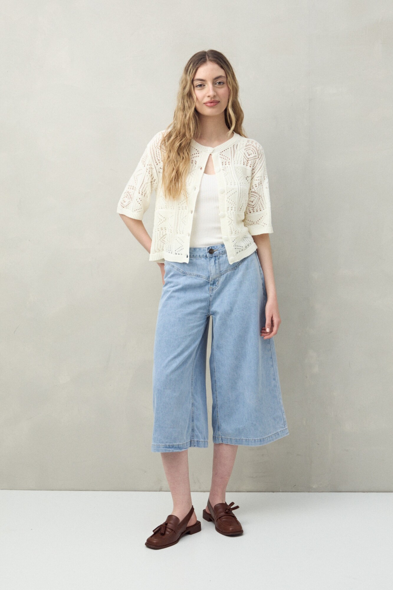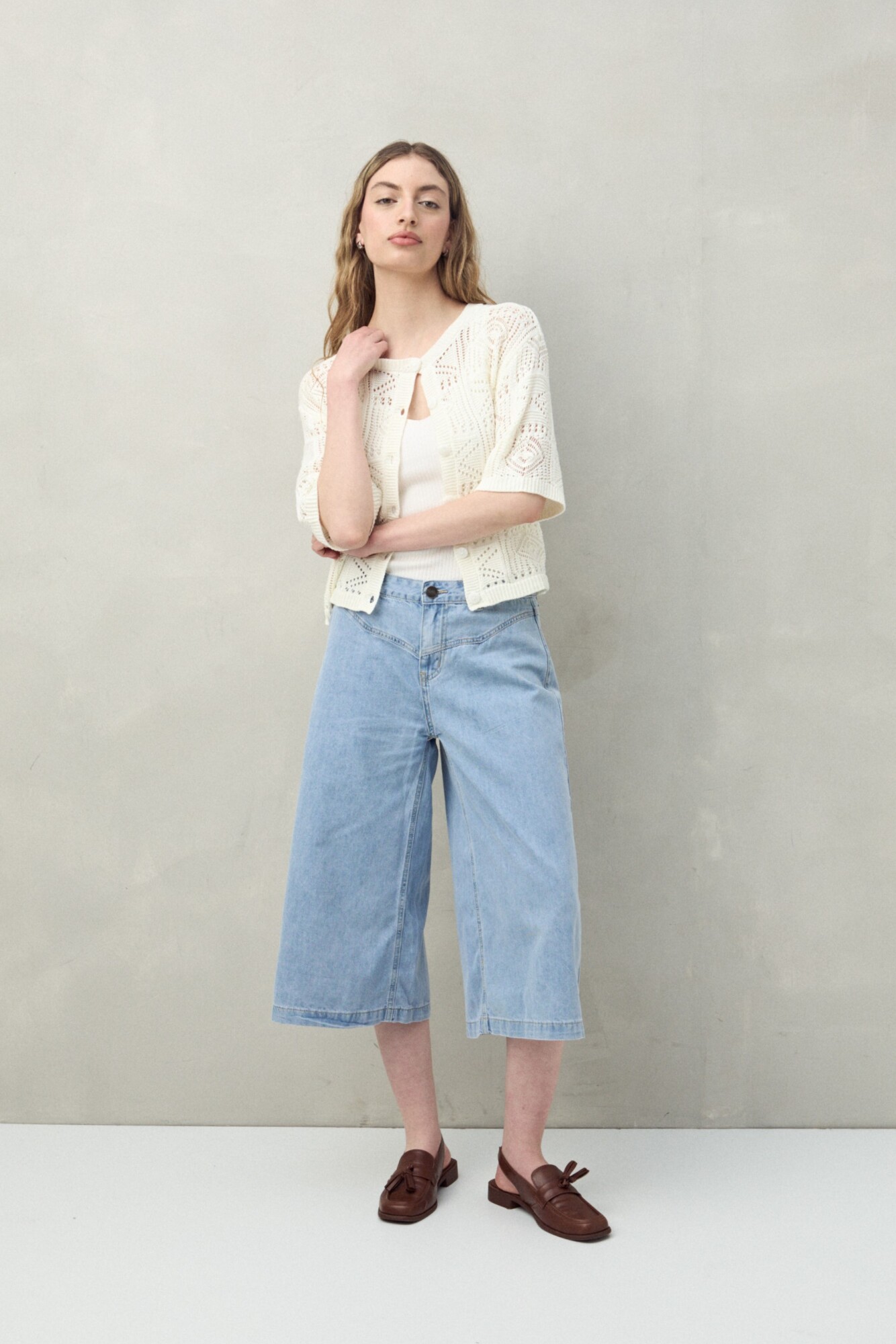 Culotte de denim con tiro medio y silueta amplia, ideal para sumar un toque canchero a tu vestidor. El largo por encima del tobillo y su estructura le dan ese carácter moderno que se adapta a múltiples estilos.