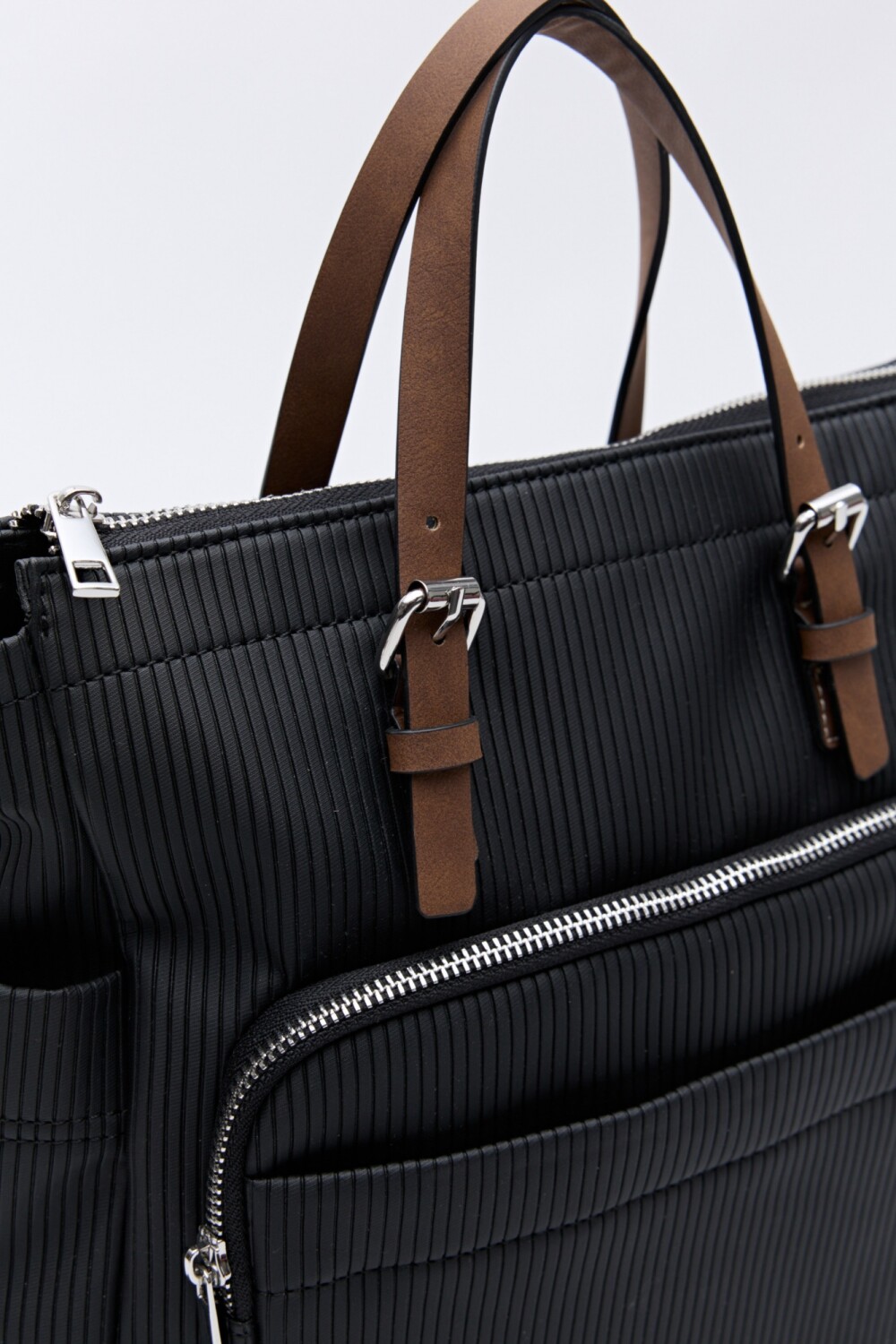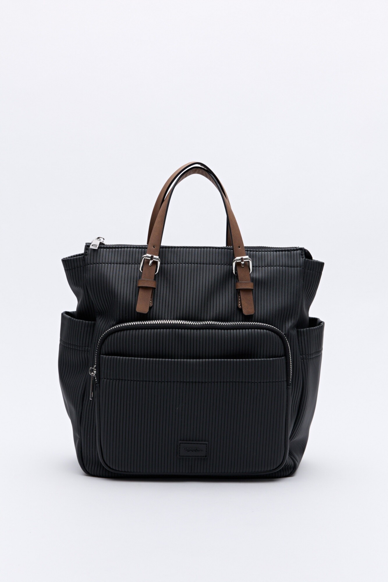 Mochila de poliéster texturizado con bolsillos funcionales que combina diseño y practicidad en una silueta urbana y versátil. Su superficie con textura acanalada aporta un detalle diferencial y contemporáneo, mientras que las asas superiores y las tiras regulables permiten llevarla tanto en la mano como en la espalda según la ocasión.