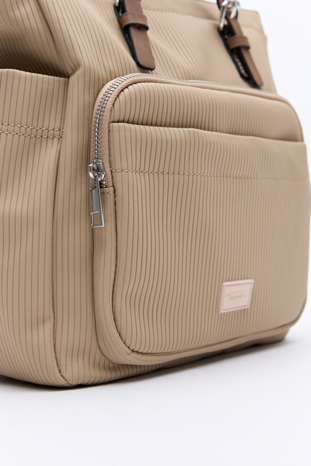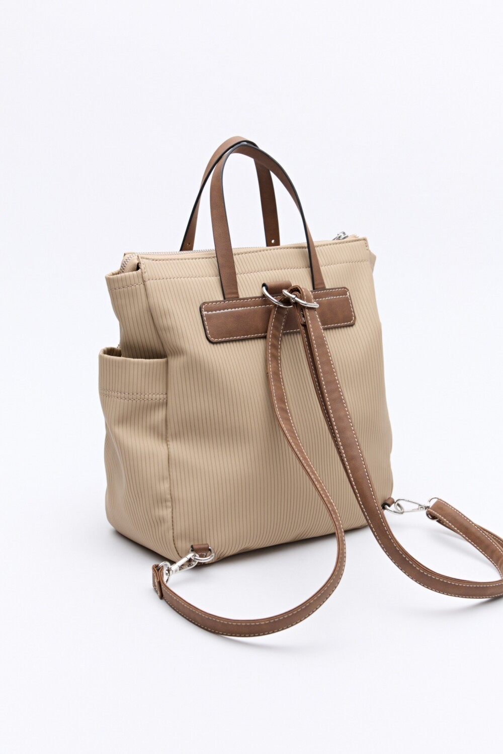 Mochila de poliéster texturizado con bolsillos funcionales que combina diseño y practicidad en una silueta urbana y versátil. Su superficie con textura acanalada aporta un detalle diferencial y contemporáneo, mientras que las asas superiores y las tiras regulables permiten llevarla tanto en la mano como en la espalda según la ocasión.