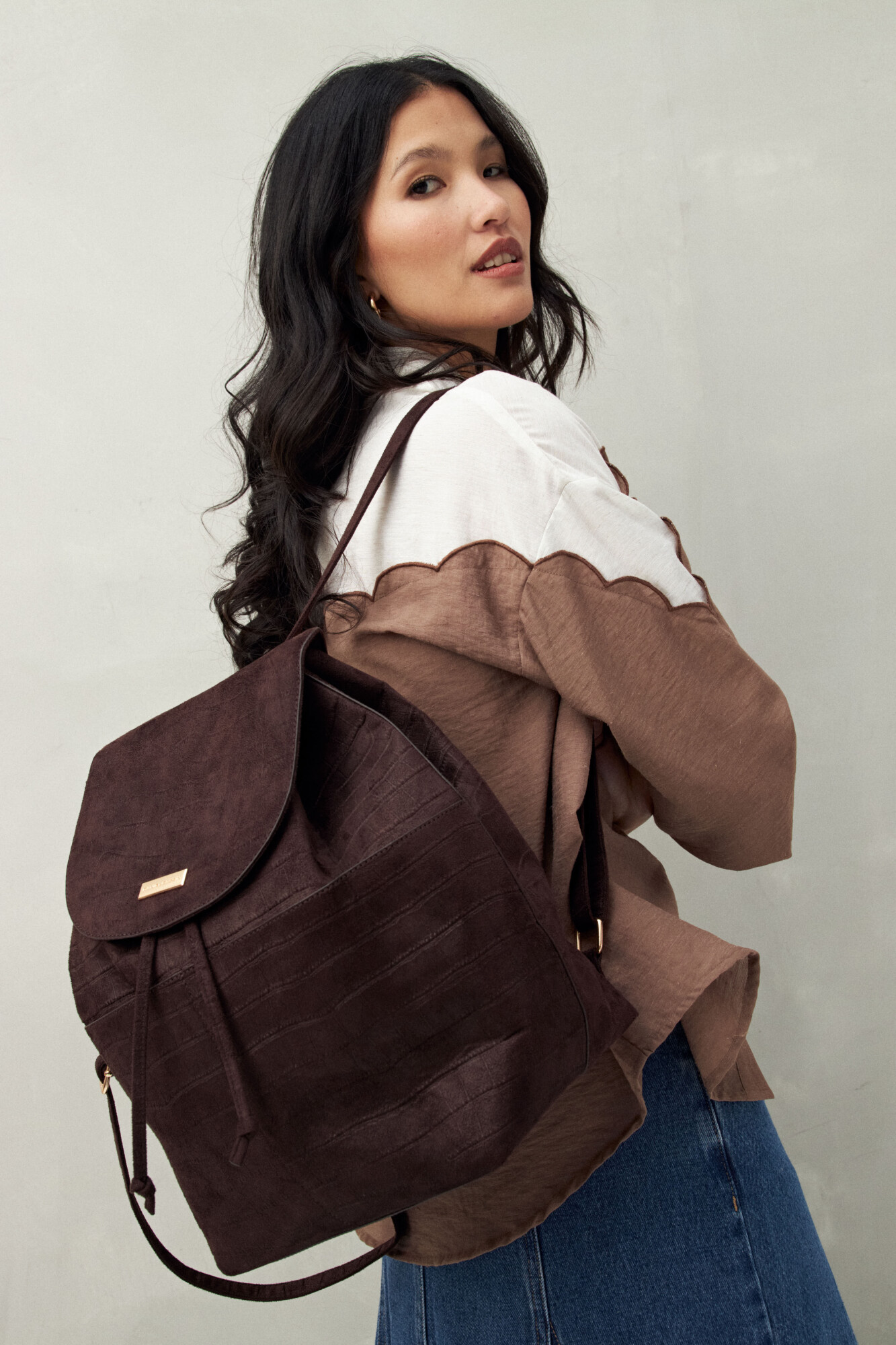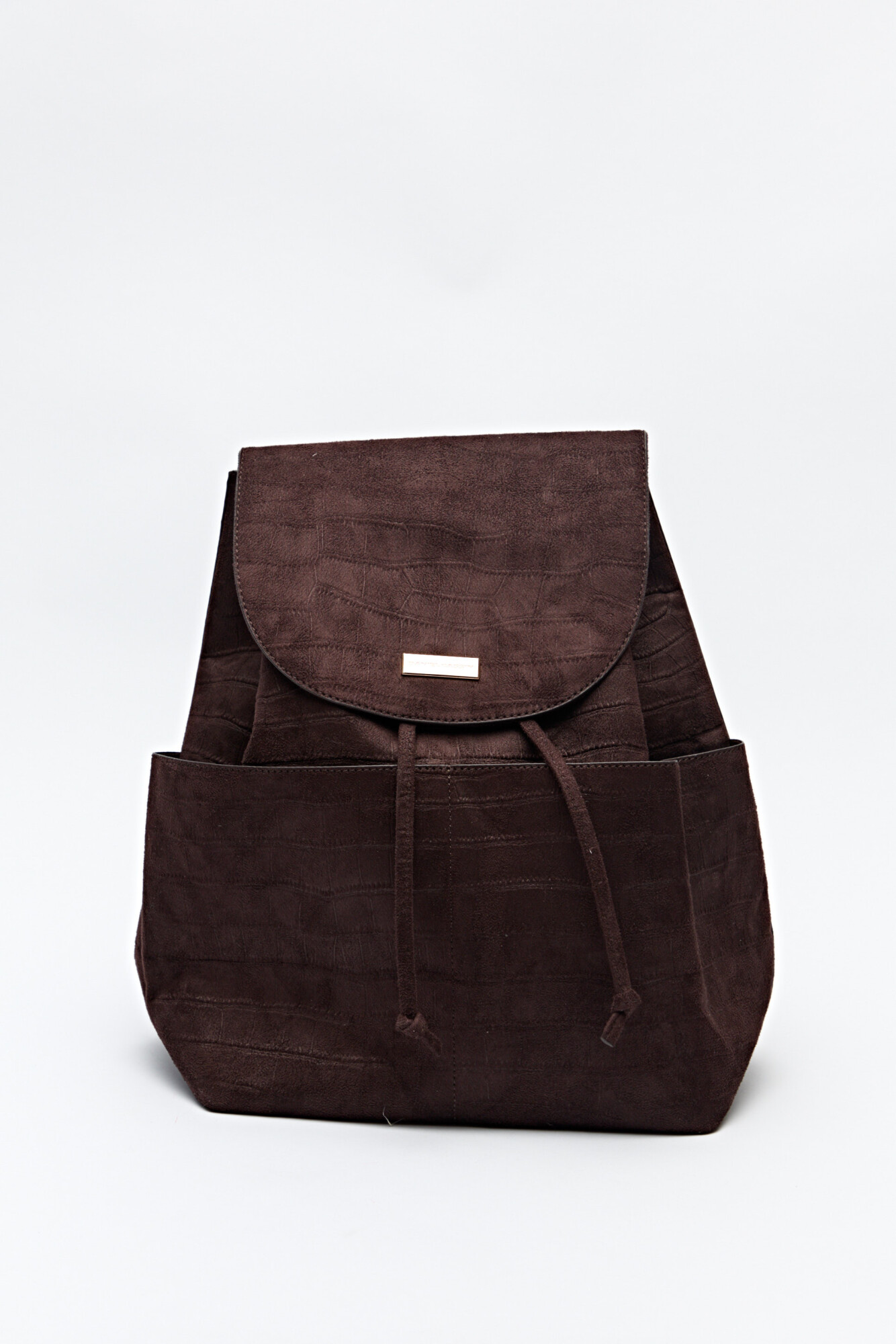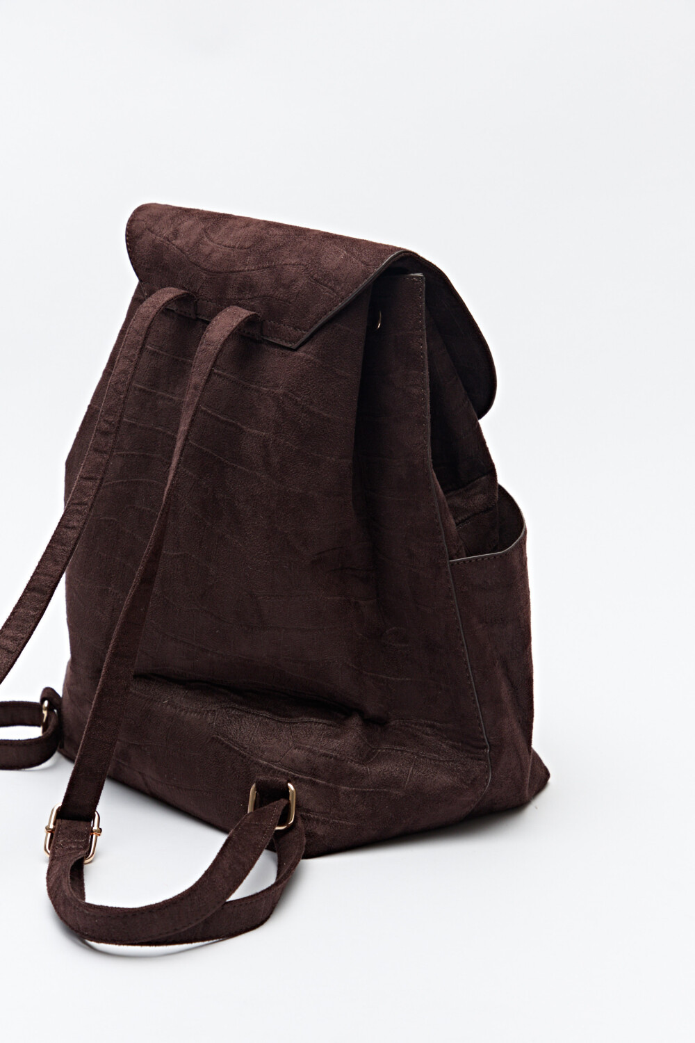 Esta mochila en símil gamuza aporta un toque sofisticado y versátil a cualquier look. Su diseño minimalista con solapa, cordón ajustable y bolsillos laterales la convierten en una pieza práctica sin perder estilo. El acabado texturizado tipo reptil le da un aire trendy y actual, ideal tanto para un look urbano como para complementar un outfit boho chic.