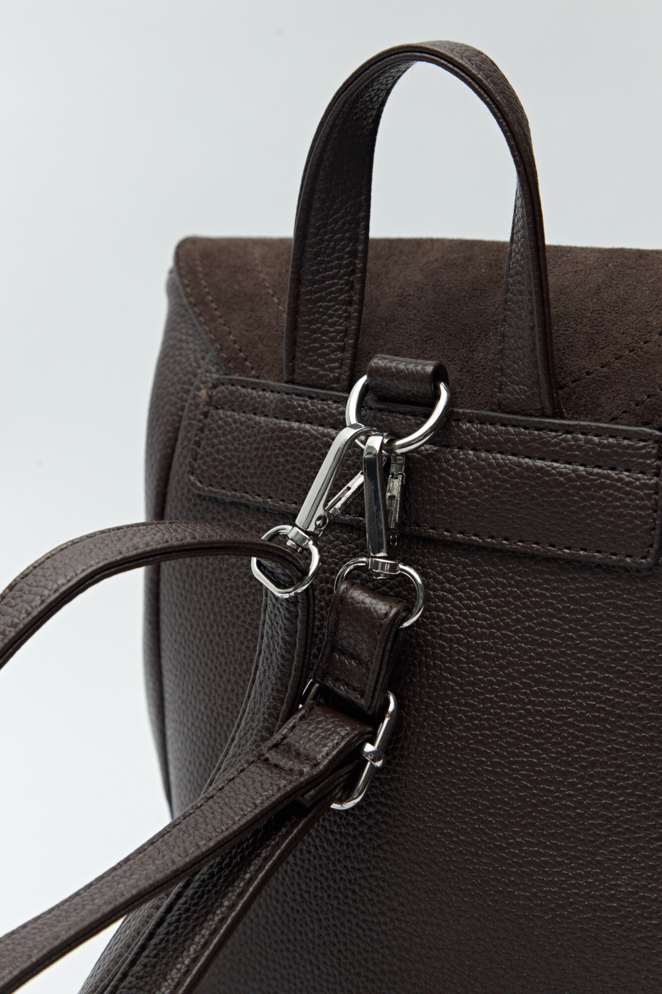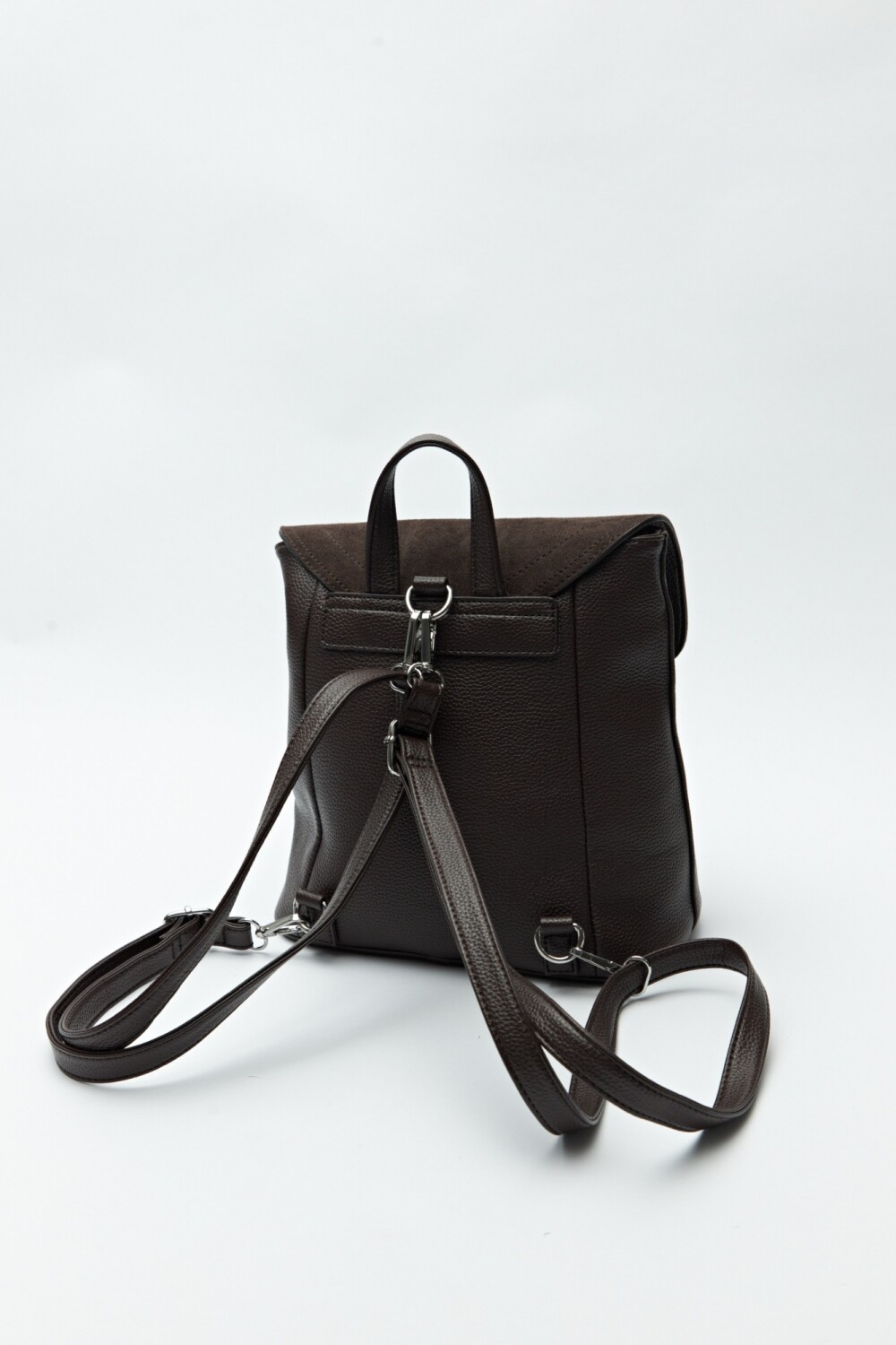 Mochila estructurada con frente en acabado gamuzado y cuerpo en símil cuero texturizado, un mix de materiales que suma contraste y estilo. De formato compacto y práctico, cuenta con asa superior y correas regulables que permiten usarla de distintas formas según el look. Es el accesorio trendy que eleva tanto conjuntos casuales como outfits más sofisticados, aportando un aire urbano moderno.