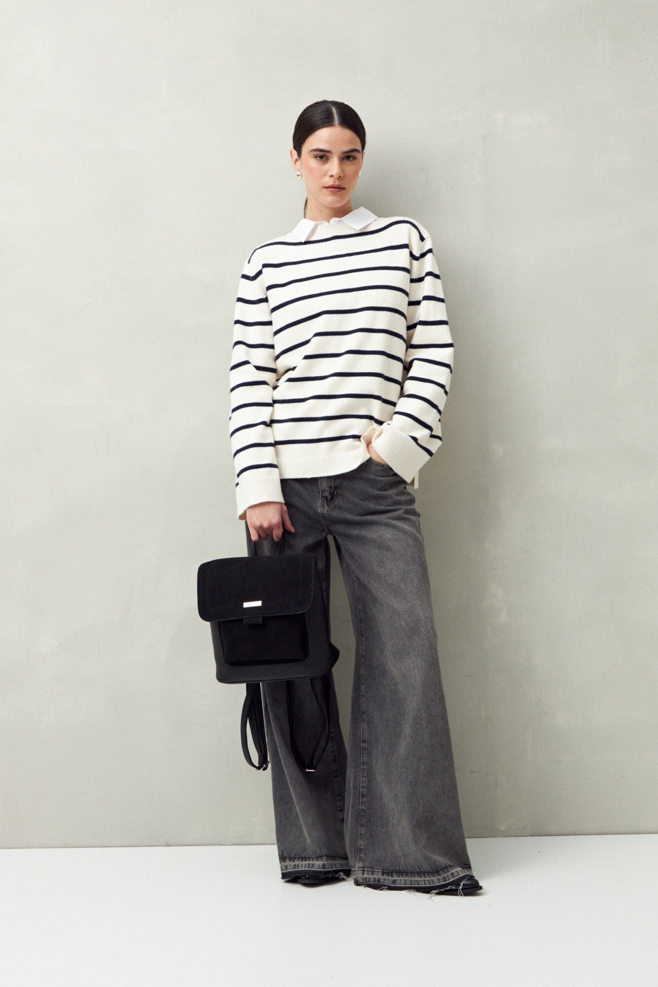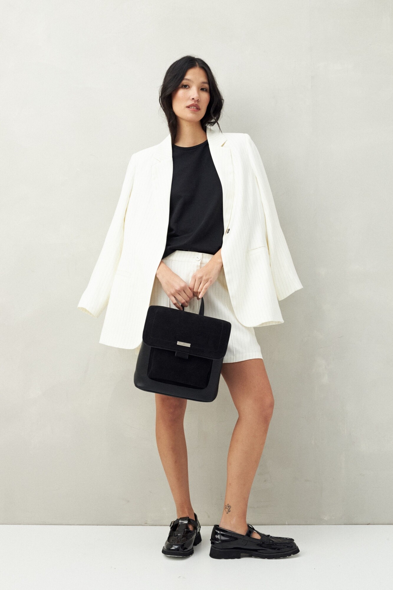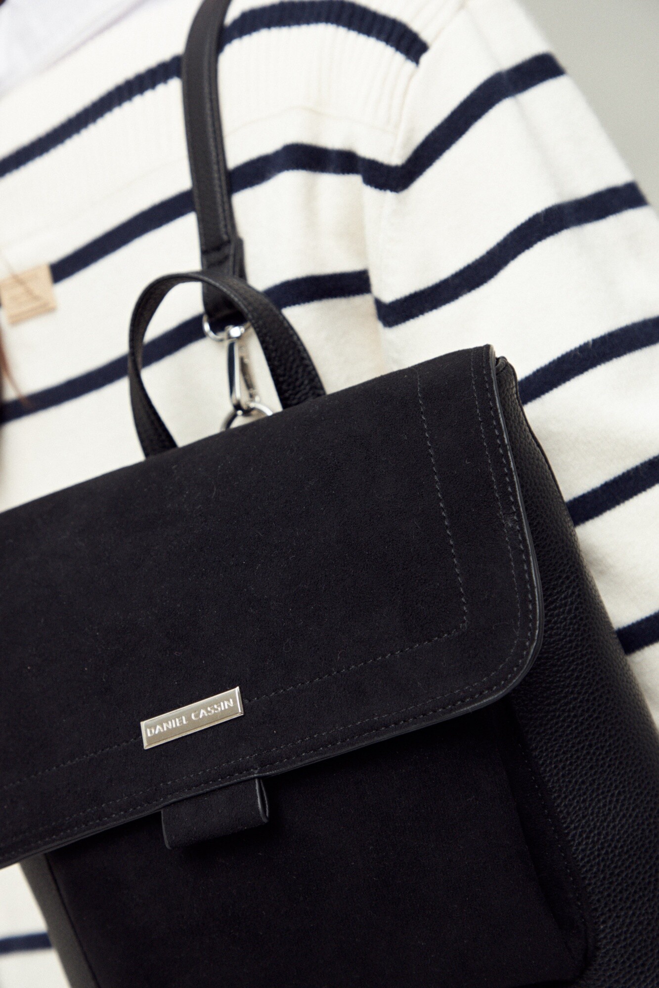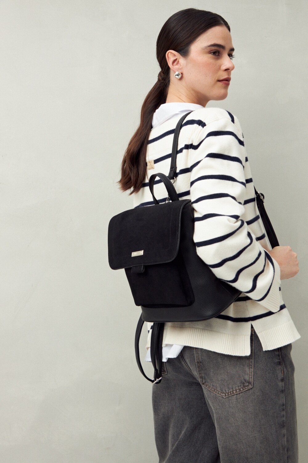 Mochila estructurada con frente en acabado gamuzado y cuerpo en símil cuero texturizado, un mix de materiales que suma contraste y estilo. De formato compacto y práctico, cuenta con asa superior y correas regulables que permiten usarla de distintas formas según el look. Es el accesorio trendy que eleva tanto conjuntos casuales como outfits más sofisticados, aportando un aire urbano moderno.
