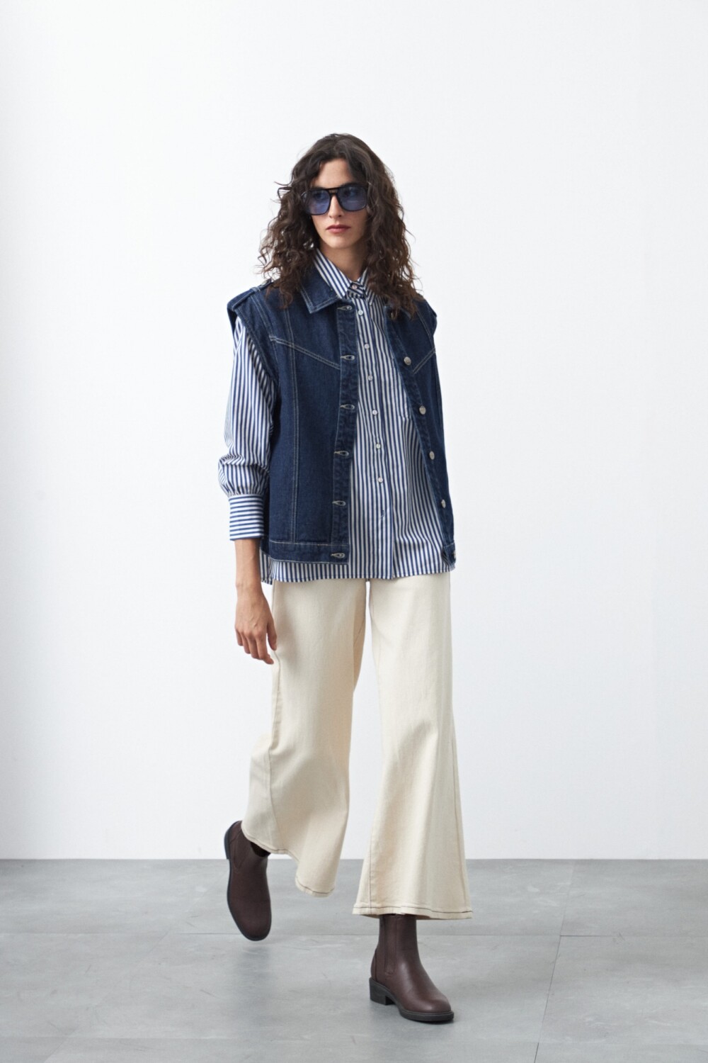 Pantalón wide leg de algodón con elastano, de calce amplio y caída recta que estiliza la silueta. El diseño de tiro alto realza la cintura y equilibra el volumen de la pierna, logrando un look moderno y relajado a la vez. Con pespuntes a contratono, aporta comodidad sin perder estilo.