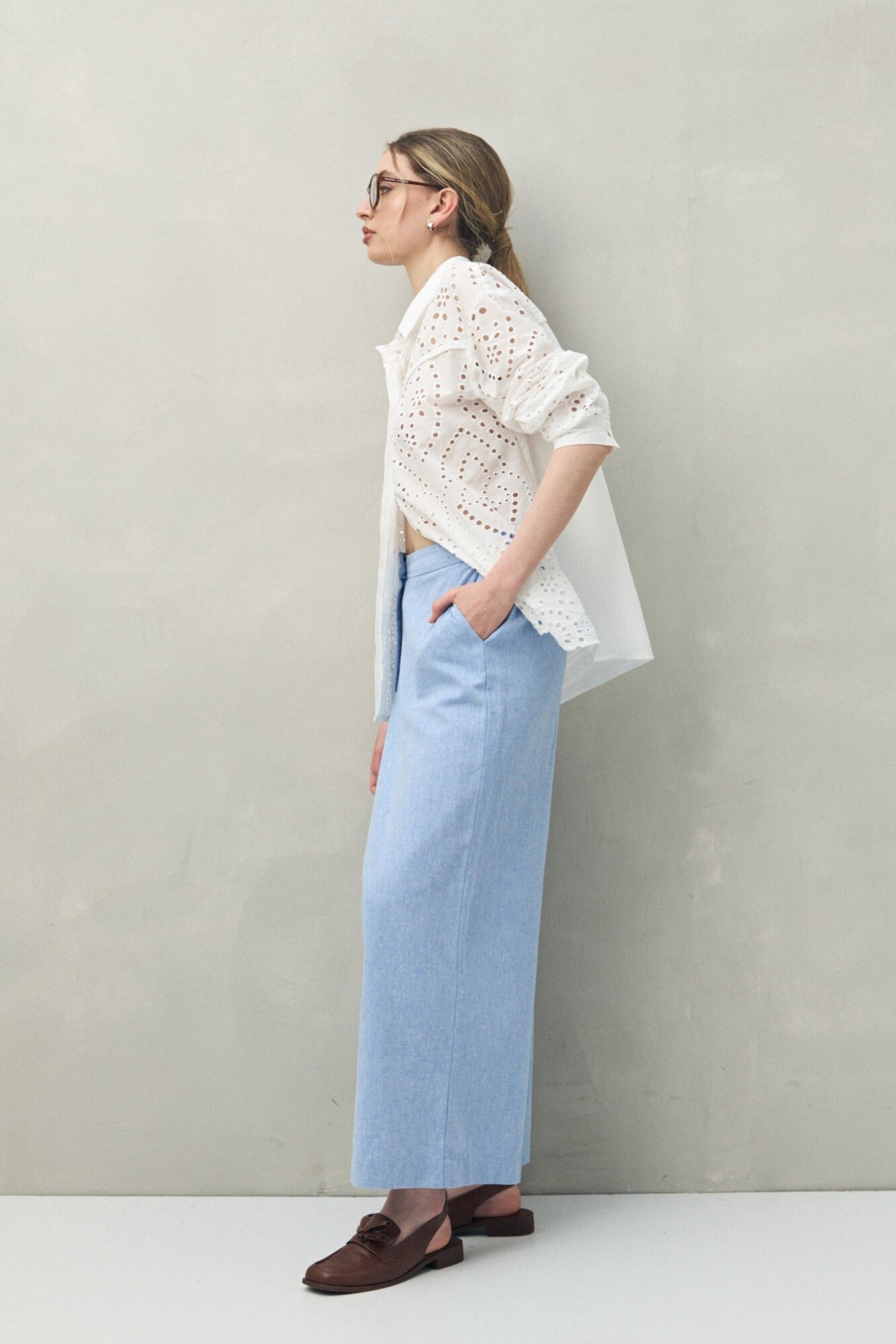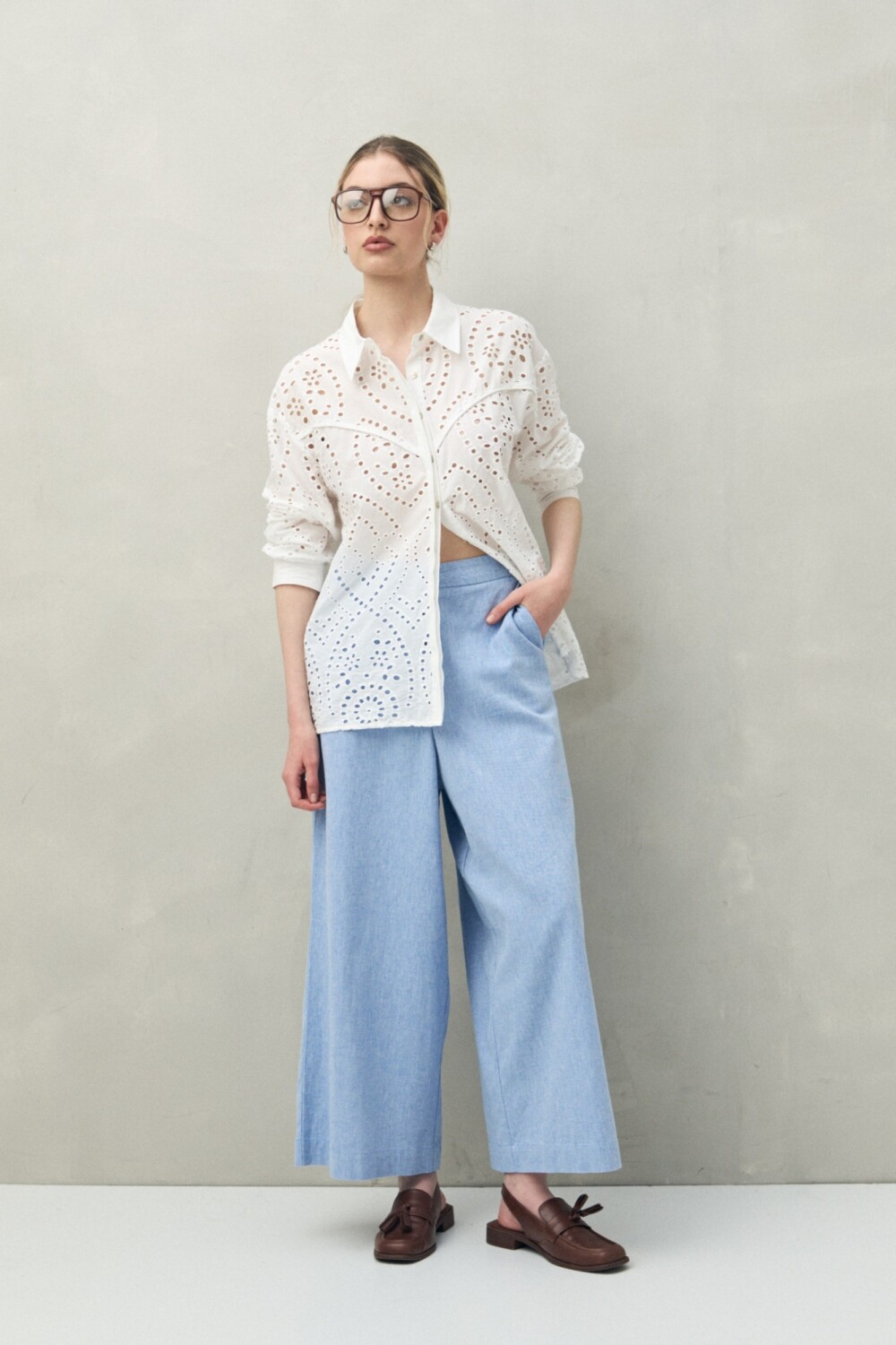 Pantalón de corte amplio confeccionado en mezcla de lino y viscosa, una combinación que aporta frescura, caída fluida y un tacto natural. Su diseño de cintura media con elástico en la espalda ofrece comodidad sin perder estilo. Ideal para looks relajados de verano o para elevar un outfit casual con camisas o tops ligeros.