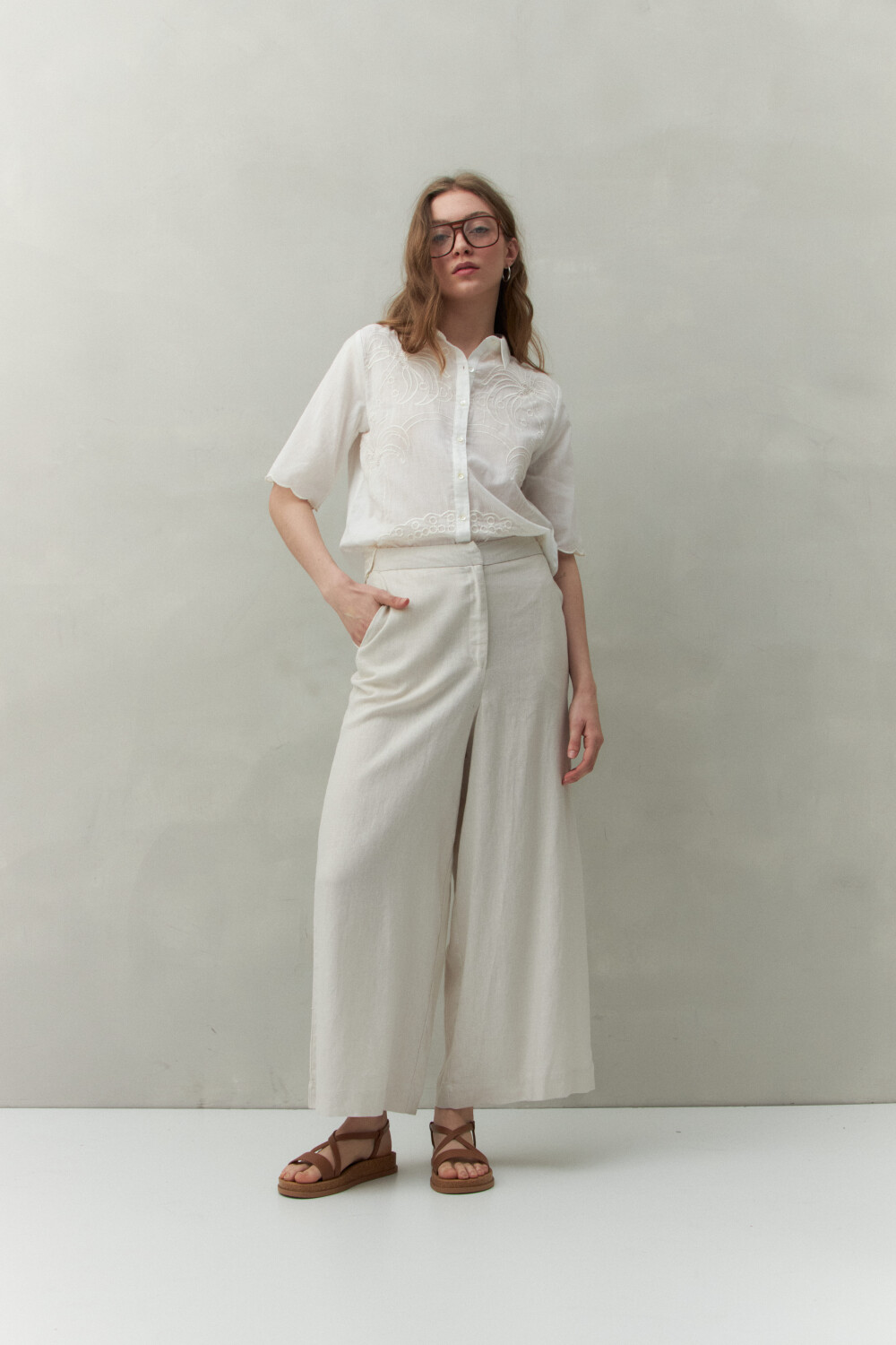 Pantalón de corte amplio confeccionado en mezcla de lino y viscosa, una combinación que aporta frescura, caída fluida y un tacto natural. Su diseño de cintura media con elástico en la espalda ofrece comodidad sin perder estilo. Ideal para looks relajados de verano o para elevar un outfit casual con camisas o tops ligeros.