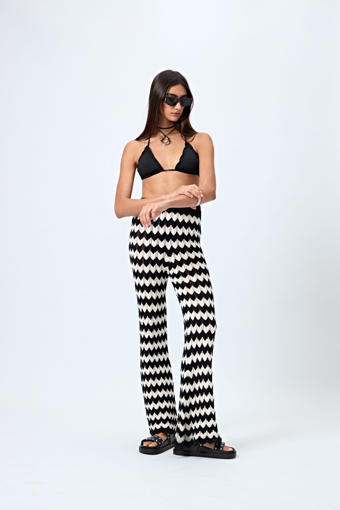 Pantalón tejido con motivo zigzag y silueta flare. Su textura artesanal y cintura elastizada lo convierten en una pieza clave para looks relajados de verano. Perfecto para usar sobre bikinis o combinar con tops de punto, aportando un aire boho chic al look.