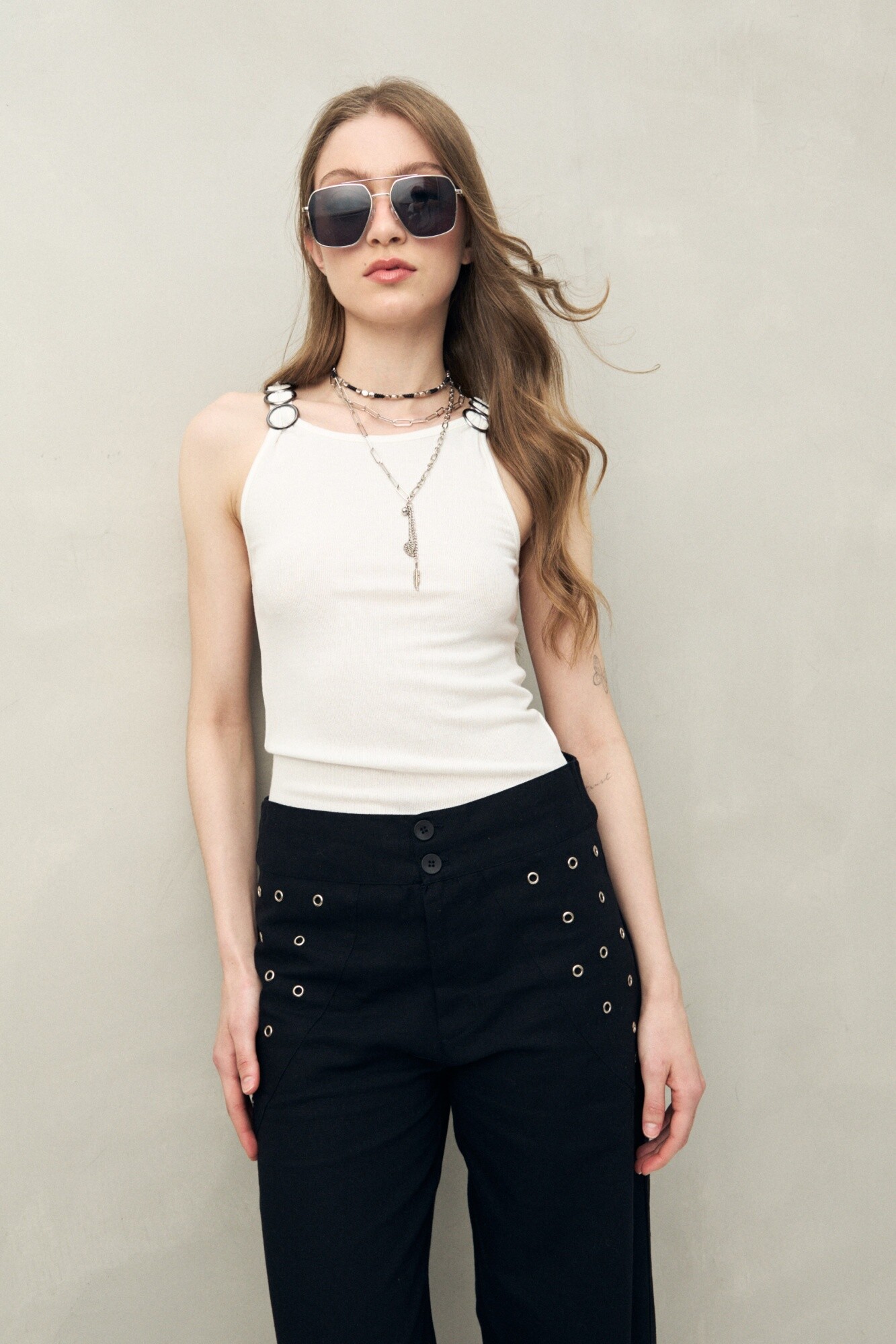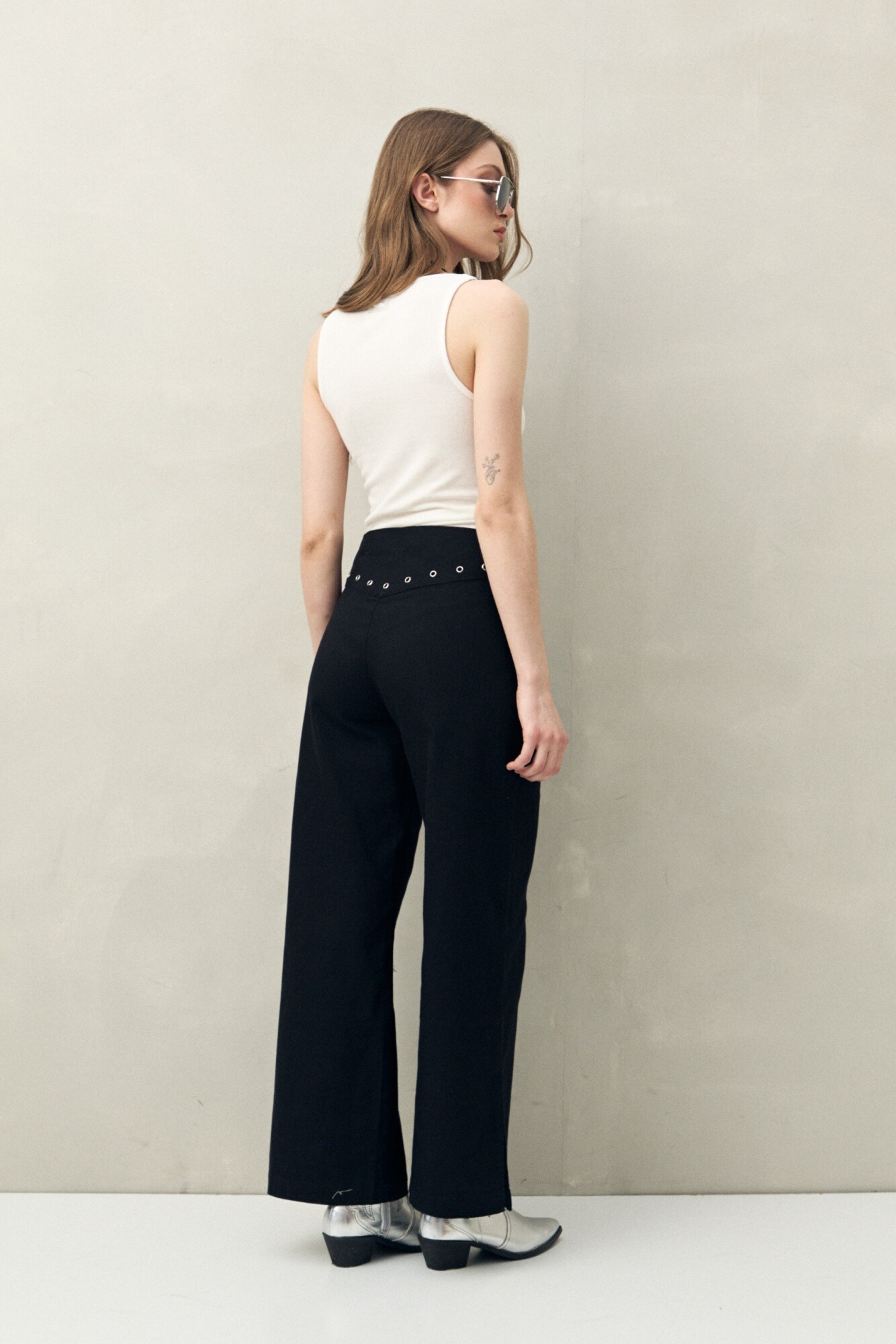 Pantalón de tiro medio confeccionado en algodón con detalle de ojalillos metálicos en los laterales, que aportan un guiño contemporáneo y urbano. Su silueta amplia y estructura firme lo convierten en una opción cómoda y versátil para looks diarios con carácter.