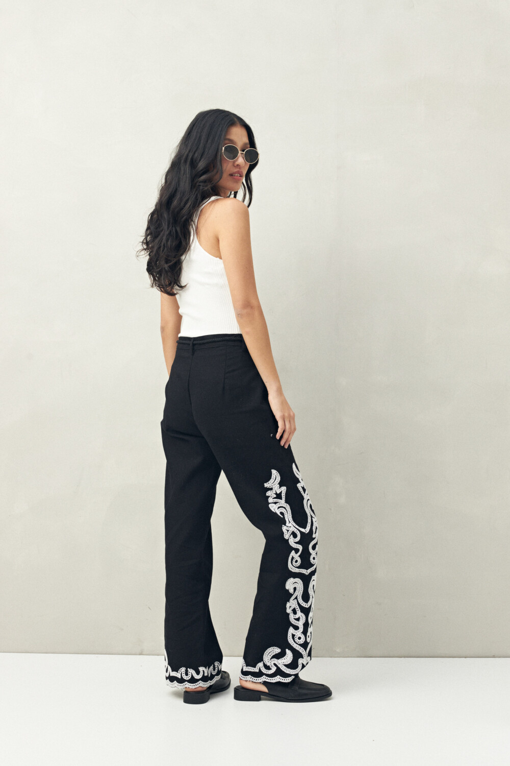 Pantalón recto de algodón con bordado artesanal a contratono en los laterales y ruedo. Su caída fluida y los detalles bordados le aportan un aire bohemio y relajado, ideal para combinar con tops livianos o camisas sueltas en looks de espíritu libre.