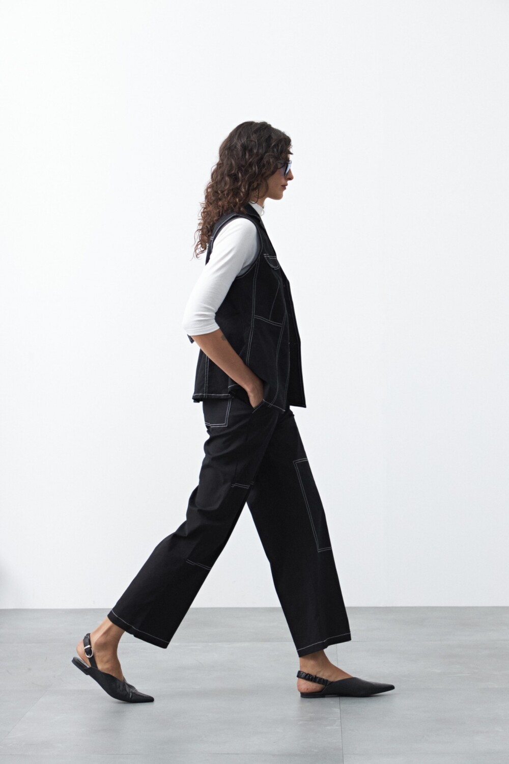Confeccionado en algodón con elastano, aporta firmeza y al mismo tiempo libertad de movimiento. Los pespuntes marcados y los recortes delanteros suman carácter y un guiño utilitario que lo convierte en una pieza con personalidad propia.