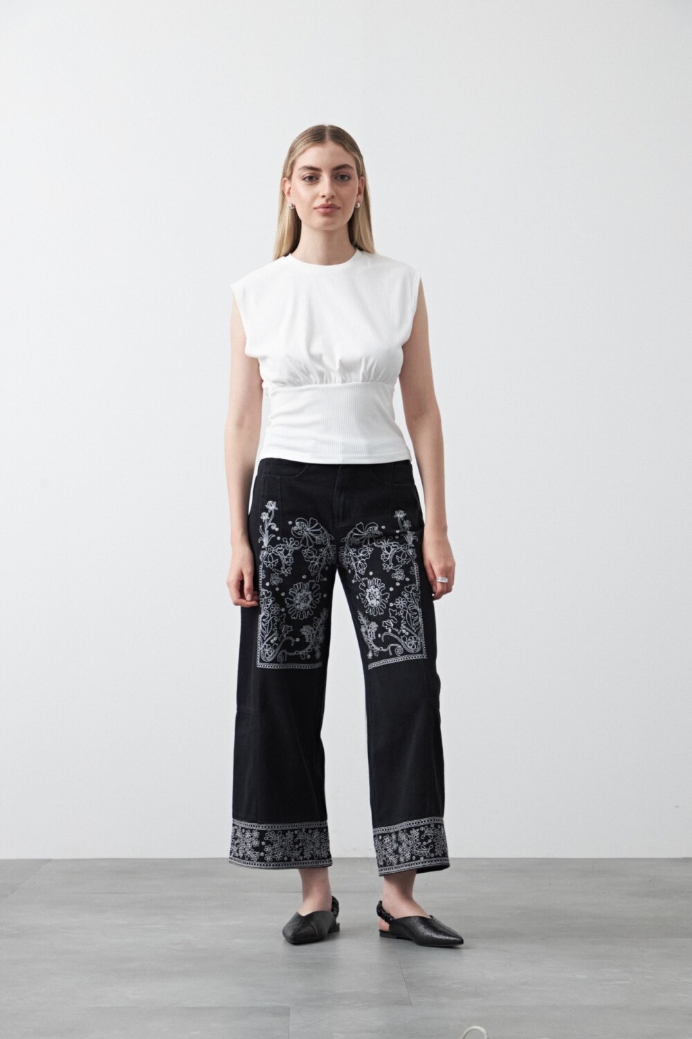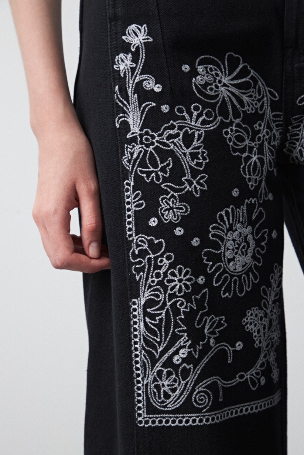 Pantalón de denim con bordado floral aplicado que aporta un detalle artesanal y distintivo. Presenta silueta recta con pierna amplia y largo al tobillo, logrando un equilibrio entre comodidad y diseño. La cintura media y la estructura del denim aseguran un calce prolijo, mientras que los bordados en delantero y botamanga suman carácter y lo convierten en una pieza protagonista, clave para elevar cualquier look sin esfuerzo.