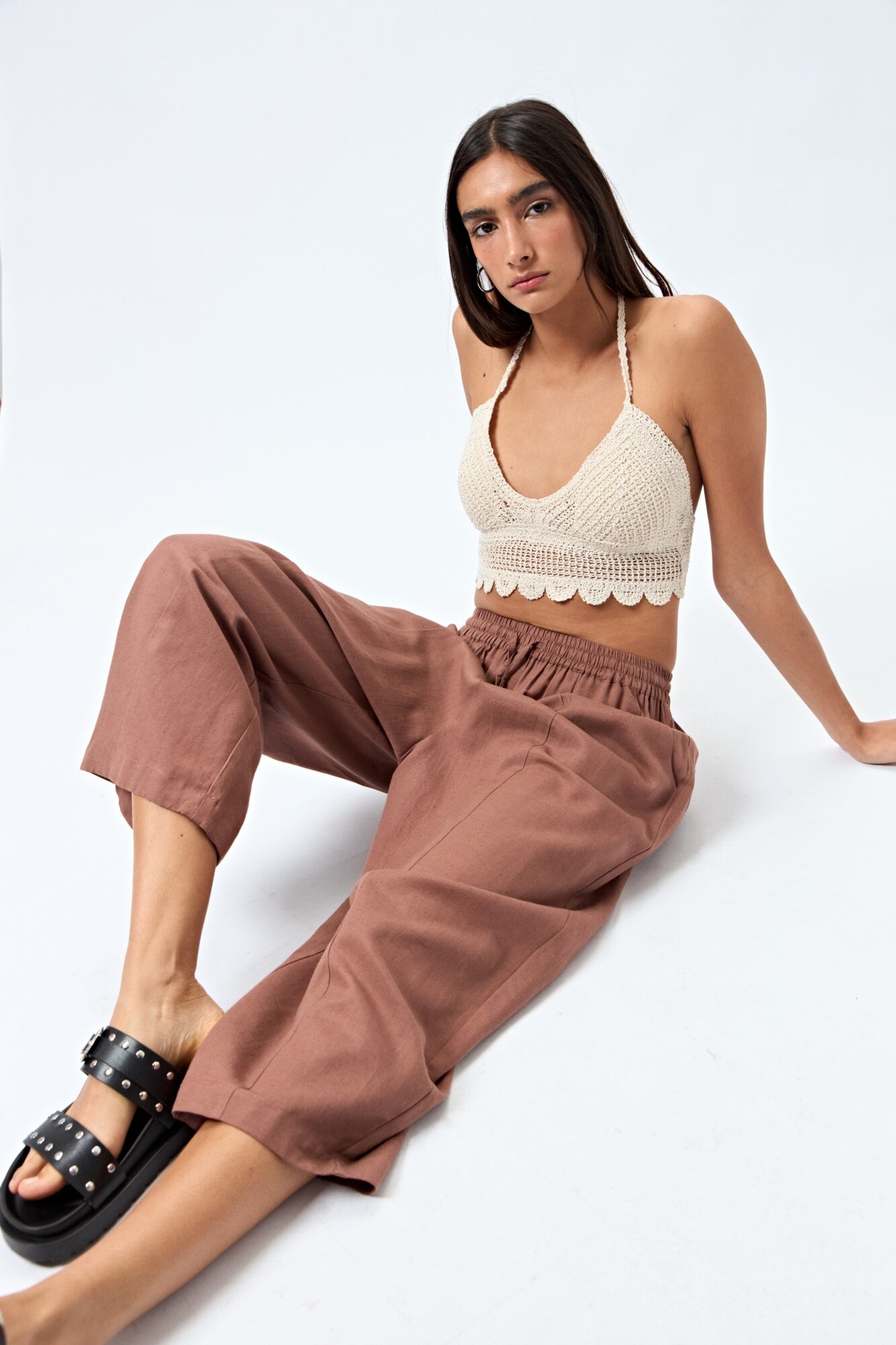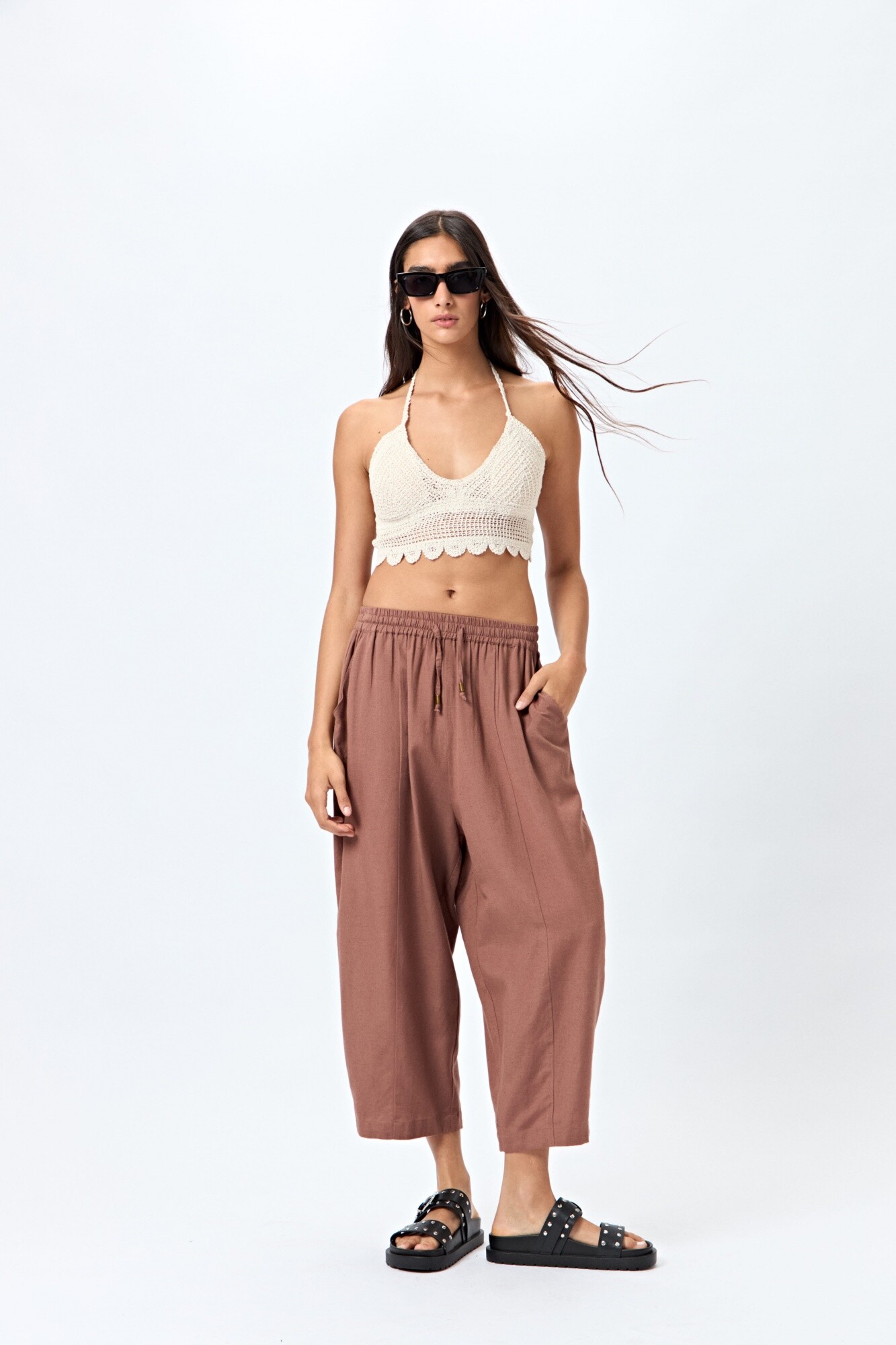 Pantalón tipo baggy de calce relajado, con cintura elástica y cordón ajustable. Confeccionado en una mezcla liviana de viscosa y lino, brinda frescura y movimiento natural. Los bolsillos laterales y traseros aportan practicidad, convirtiéndolo en un infaltable para looks de verano cómodos y con estilo.