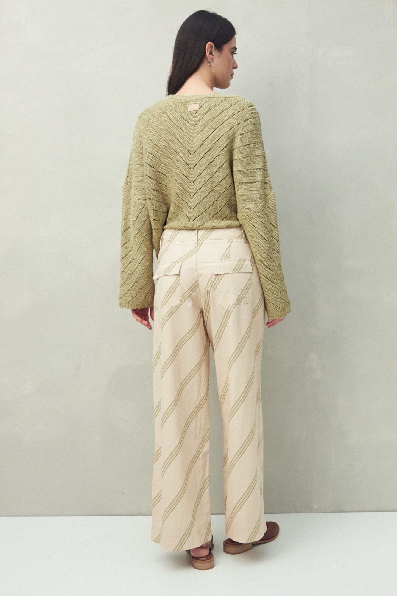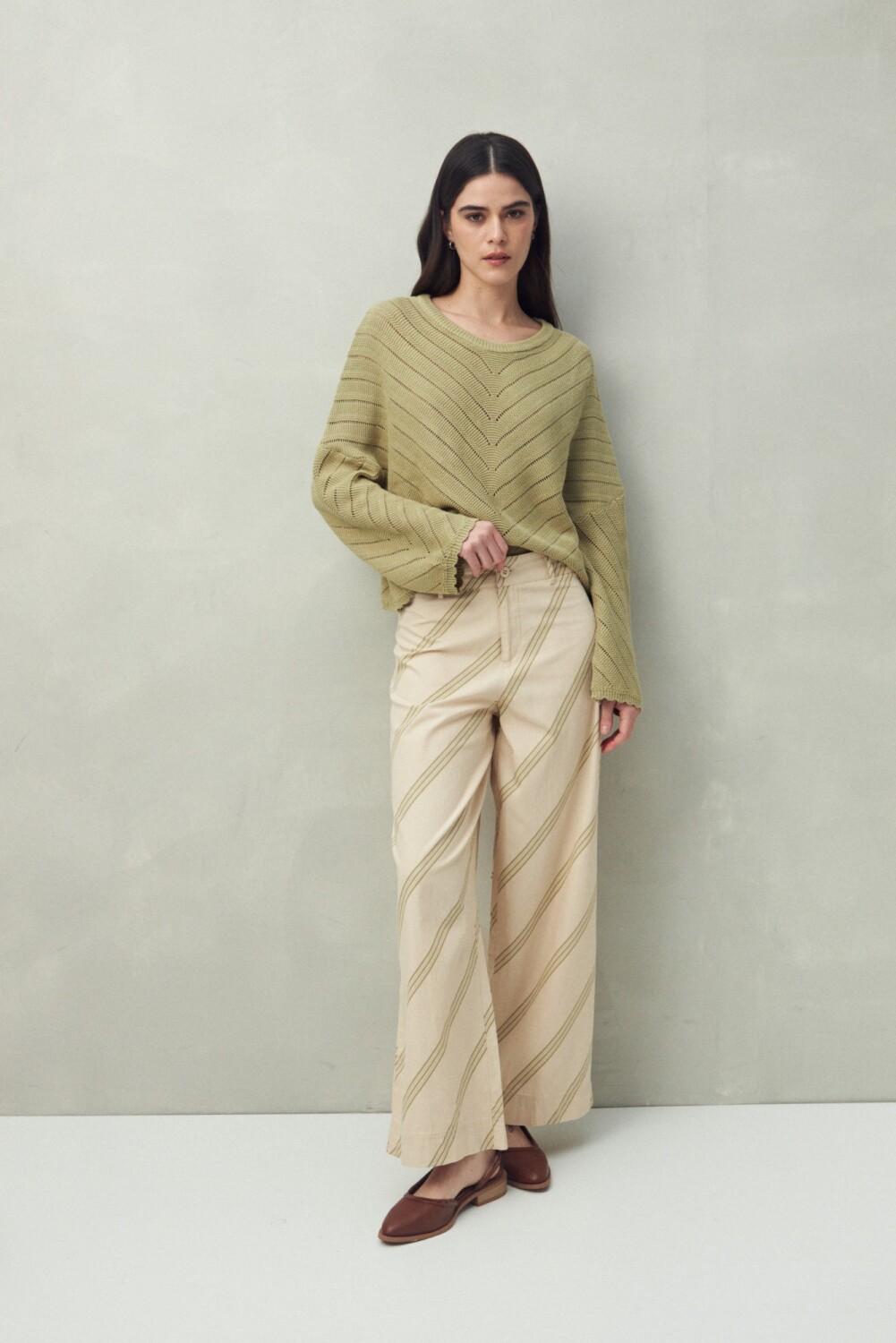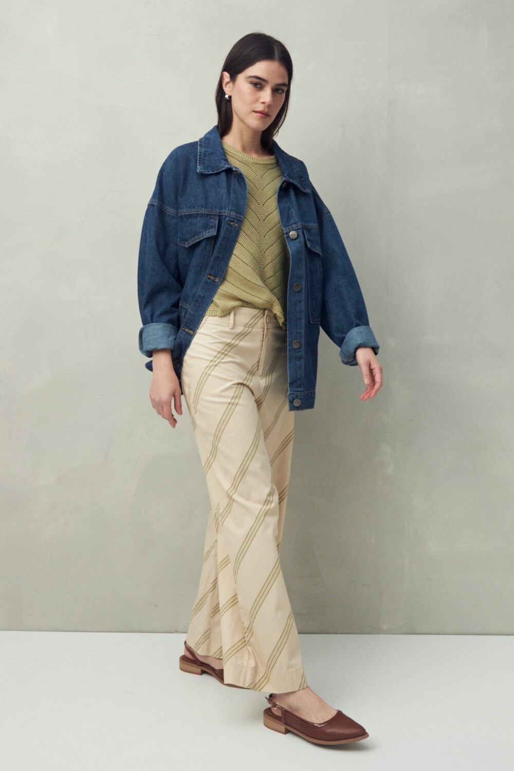 Pantalón ancho de algodón con fit relajado y bolsillos de parche, ideal para sumar comodidad y frescura a tu look. Disponible en diferentes estampas, desde rayas diagonales que estilizan la silueta hasta motivos botánicos que aportan un aire veraniego y canchero. Una prenda versátil y trendy, pensada para destacar tanto en un outfit urbano como en combinaciones más descontracturadas.