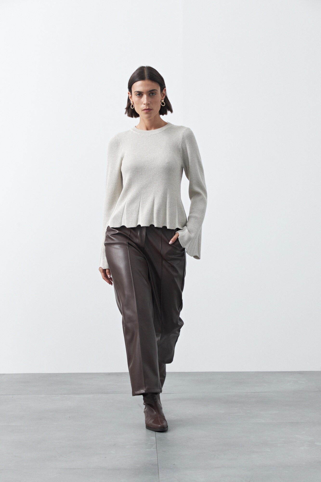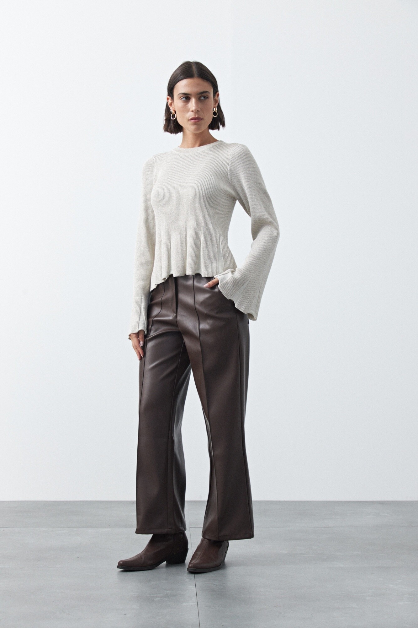 Pantalón ancho en símil cuero de silueta recta y caída estructurada que aporta un look moderno y sofisticado. Su diseño de pierna amplia estiliza y suma presencia, mientras el acabado símil cuero lo convierte en una prenda clave para elevar cualquier outfit. Ideal para combinar con tejidos suaves o básicos y lograr un contraste de texturas en tendencia.