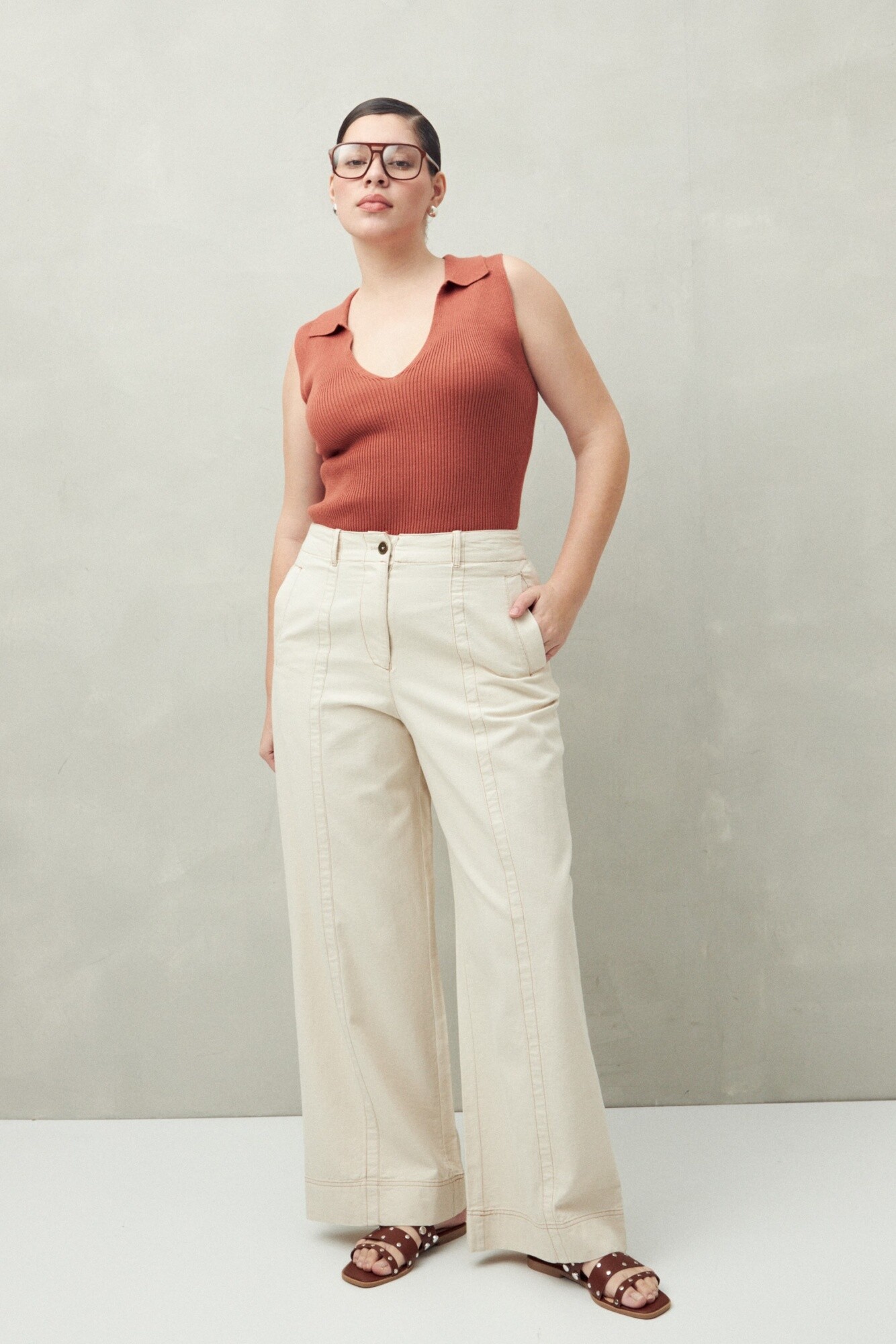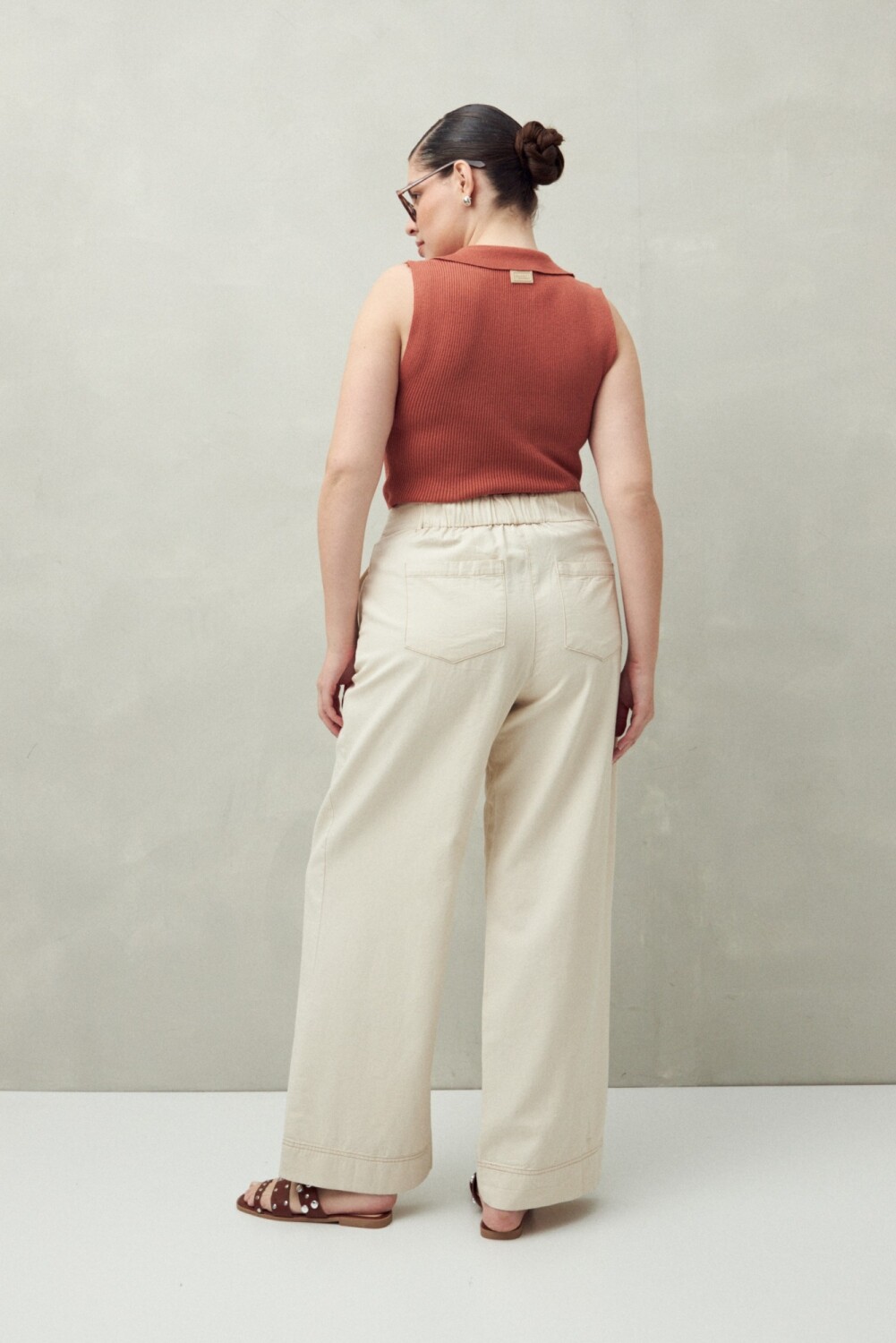 Pantalón ancho de tiro alto, confeccionado en 100% algodón, pensado para darle estructura y frescura a tus outfits. Su calce amplio estiliza y aporta comodidad, mientras que las costuras visibles al frente le suman un guiño moderno que realza la silueta. Una prenda versátil que se adapta tanto a looks relajados de día como a combinaciones más urbanas y cancheras.