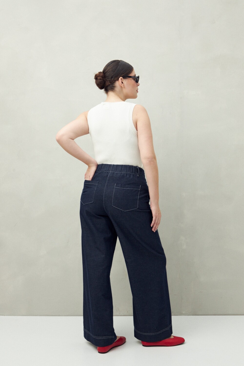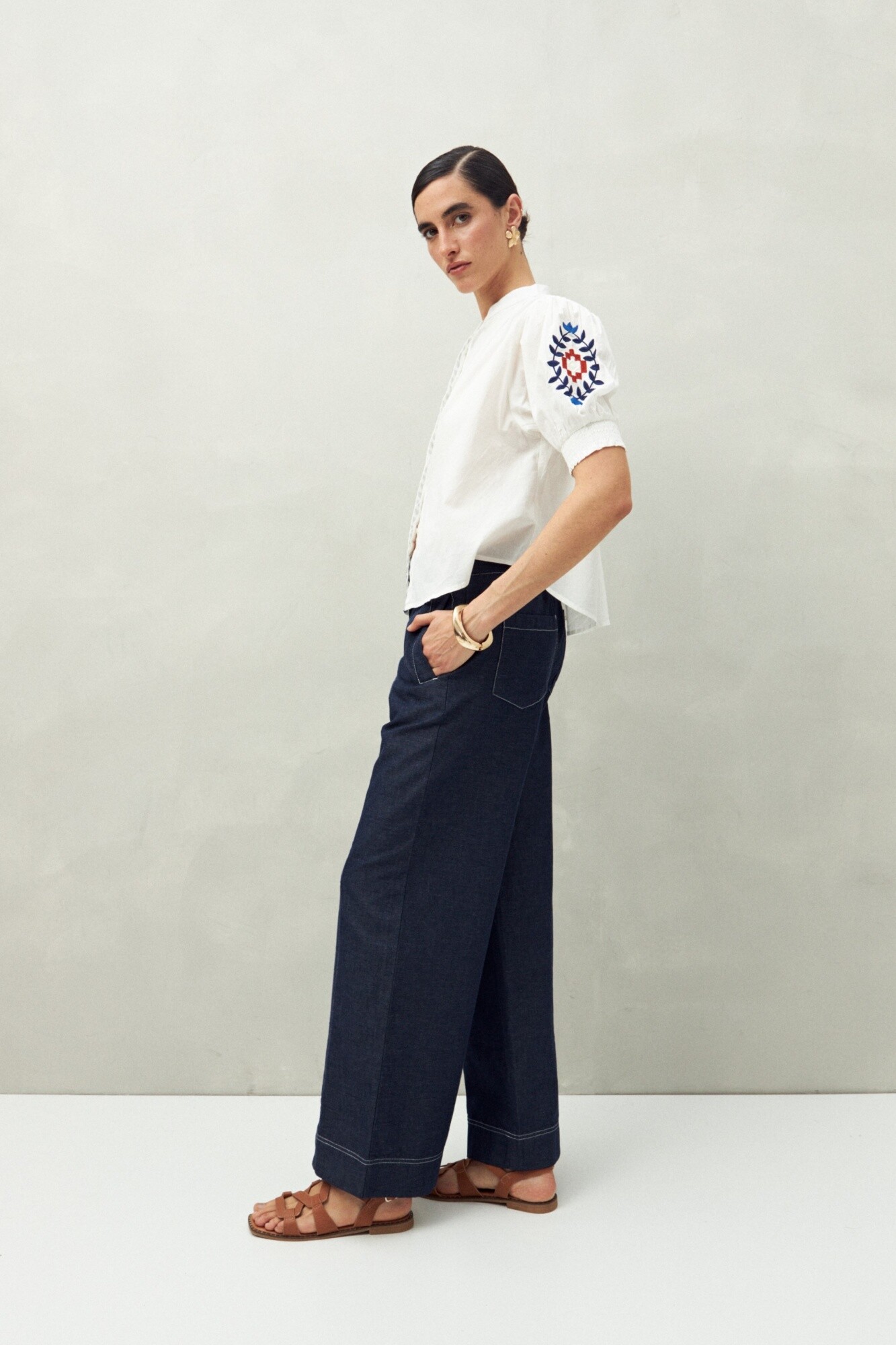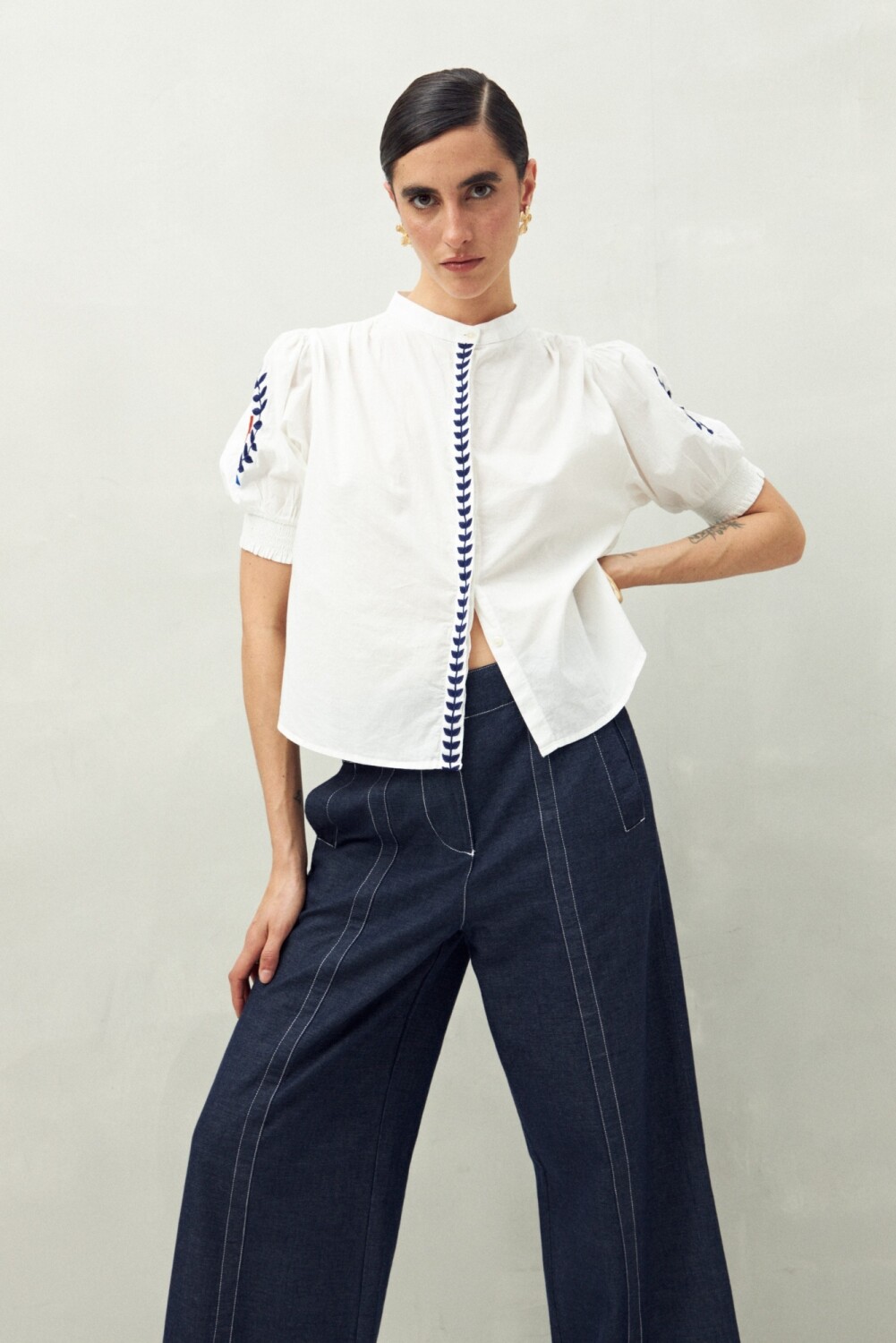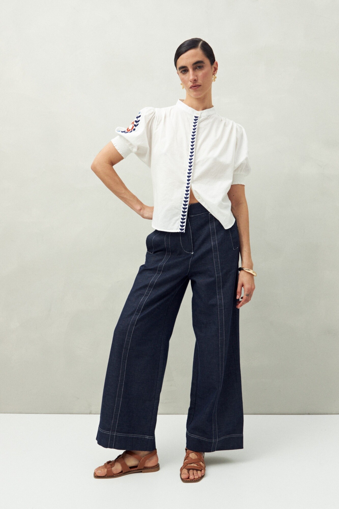 Pantalón ancho de tiro alto, confeccionado en 100% algodón, pensado para darle estructura y frescura a tus outfits. Su calce amplio estiliza y aporta comodidad, mientras que las costuras visibles al frente le suman un guiño moderno que realza la silueta. Una prenda versátil que se adapta tanto a looks relajados de día como a combinaciones más urbanas y cancheras.