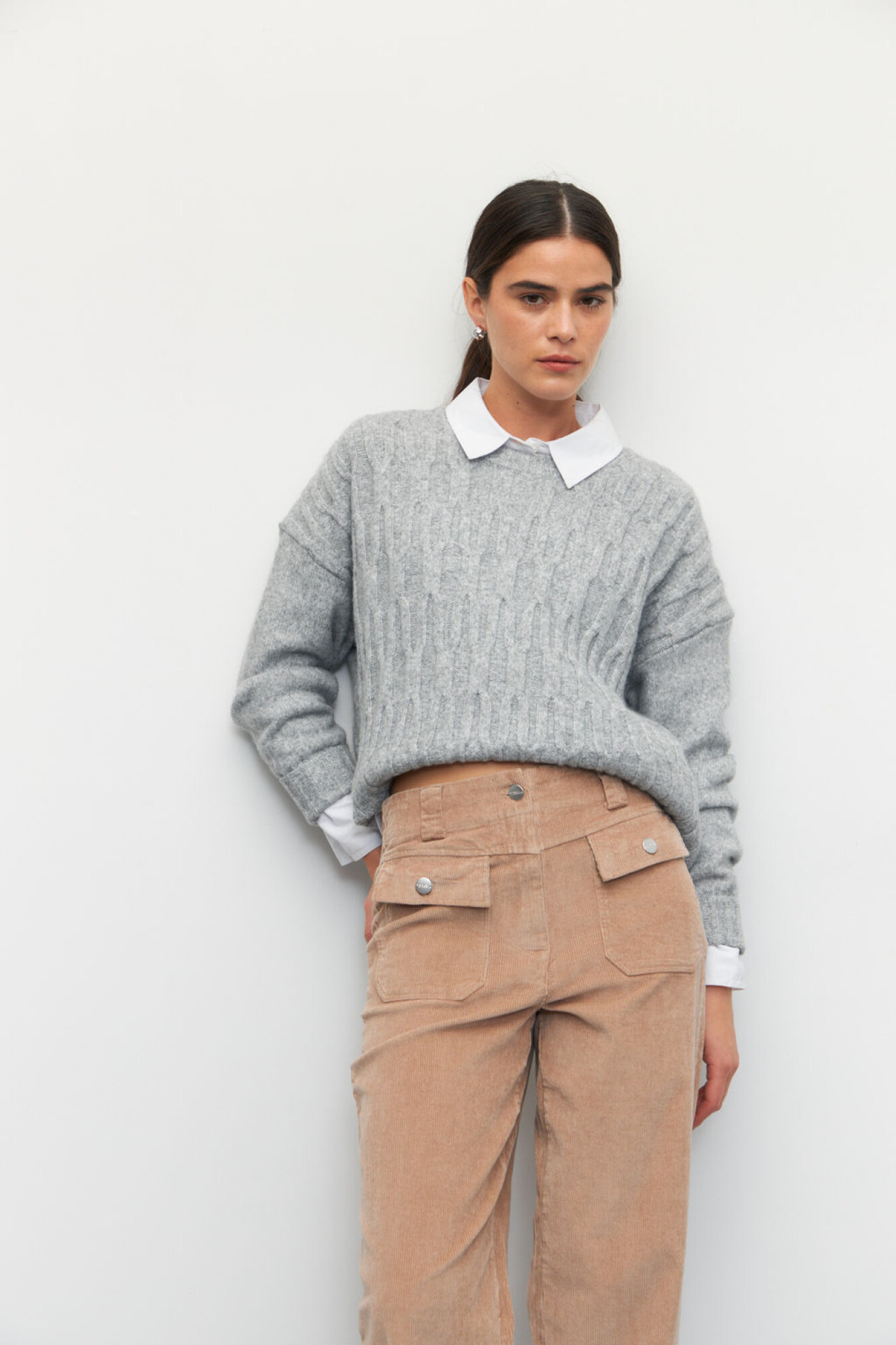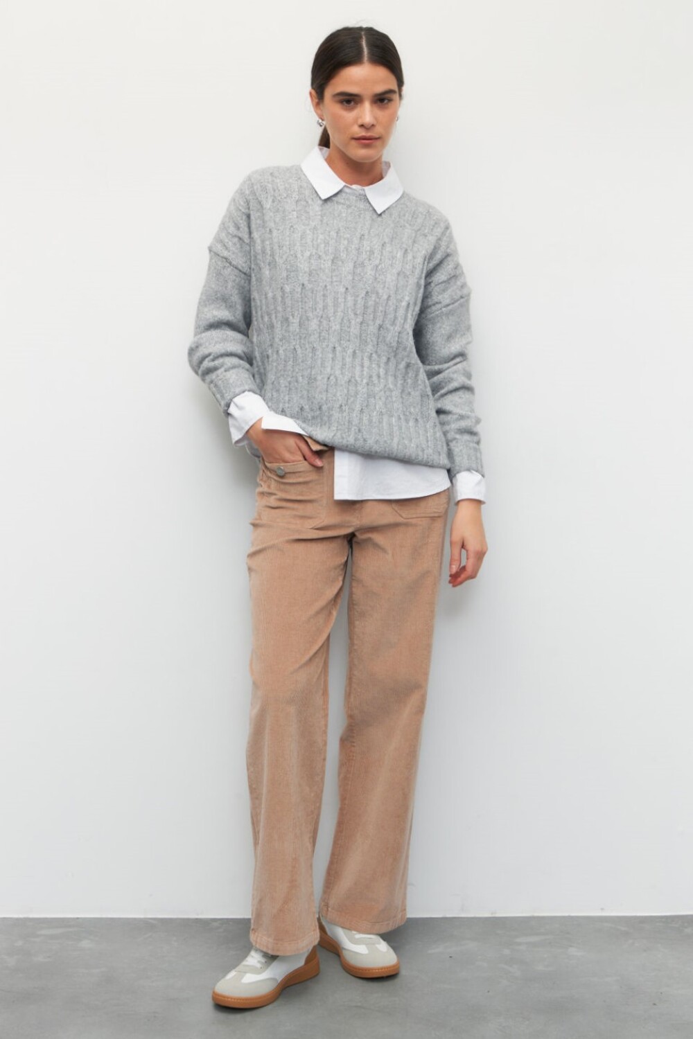 Pantalón de pana de tiro alto y fit recto. Cuenta con cuatro bolsillos, los delanteros con solapa y botón metálico.